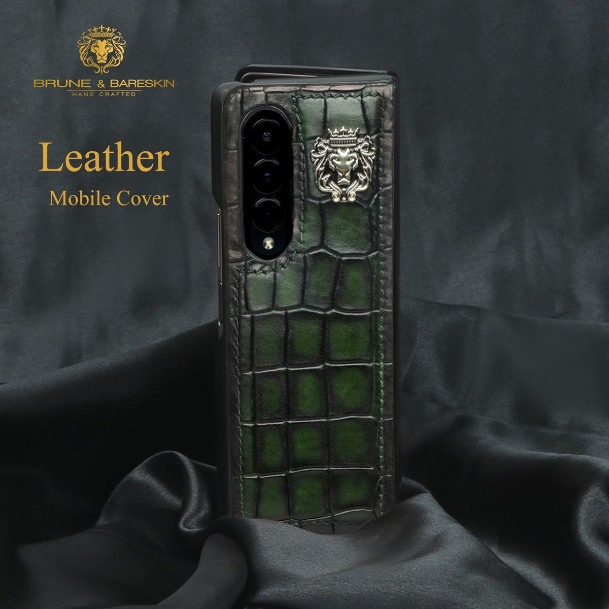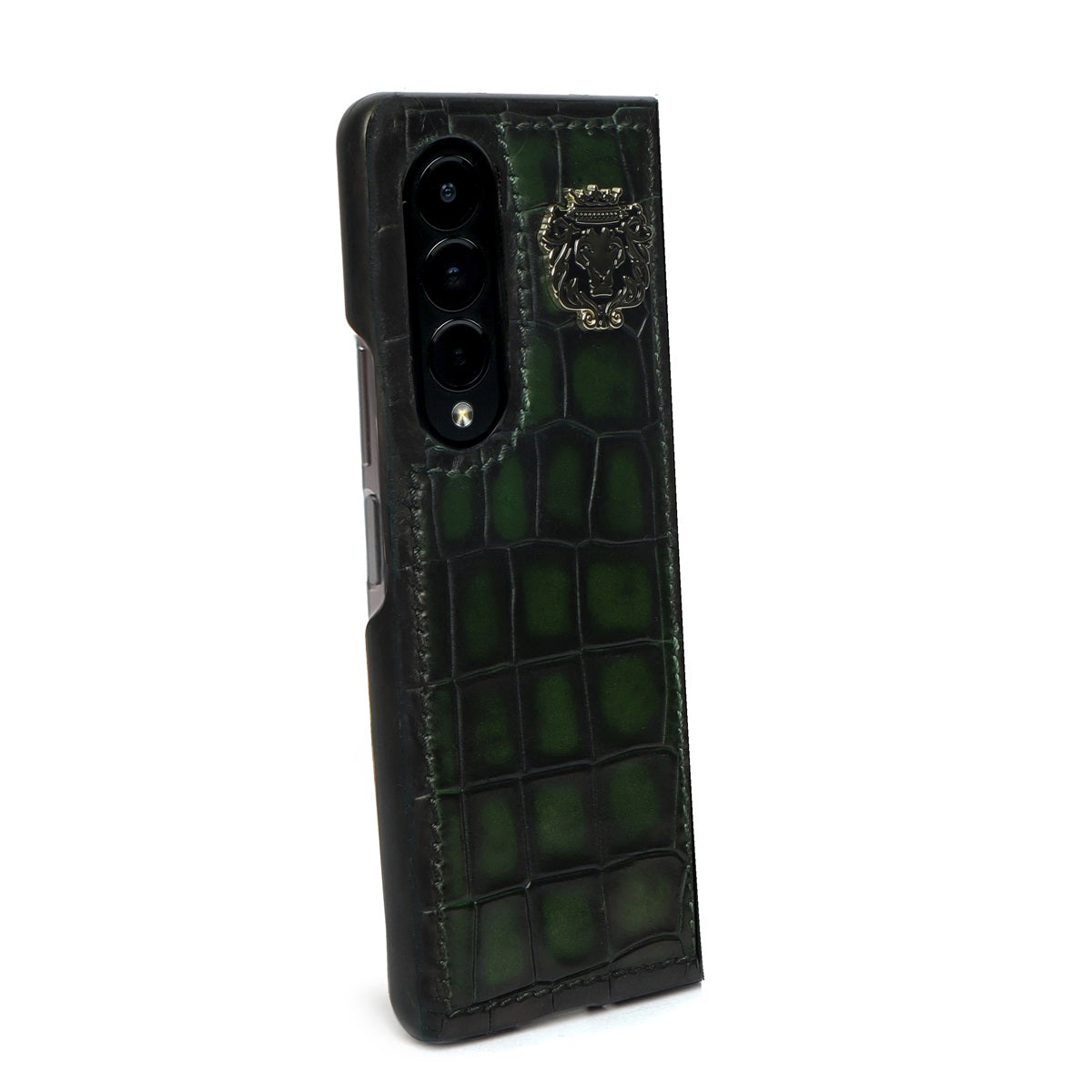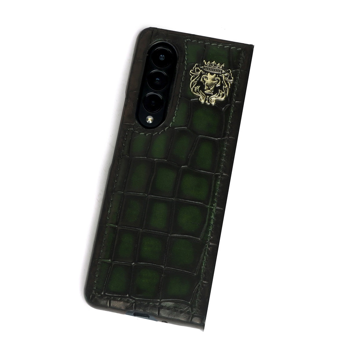 Smokey Finish Mobile Cover in Green Croco Textured Leather with Metal Lion