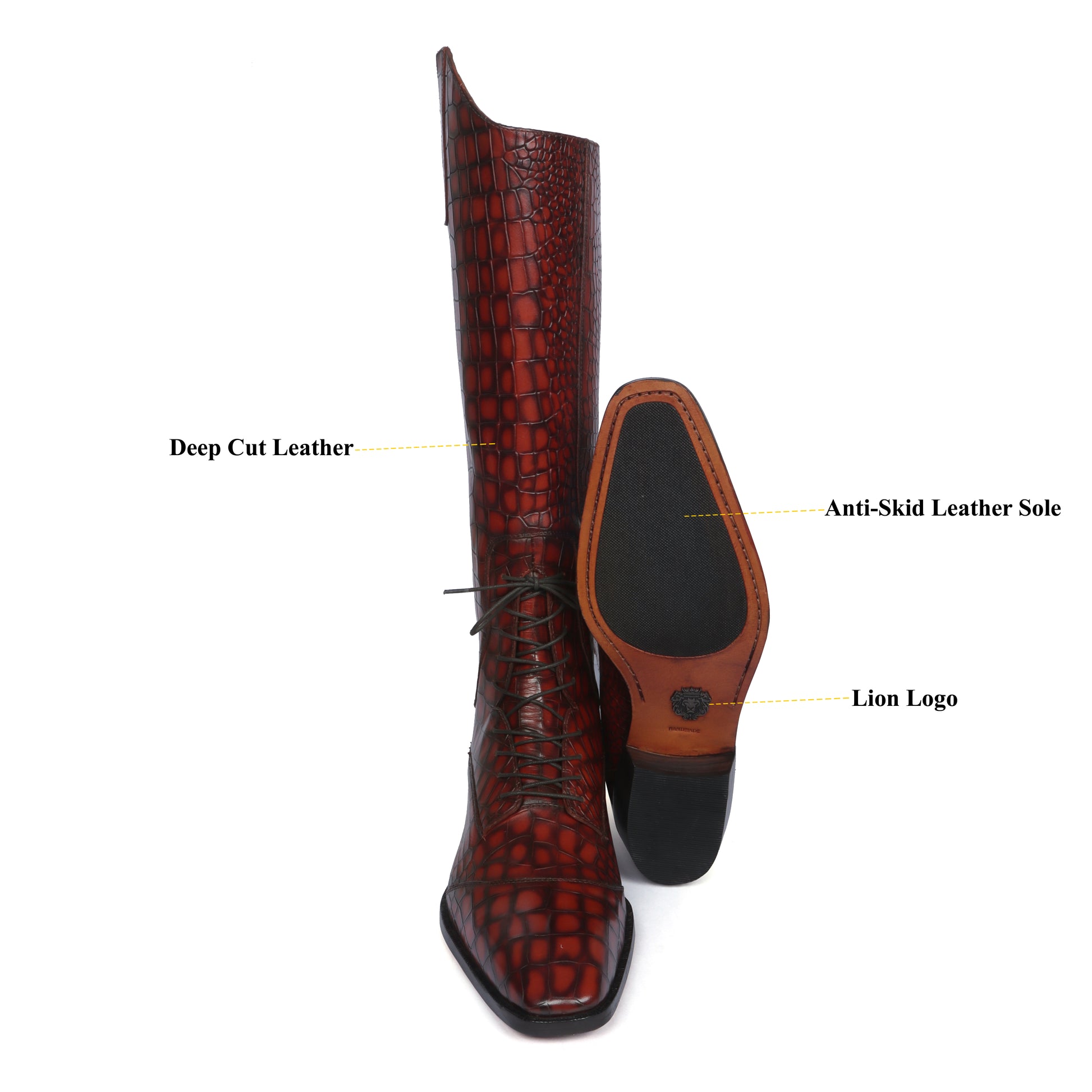 The Hand Painted Smokey Finish Deep Cut Leather Brune & Bareskin Boots are crafted to provide an utmost comfort and next level style. These boots are made to convert your horse riding experience more luxuries and comfortable one. The height of these modernized classic deep cut croco textured leather jockey shoes is precisely selected to provide you the best experience while riding.