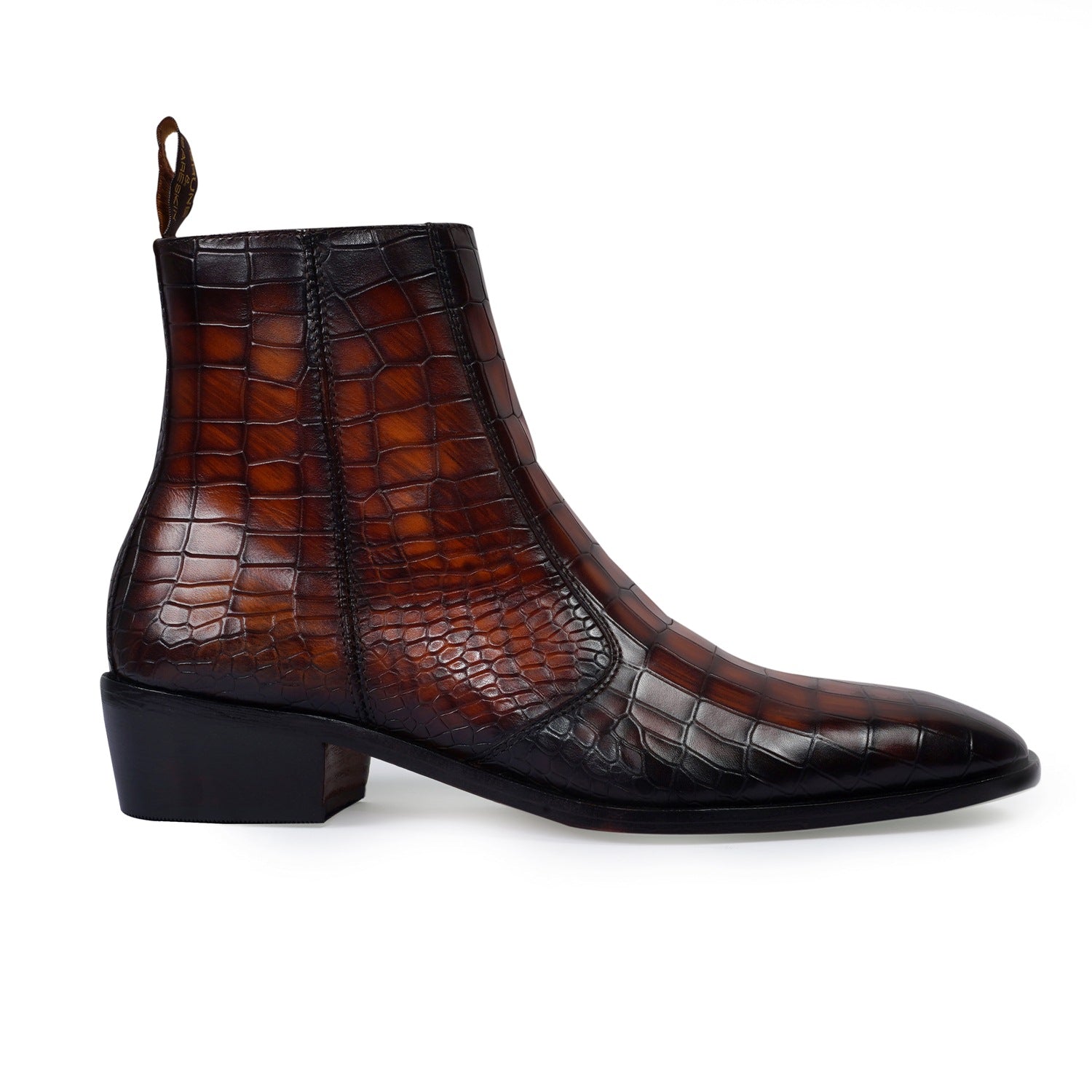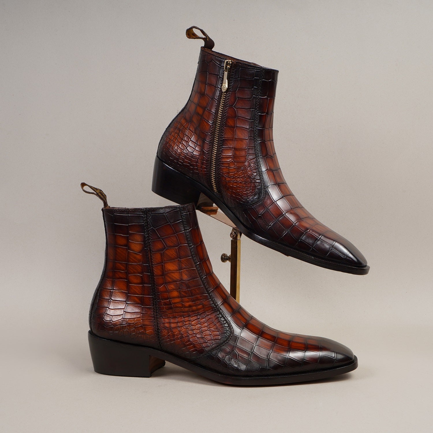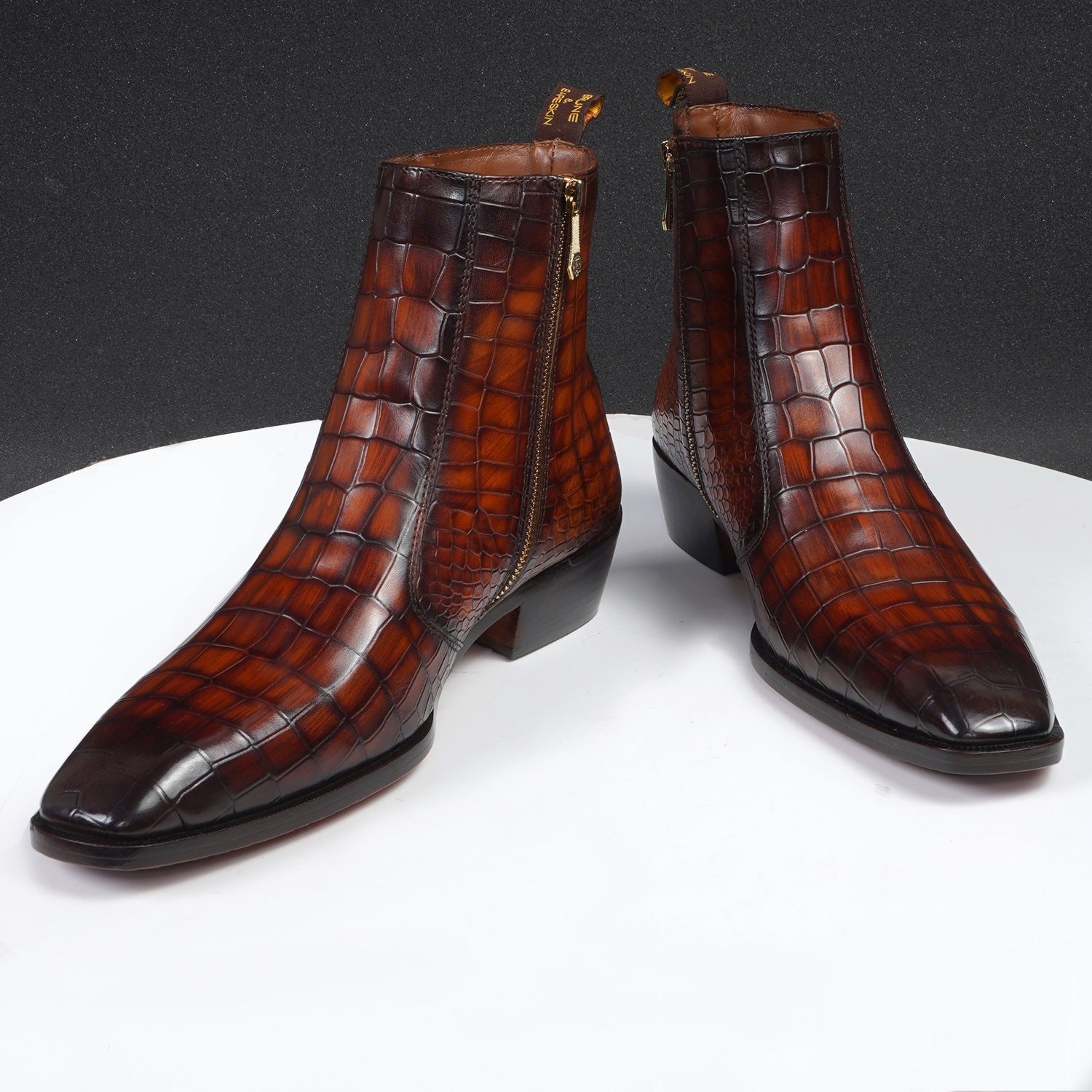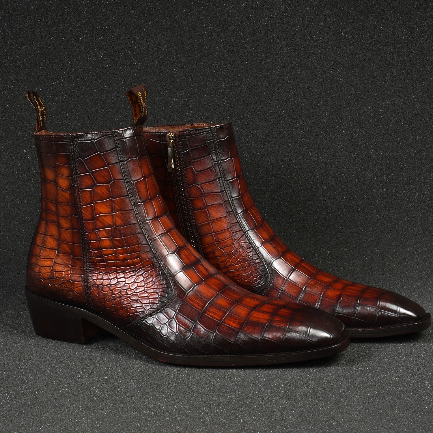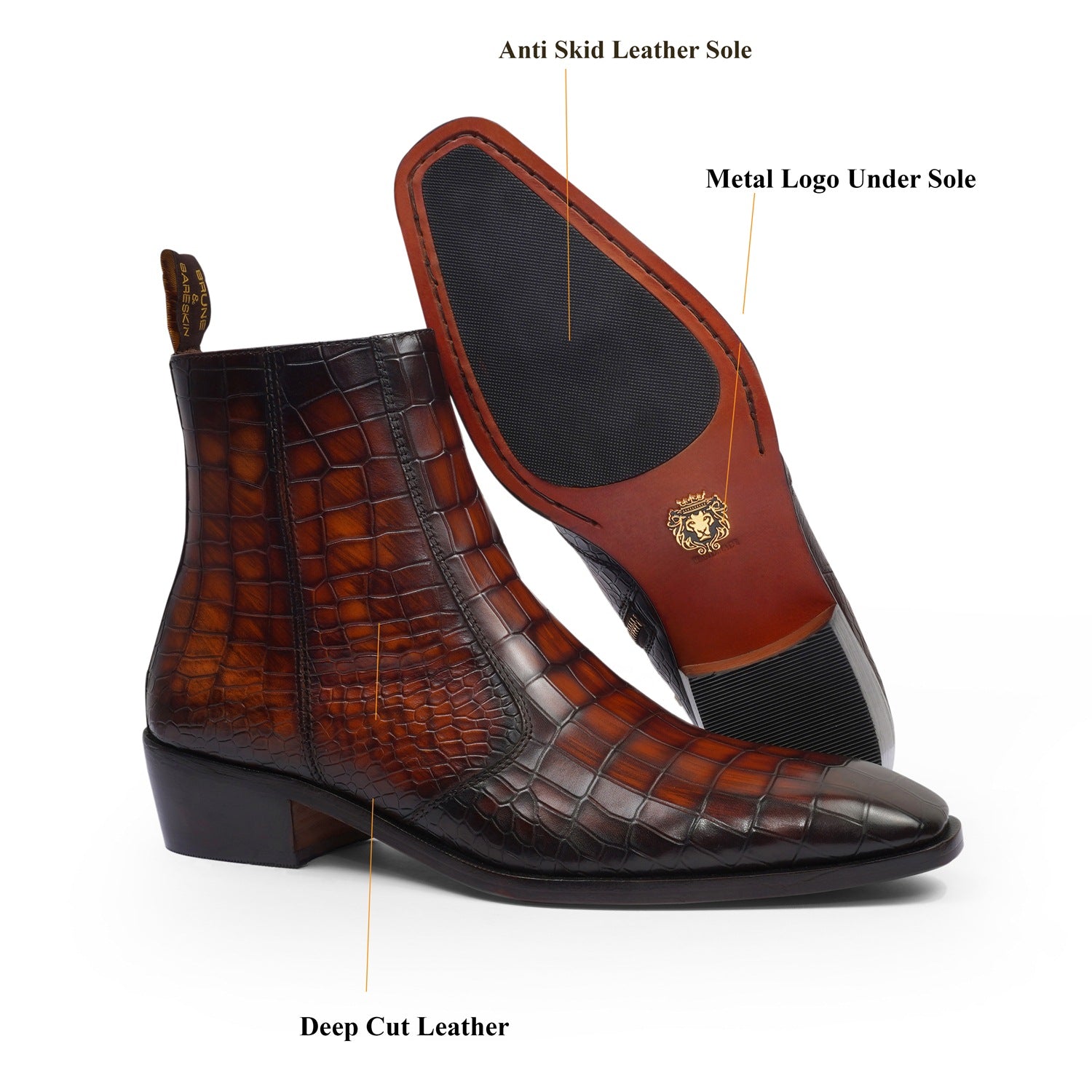 Ankle boot in leather are a dream come true for many a fashion-aware executives. We craft these Burnished Tan high ankle leather boots to give you an elite look. The greater detailing of the side zipper closure at the ankles lend a classy look to these deep cut croco textured leather boots. These deep cut croco print genuine leather ankle-length shoes are fitted to emphasize the size and shape of your feet to perfection. These boots provide the distinct and sassy look. They are easy to team with formal trousers as they blend well with the classic fabrics as well as the modern blended synthetic fabric pants, slacks and trousers. The leather sole and Cuban heel adds the extra elegance to it. You can customize this chic boots in any of your favorite color with our bespoke services.