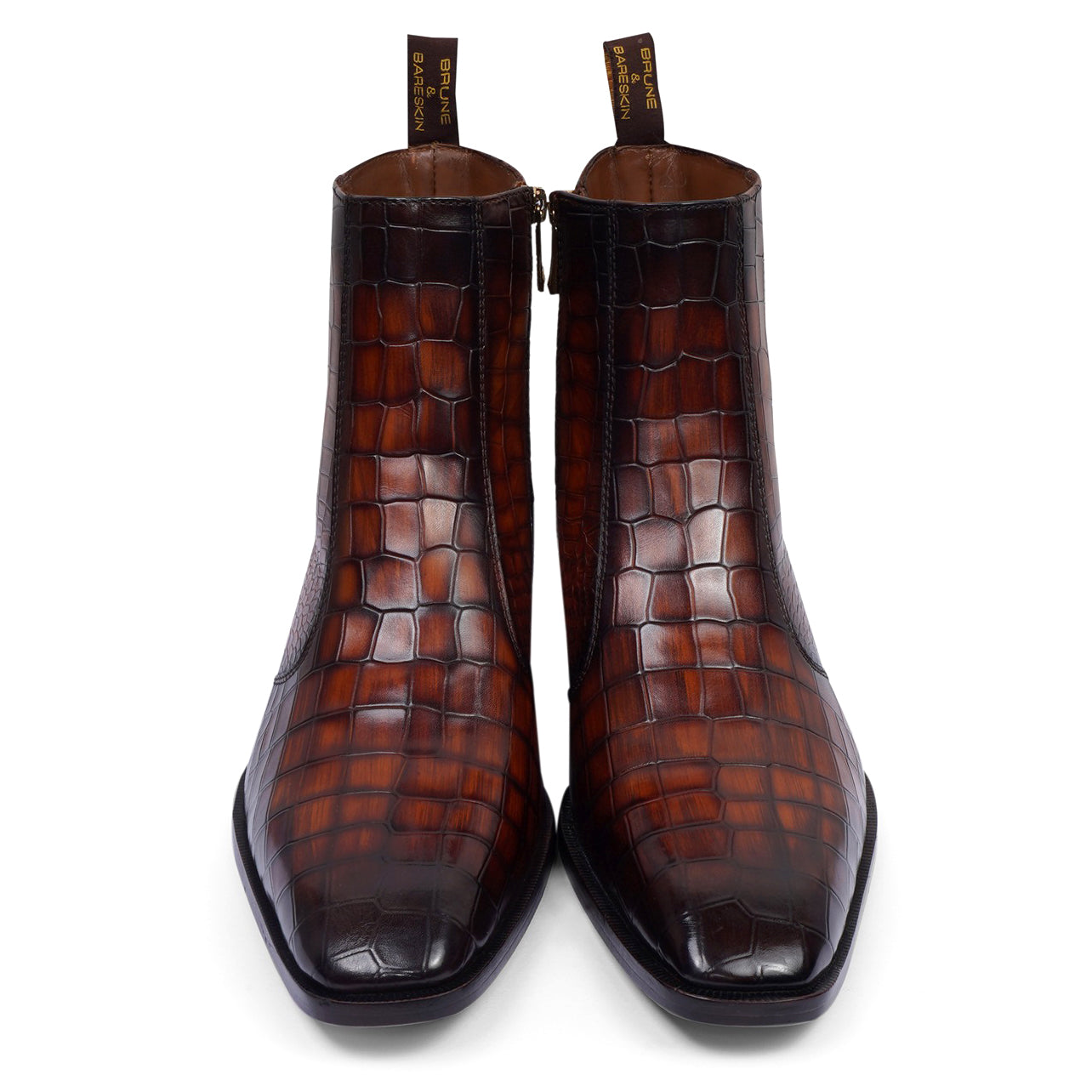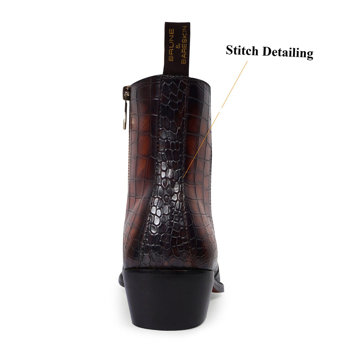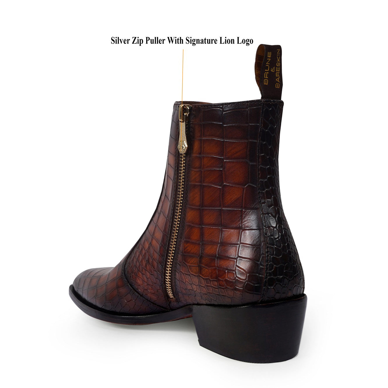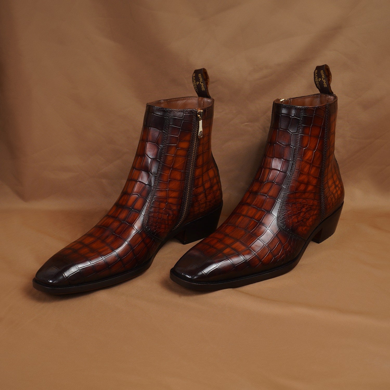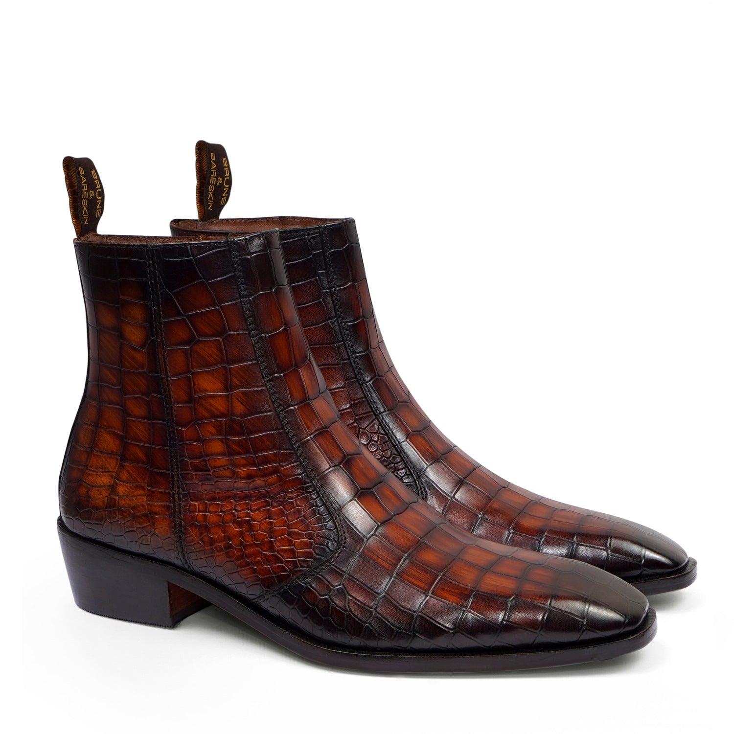 Ankle boot in leather are a dream come true for many a fashion-aware executives. We craft these Burnished Tan high ankle leather boots to give you an elite look. The greater detailing of the side zipper closure at the ankles lend a classy look to these deep cut croco textured leather boots. These deep cut croco print genuine leather ankle-length shoes are fitted to emphasize the size and shape of your feet to perfection. These boots provide the distinct and sassy look. They are easy to team with formal trousers as they blend well with the classic fabrics as well as the modern blended synthetic fabric pants, slacks and trousers. The leather sole and Cuban heel adds the extra elegance to it. You can customize this chic boots in any of your favorite color with our bespoke services.