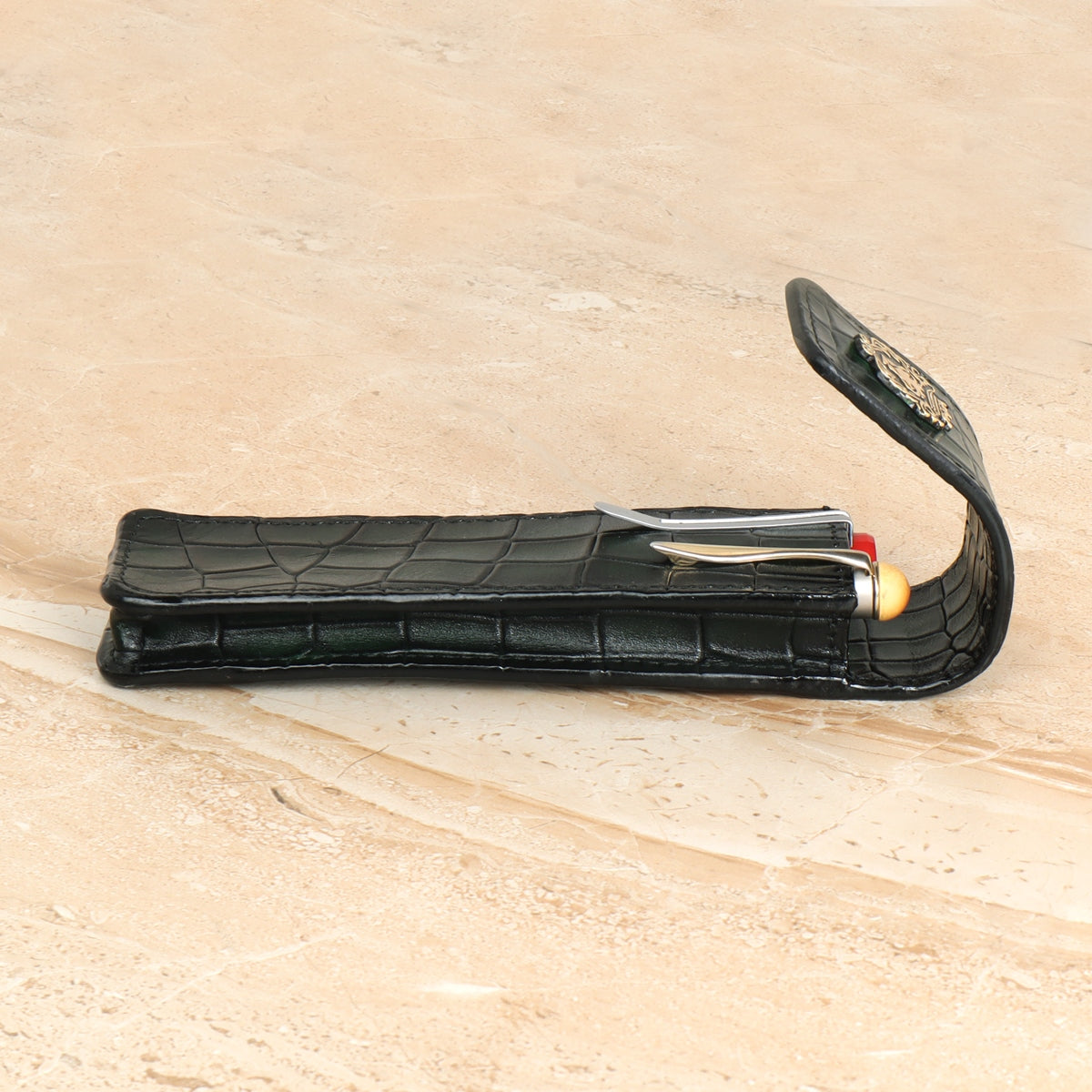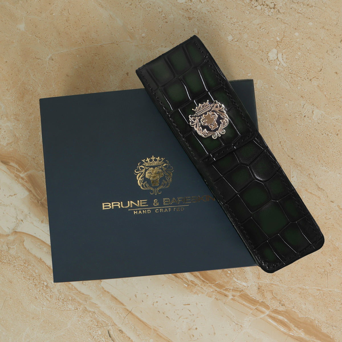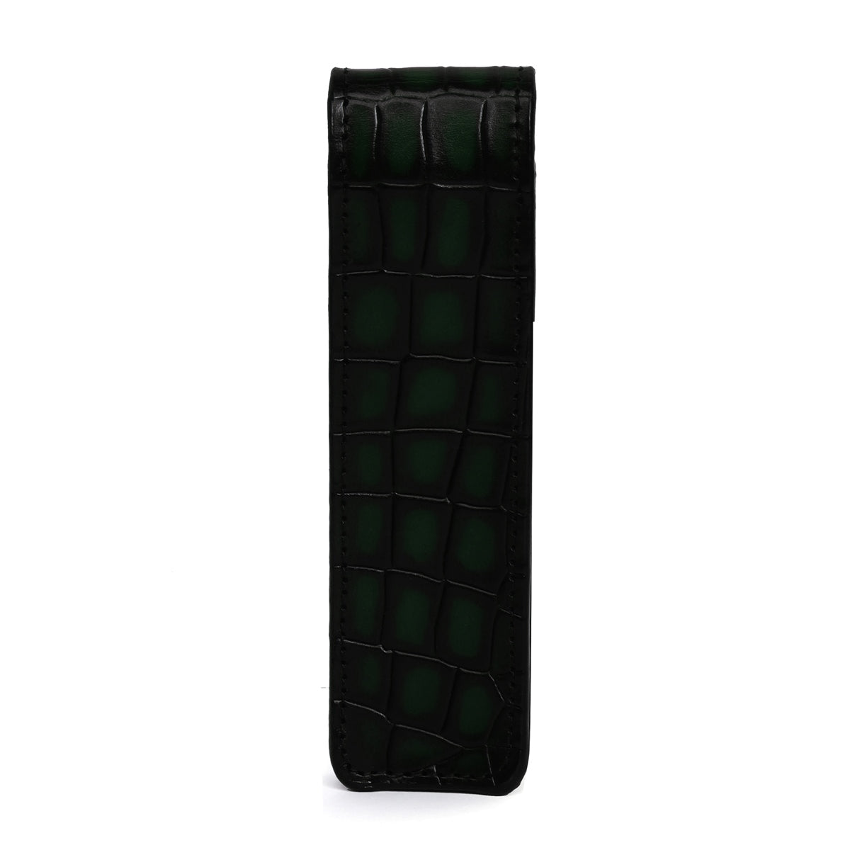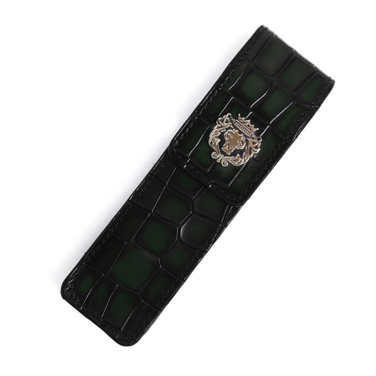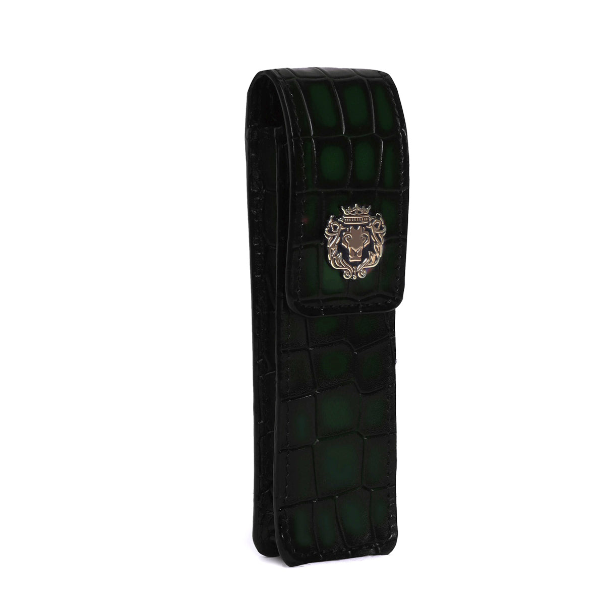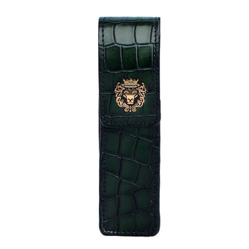 Smokey Green Cut Croco Textured Leather Pen Holder with Metal Lion Logo By Brune & Bareskin