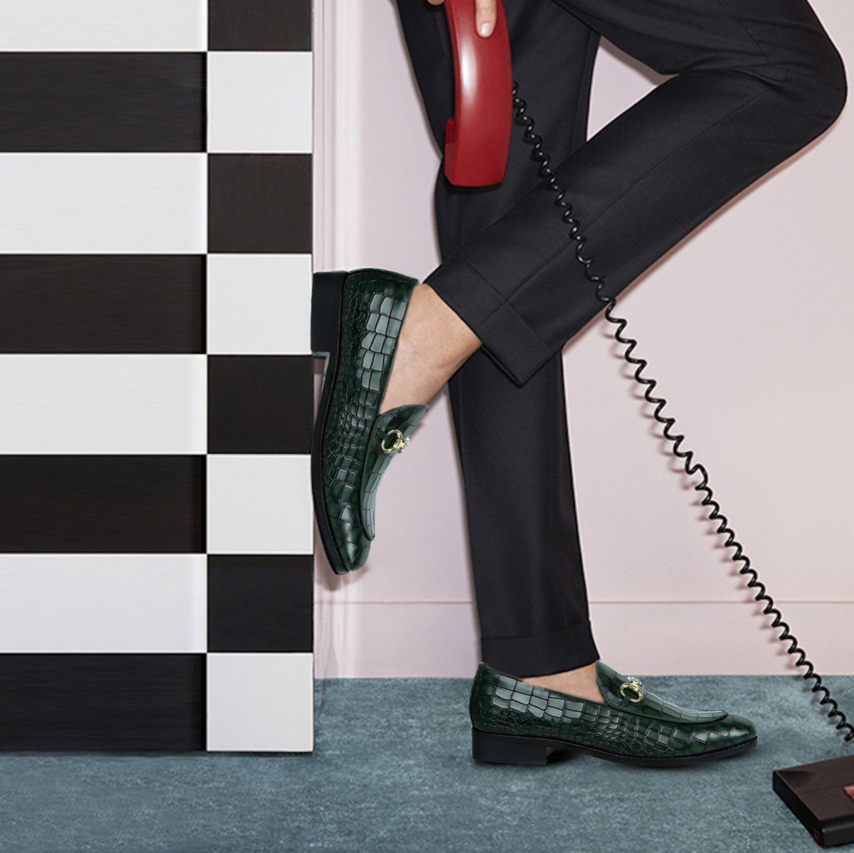 Make your everyday special with these classy men's loafers. It is the best shoe category for any men's closet. Loafers remain favorite style of shoes, as they are convenient to use and spell minimum fuss. Green Deep Cut Croco Leather shoe with Patina Smokey Finish looks lavishing with metal horsebit on it. And when they are made of exemplary fitting and finish as that of the brand Brune & Bareskin, you can be sure that the shoes are nothing short of excellence. These green leather shoes, with perfectly round apron toe design have a very rich appearance. This is a must have pair in your footwear collection.