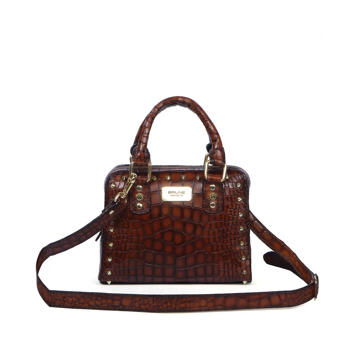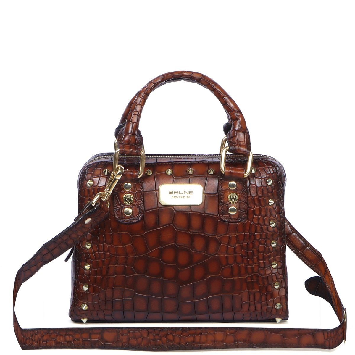 Brune & Barskin tan cut croco smokey leather handbag is a stylish and trendy accessory for women that is made from tan deep cut croco leather material. This type of handbag is known for its unique and eye-catching design, as well as its durability and longevity. It has removable/adjustable strap which helps to carry it away. The adjustable shoulder strap connects and removes easily with the hidden hardware loops. Golden zippers are often used in designer bags to create a luxurious and high-end feel with two micro lion logo on front side. A golden studs handbag is a trendy and fashionable accessory for women that features small, metallic studs attached to the bag's surface, typically in a golden color. 100% pure genuine cut croco leather is used for making your style. This hand bag can be personalized with your name initials in any color shade and in any size with our bespoke services. This is a must-have addition to your fashion collection.