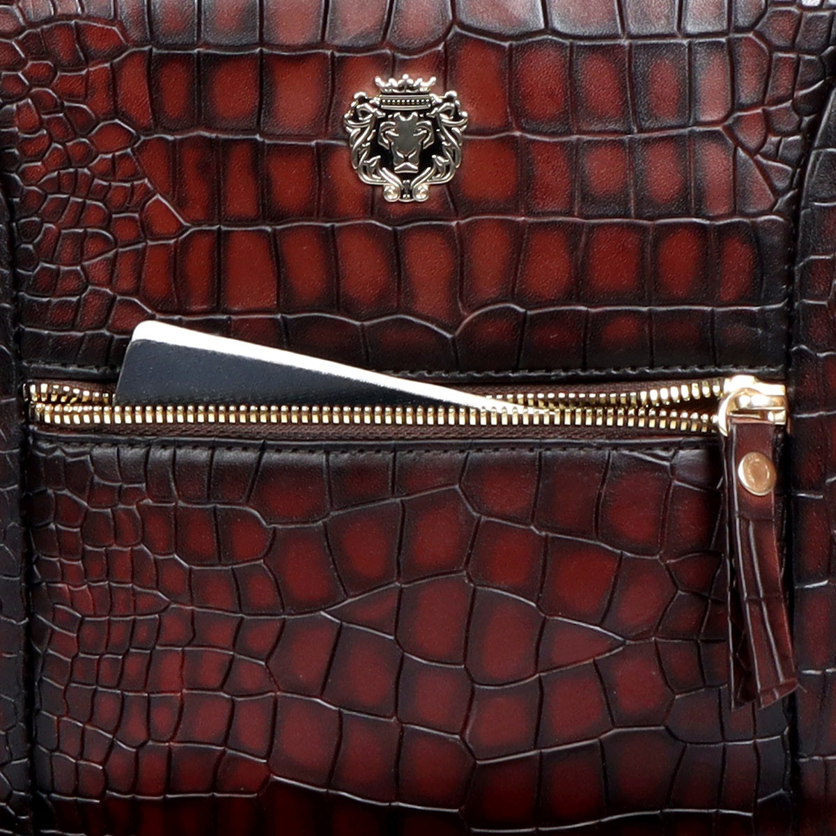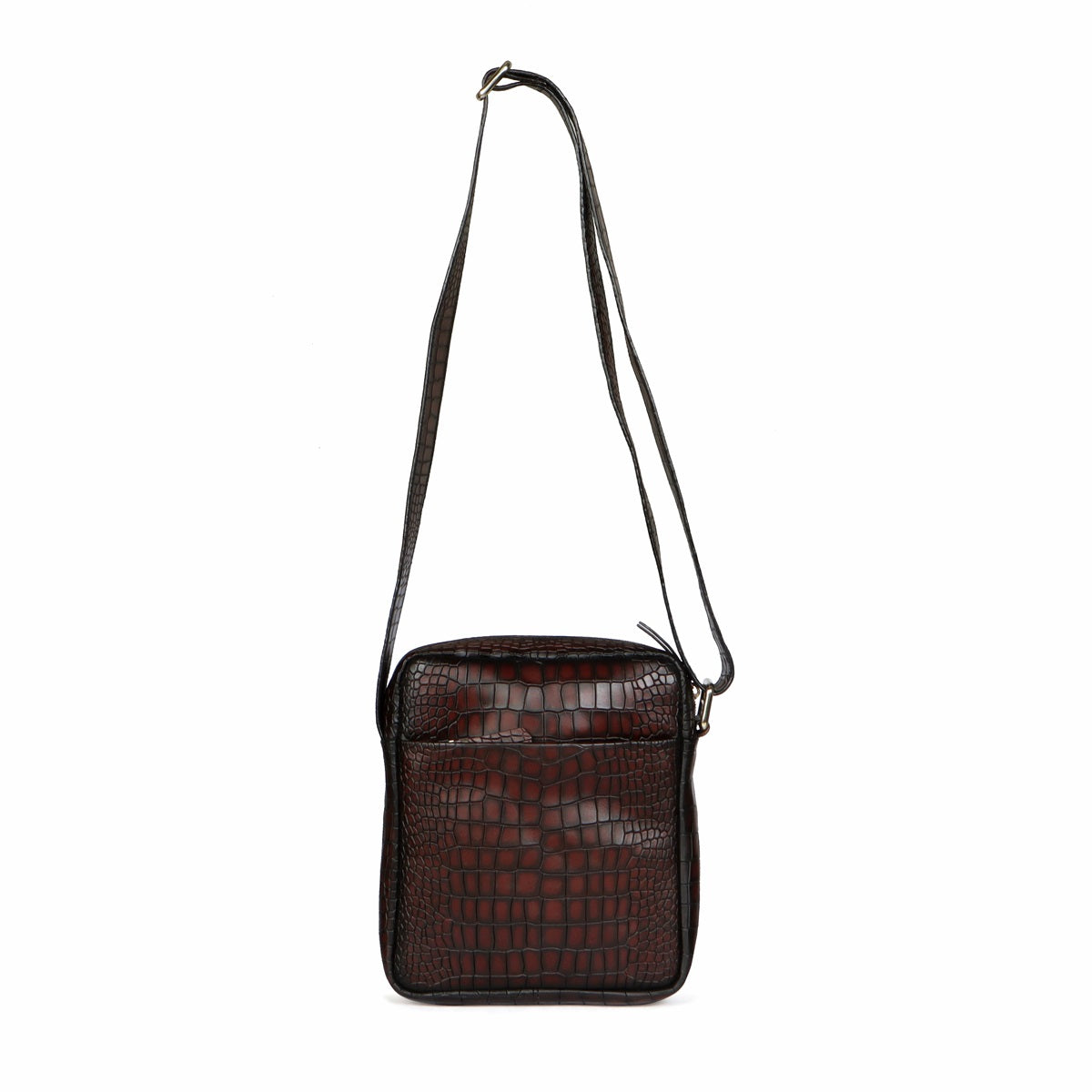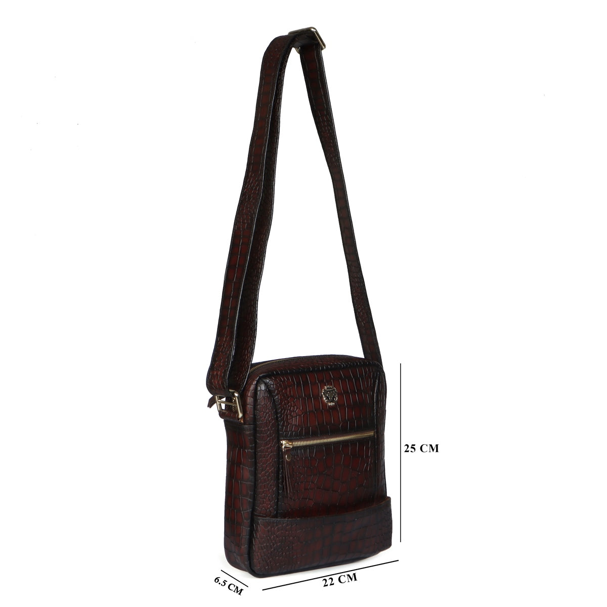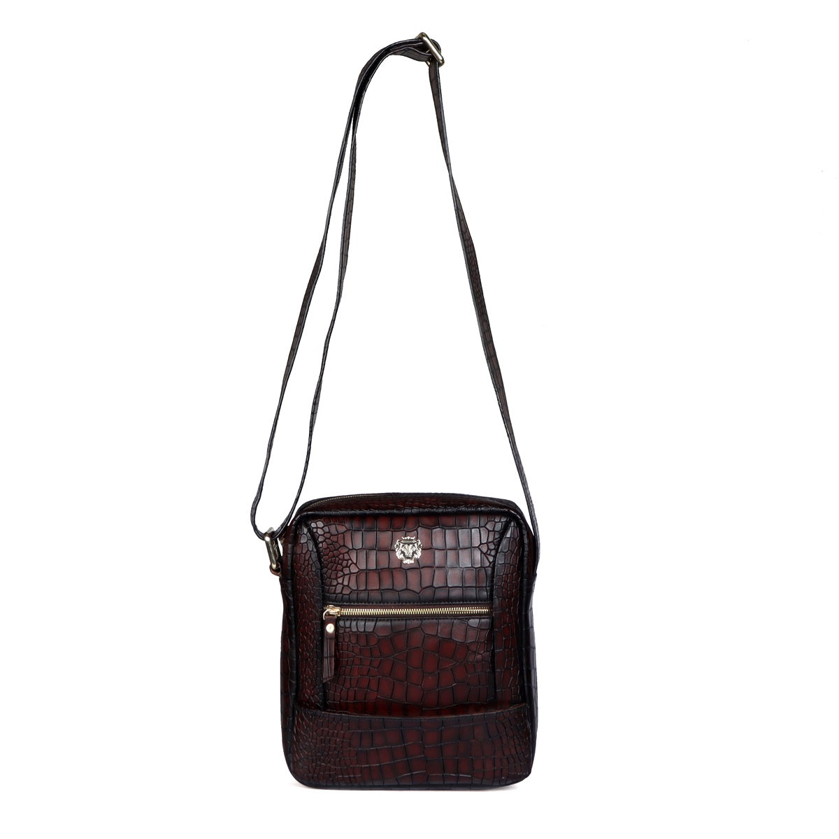 This modern yet classy cross-body bag is a must have especially for the travelers out there. The Smokey Finish Deep Cut Croco Print leather looks lavishing. Deep Cut Genuine Leather made provides the ruggedness and durability to it. Zip compartment at the top provide the ample space to carry the essentials while traveling. Zip pockets on front and back provide the easier access to frequently used stuff. This Cross-body Dark Brown Deep Cut Croco Textured leather Bag with BRUNE & BARESKIN signature metal Lion brand logo on it increases its elegance. It's also equipped with an adjustable shoulder strap for comfort and versatility. Moreover, You can get it customized in your favorite color shade with Name Initials with our bespoke services.