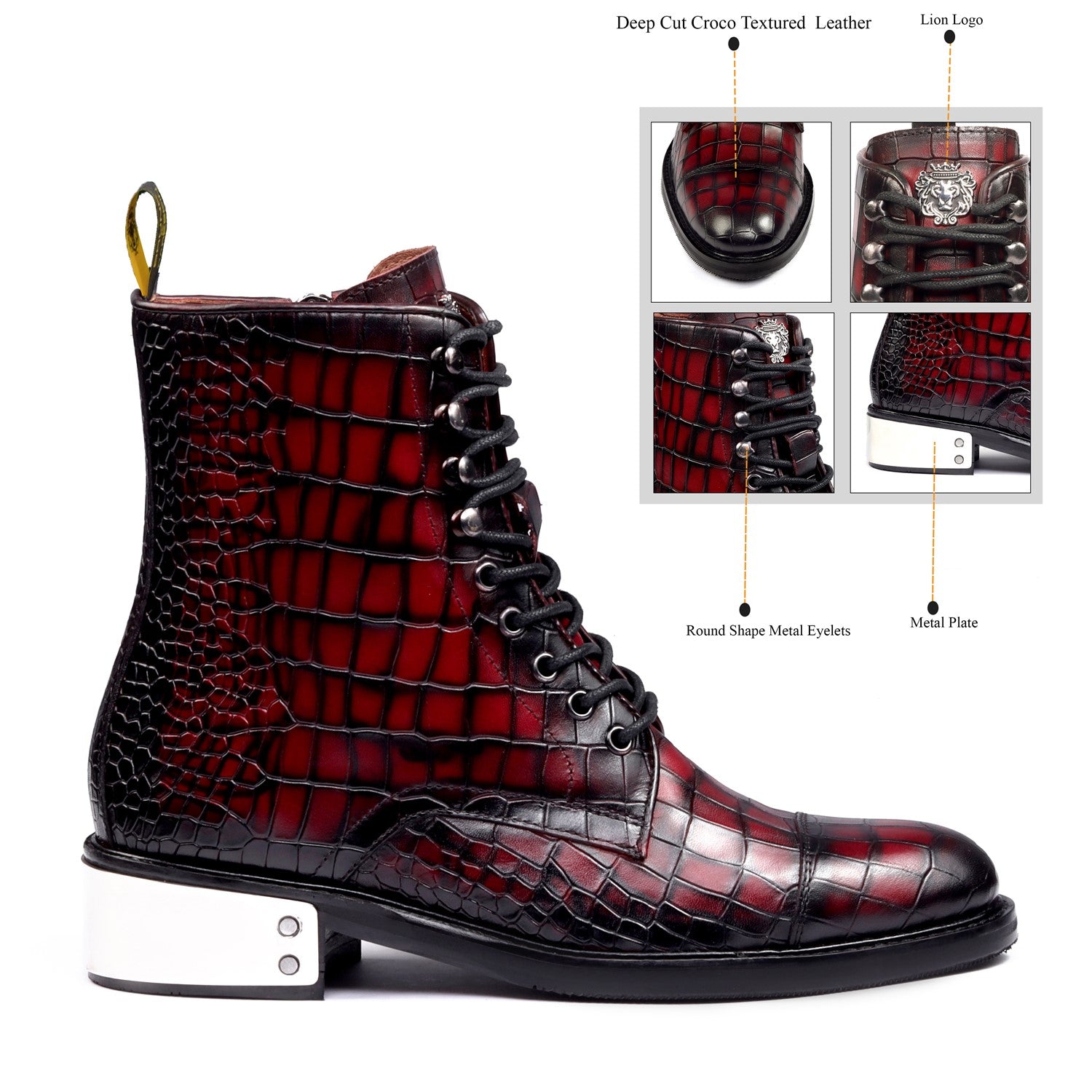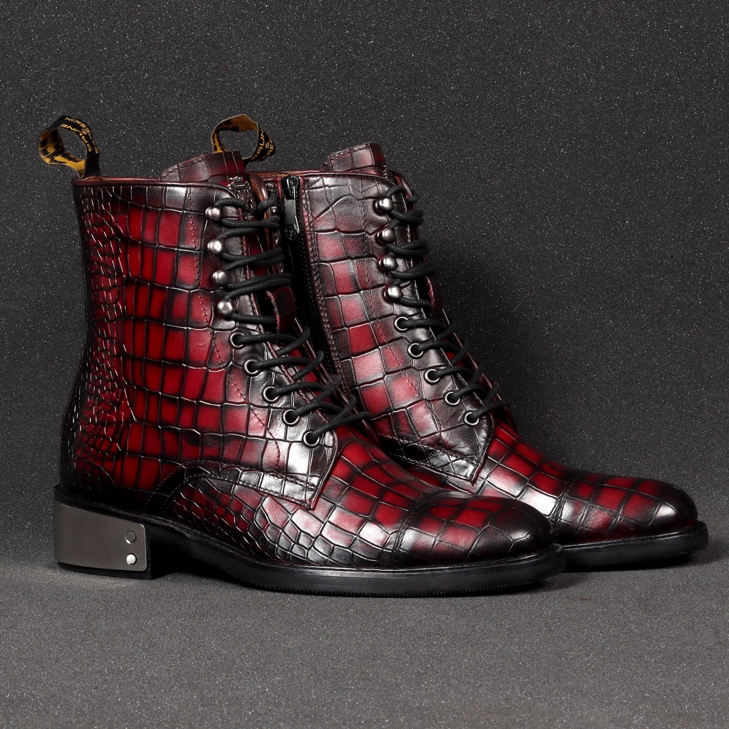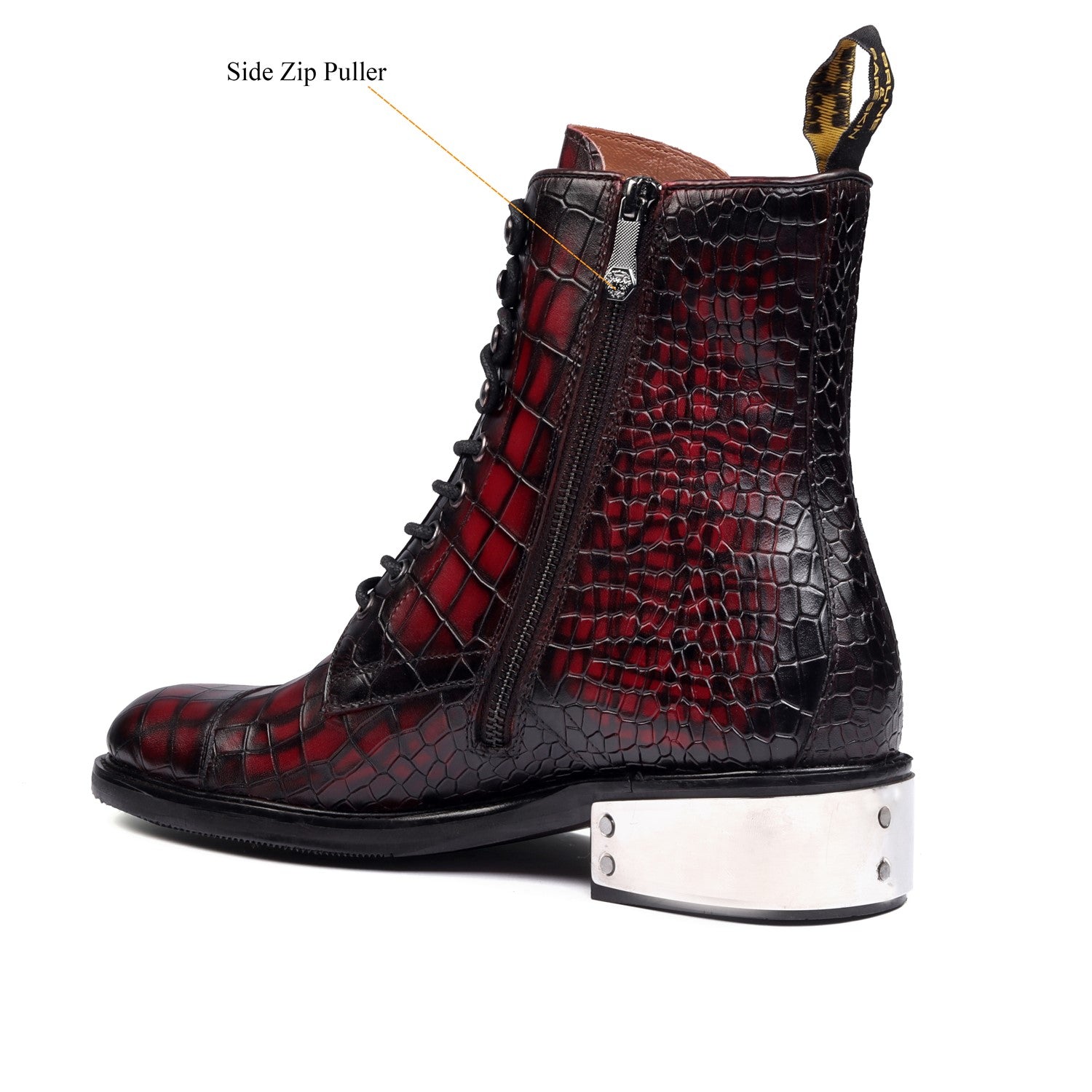 Smokey Wine High Ankle Boot with Metal Plate in Deep Cut Croco Leather