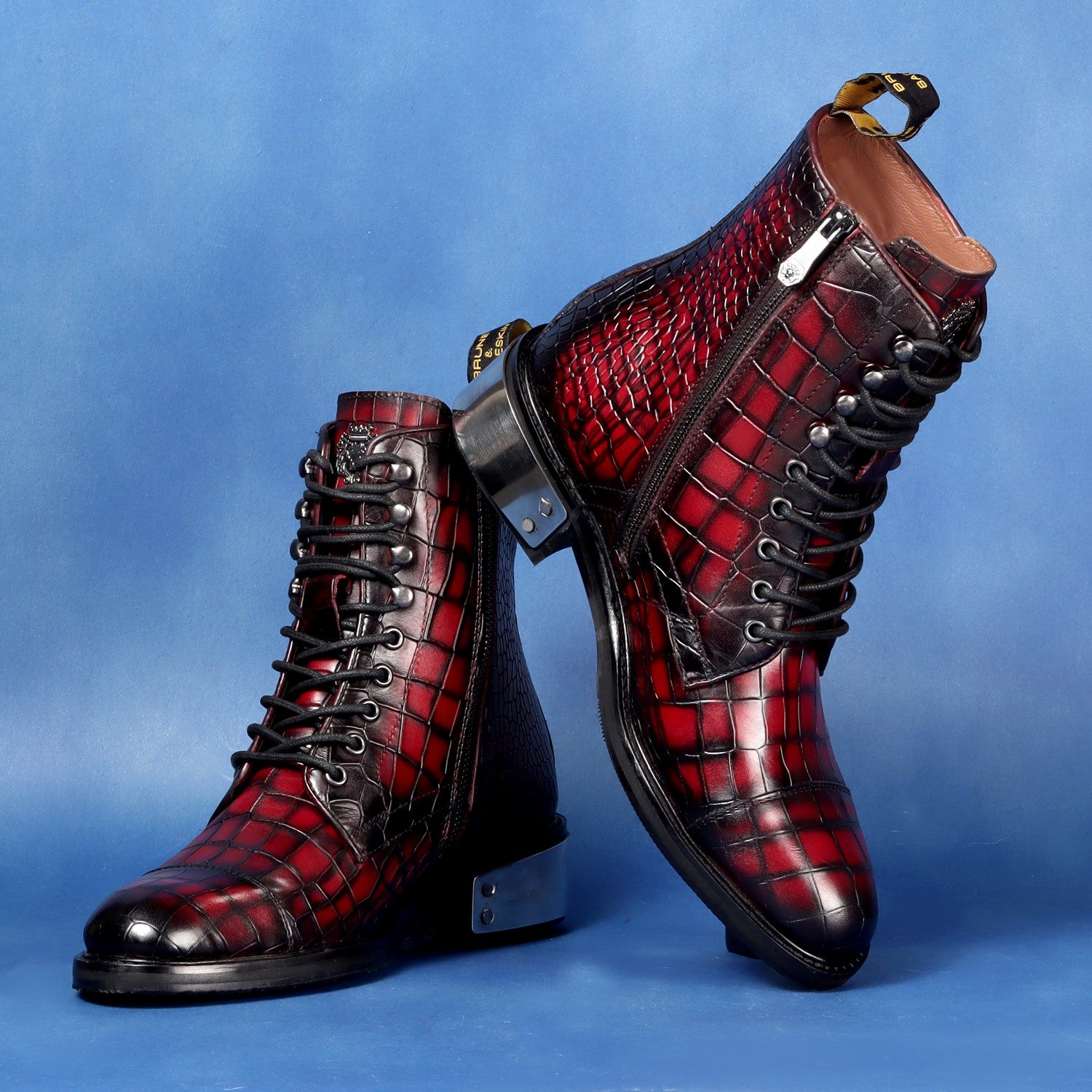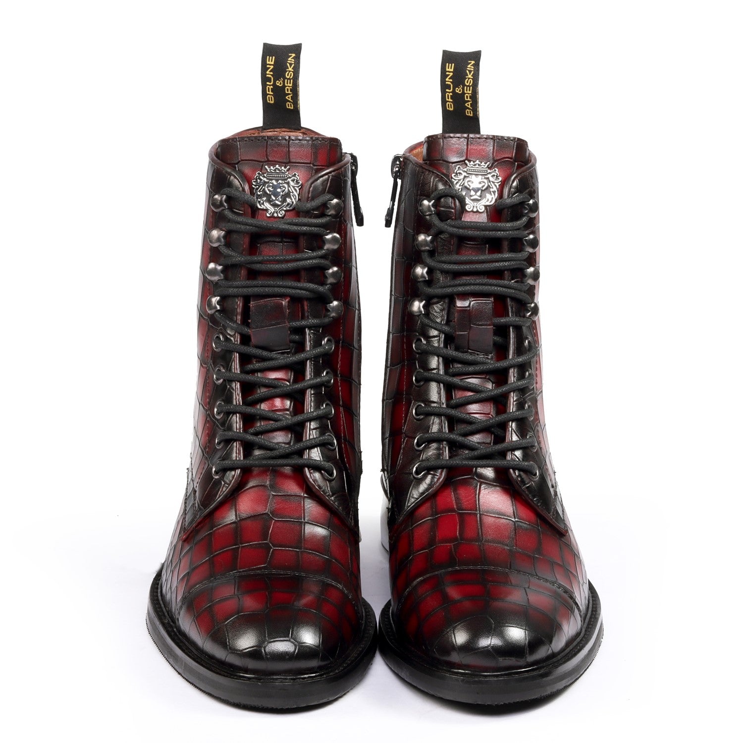 Brune & Bareskin's Smokey Wine High Ankle Boot with silver metal plate is an elegant statement piece crafted from genuine durable leather in a croco texture and a classic Smokey finish. Designed with a derby lace-up closure and an inner side zipper for added convenience, this timeless boot also features a metal lion brand logo, a 40mm heel, and a laser detailing on the sole. Perfect for special occasions, this gorgeous boot is the ideal addition to any refined wardrobe.