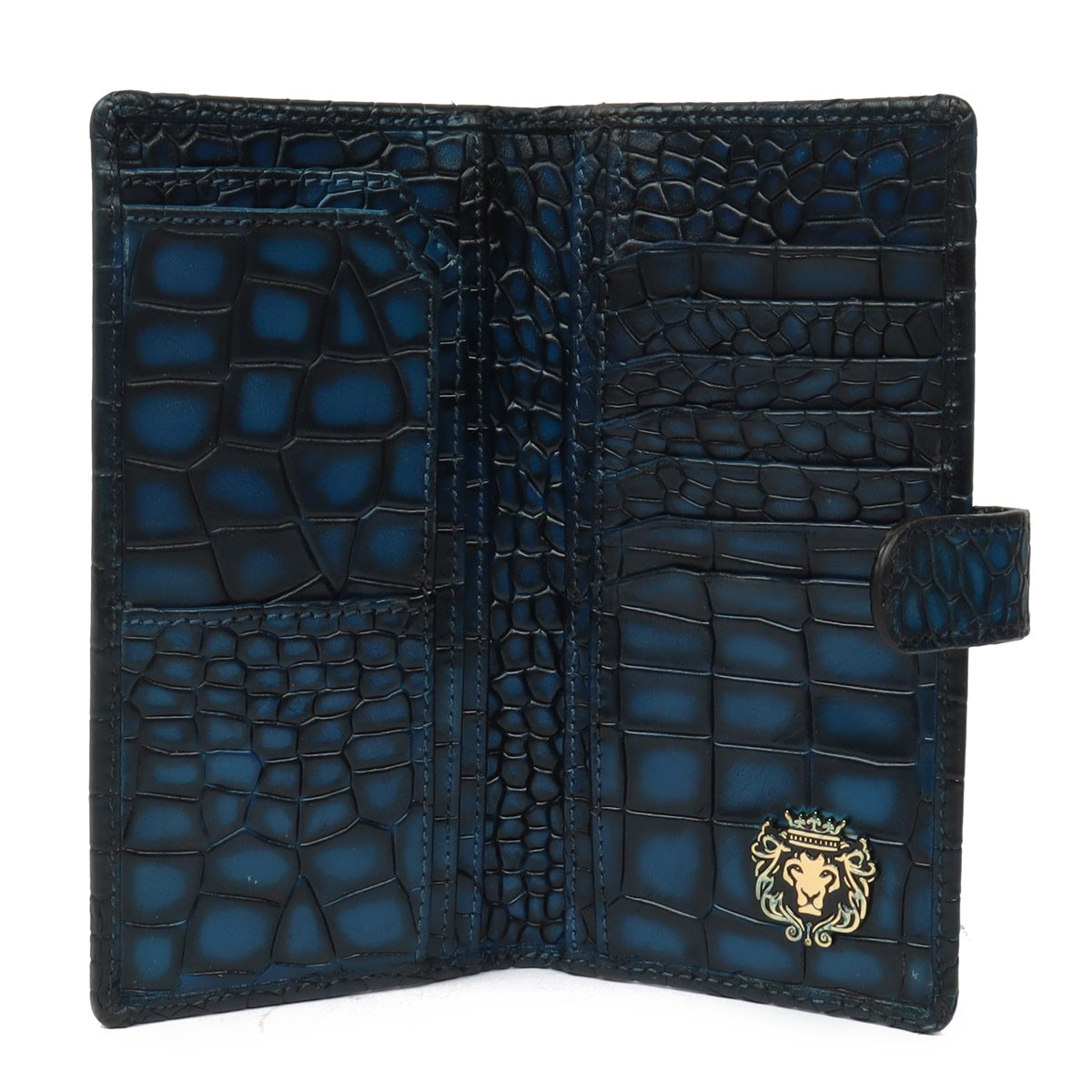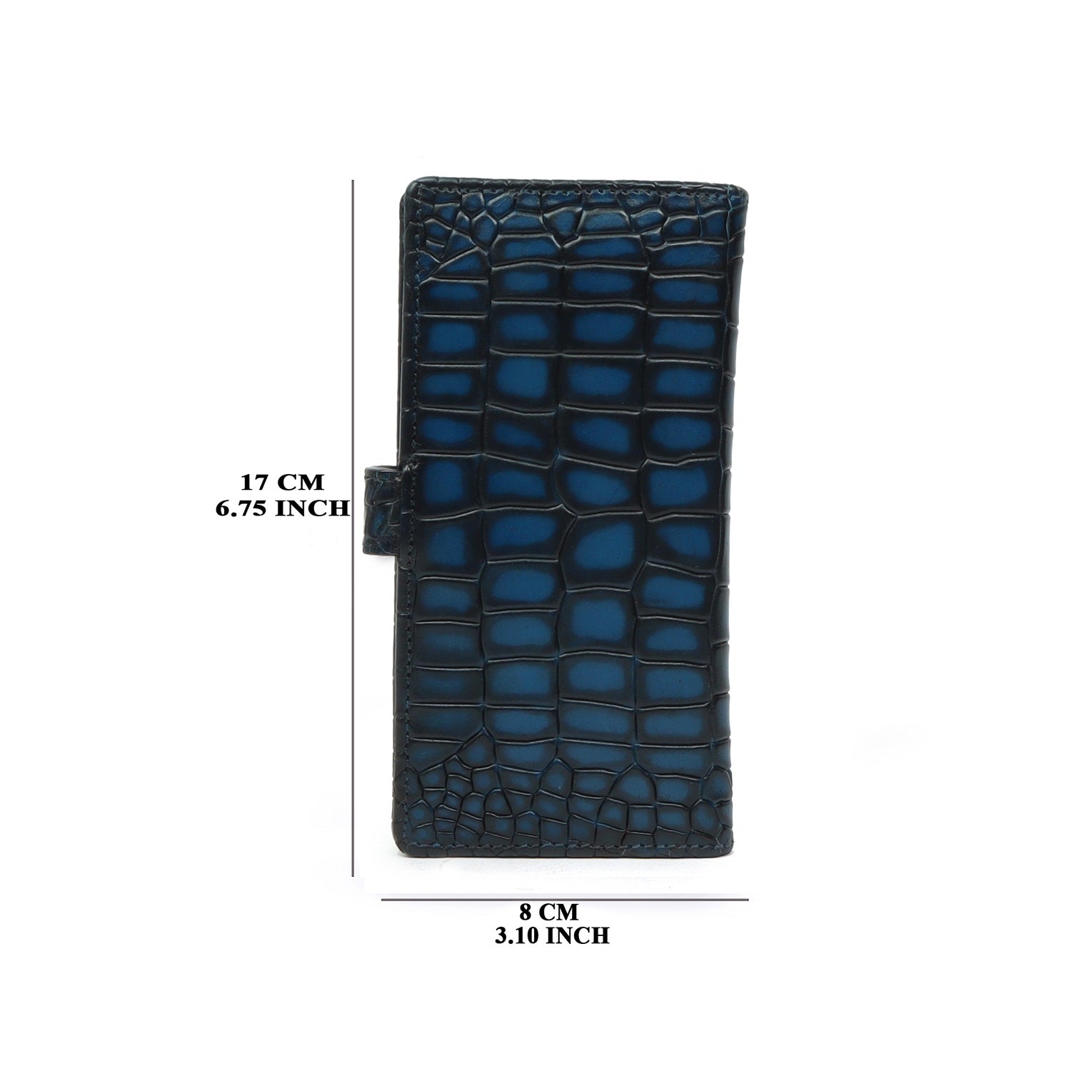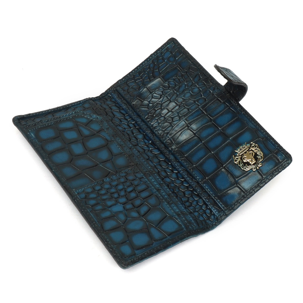 Smokey Blue Long Wallet in Croco Textured Leather with Signature Metal Lion Logo By Brune & Bareskin