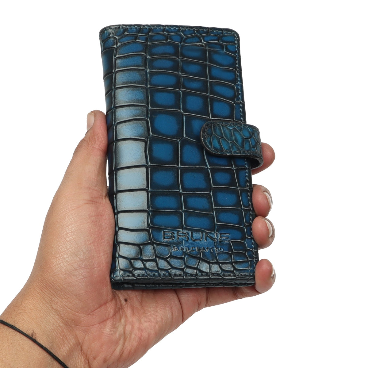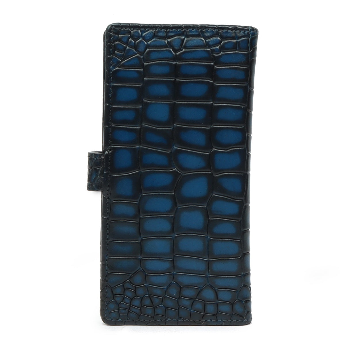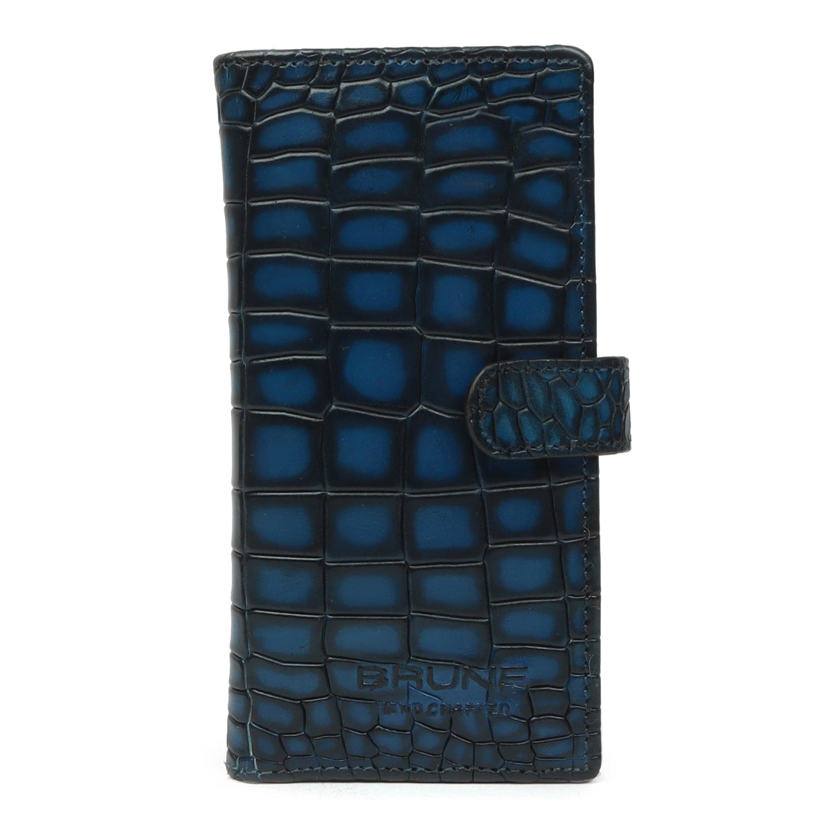 Smokey Blue Long Wallet in Croco Textured Leather with Signature Metal Lion Logo By Brune & Bareskin
