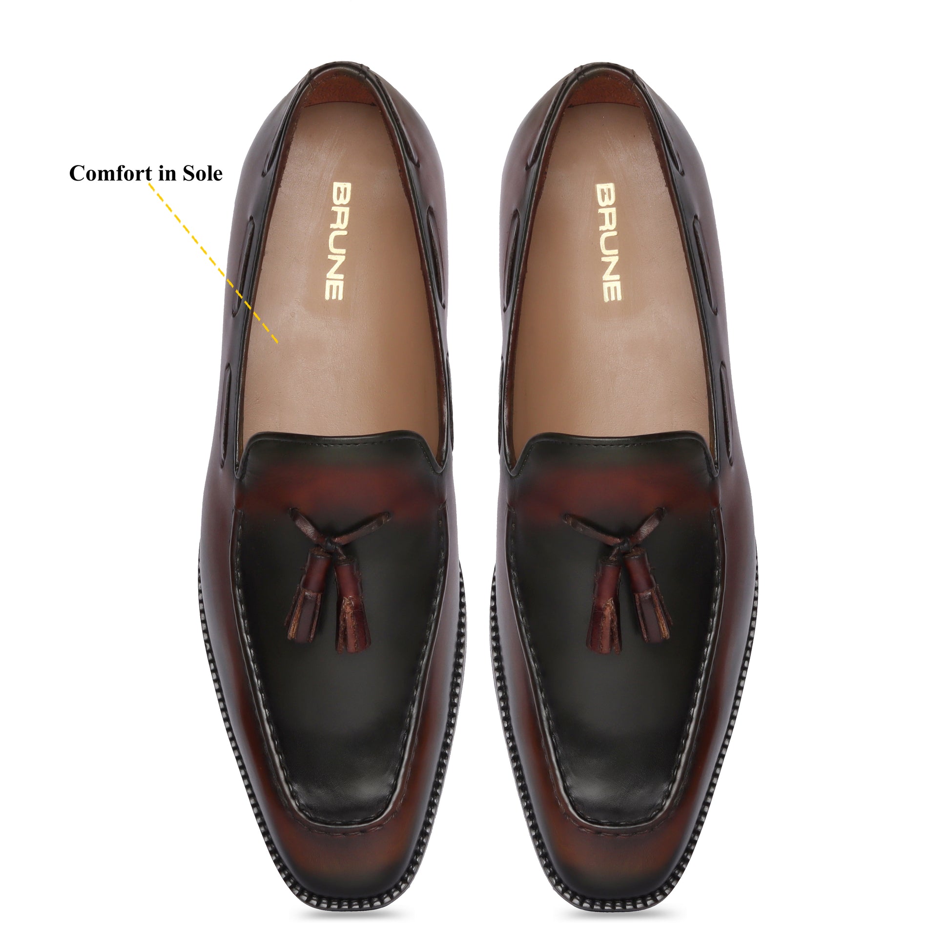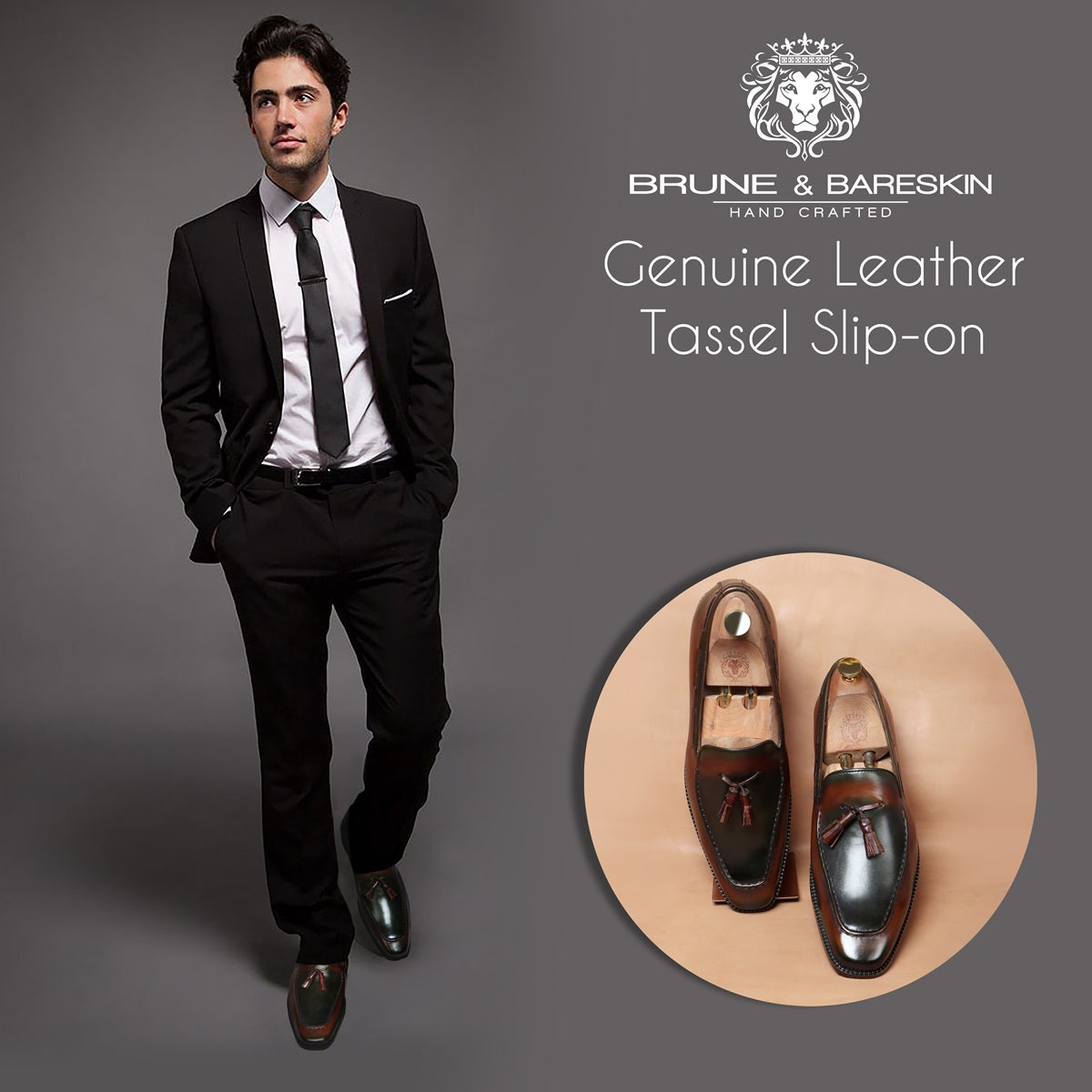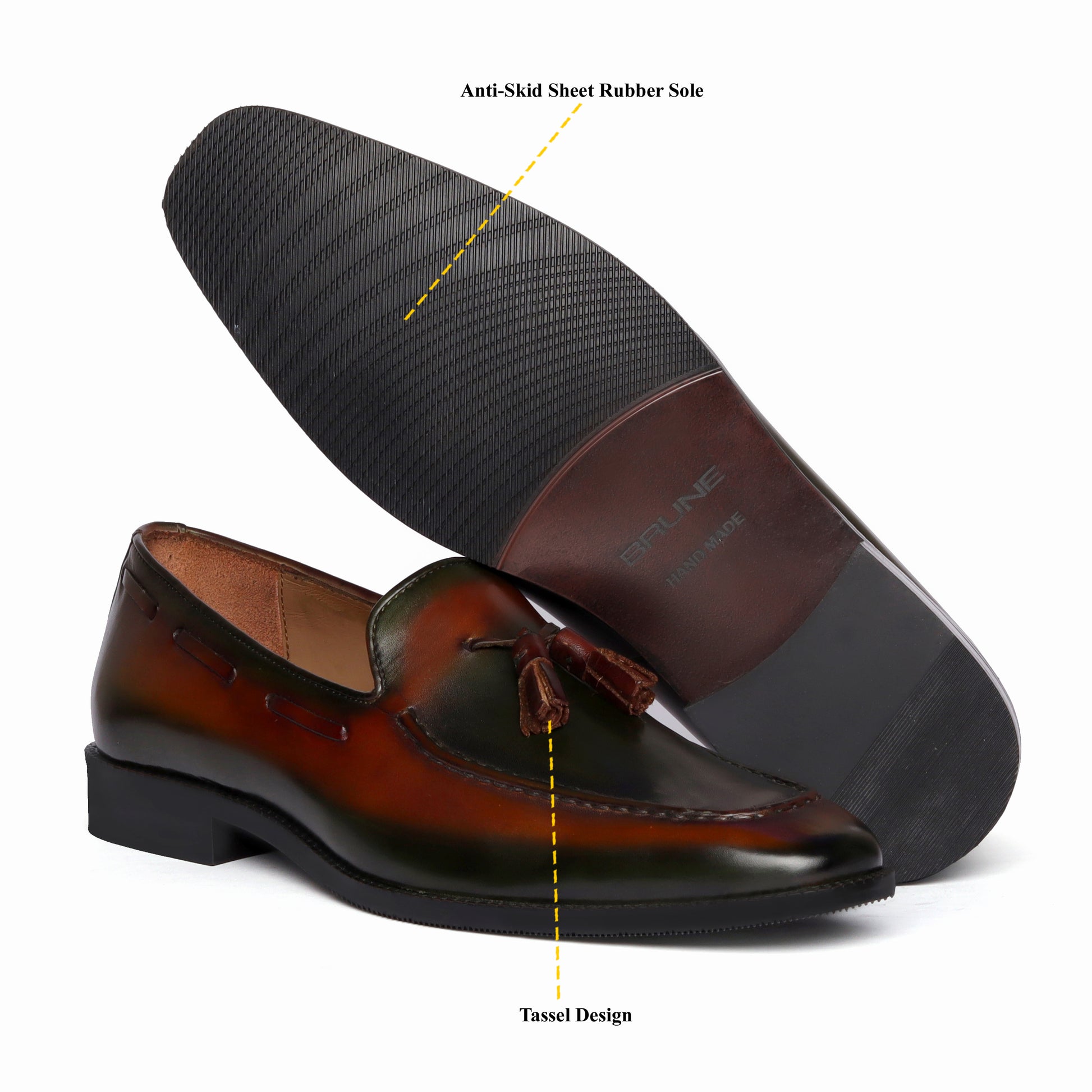 For Genuine Leather shoes, with style, choose to wear this pair of hand-painted leather shoes by BRUNE & BARESKIN. The formal smudged look trendy leather tassel is one-of-a-kind design and indicates your style preference. Two Tone Genuine leather products look very classy when matched with a dark to light color accent. Loafers remain the favorite style of shoes, as they are convenient to use and spell minimum fuss. A modern twist on the classic dual tone tan green penny loafer shoe with Tassel design enhances the style statement. The padded insole and rubberized outsole make it comfortable and durable it all day long. This is a must-have pair in your footwear collection. The tassel design provides an elegance to it and the side lacing pattern differentiates this shoe from the cluster. The Rubberized outer sole provides better grip in different conditions. The easy-to-wear slip-on design makes it a must-buy for this season. It is a perfect accessory to wear with formal-to-casual attires at any party or office. This is the shoe you would love to wear again and again.