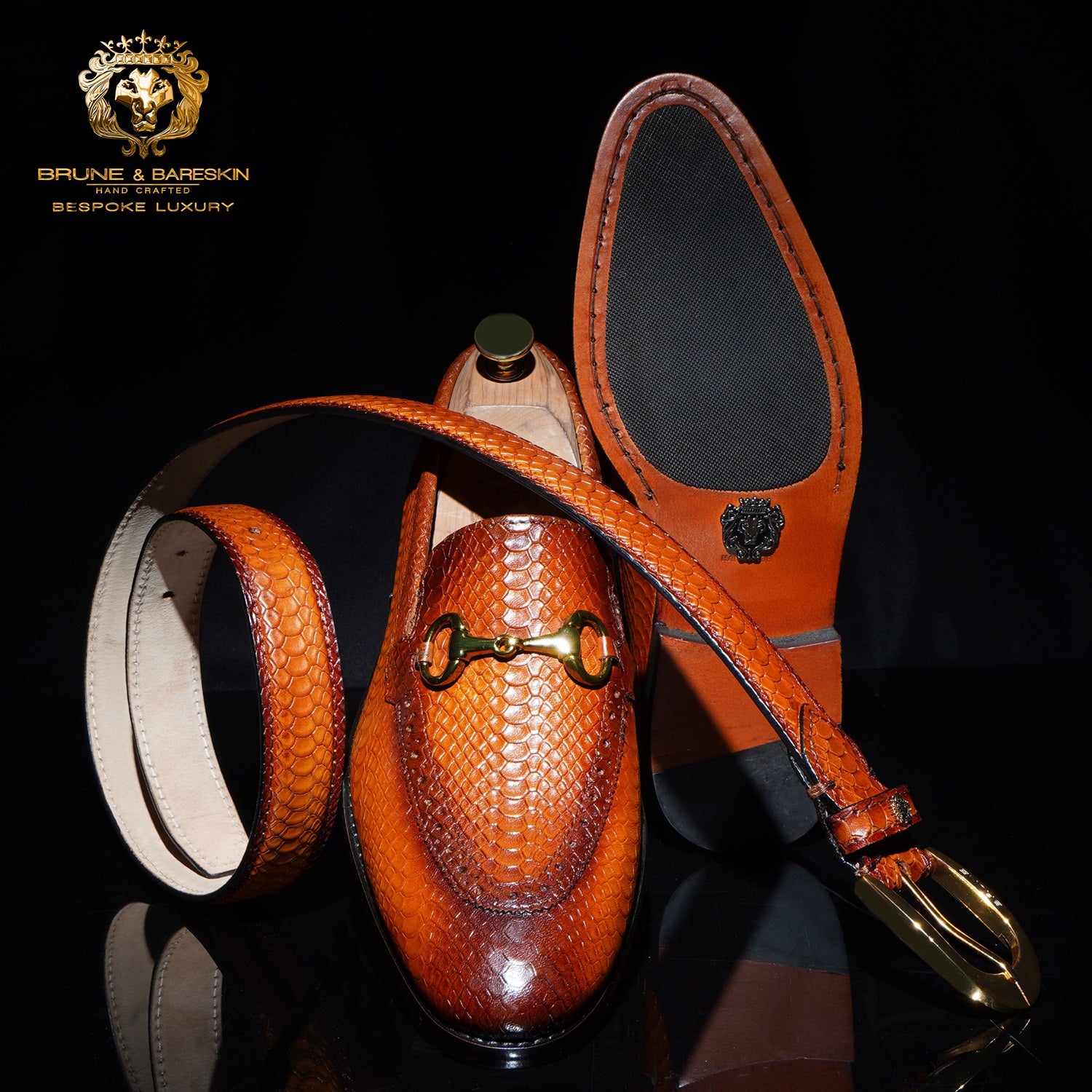 Step out in style with this perfect gentleman combo of loafers and belt by Brune & Bareskin. Made with premium quality, hand-crafted snake skin textured leather in a sleek tan color, it features a mini metal lion logo and an apron toe design. The leather sole and extra cushioning ensure comfort and durability. Complete your look with this stylish combo!