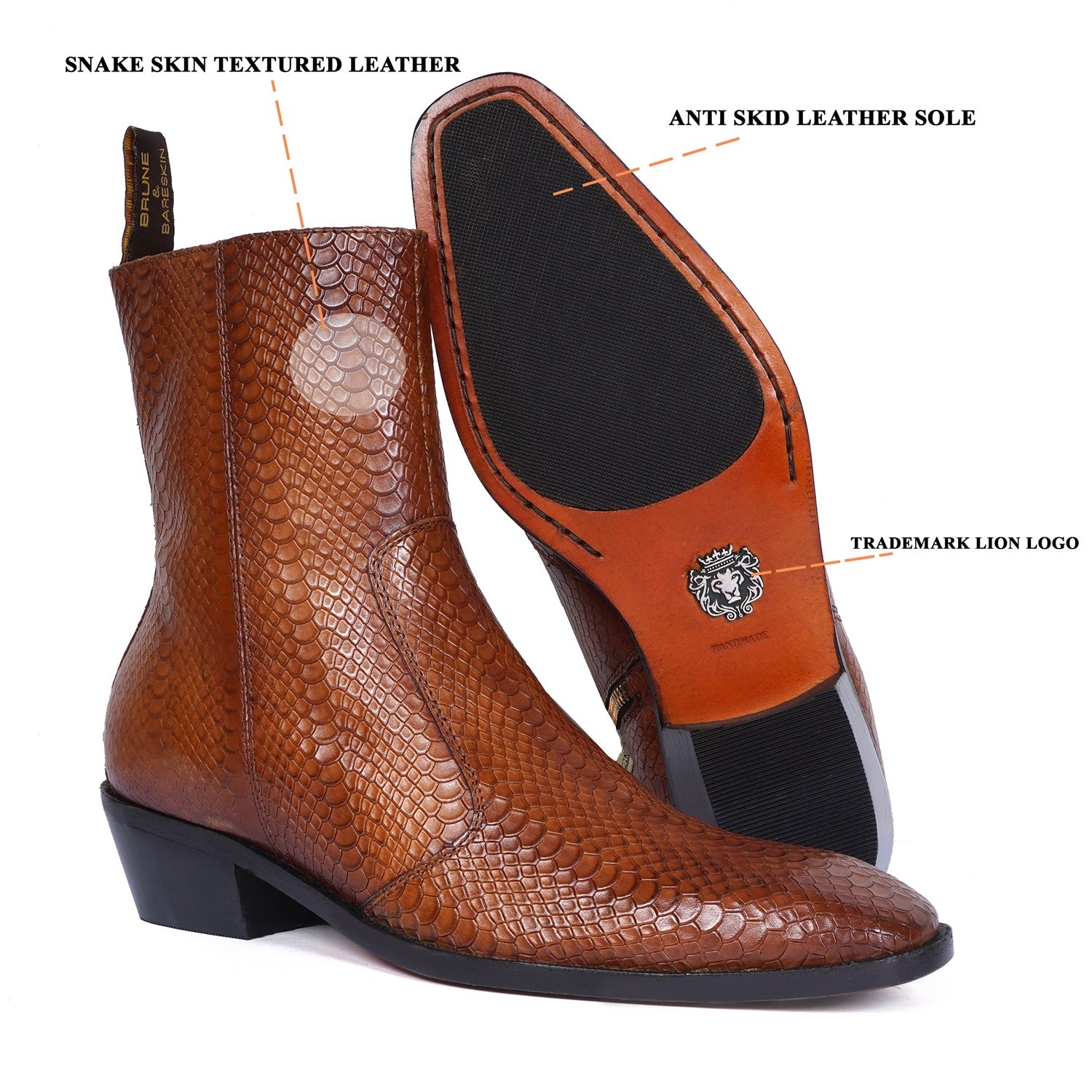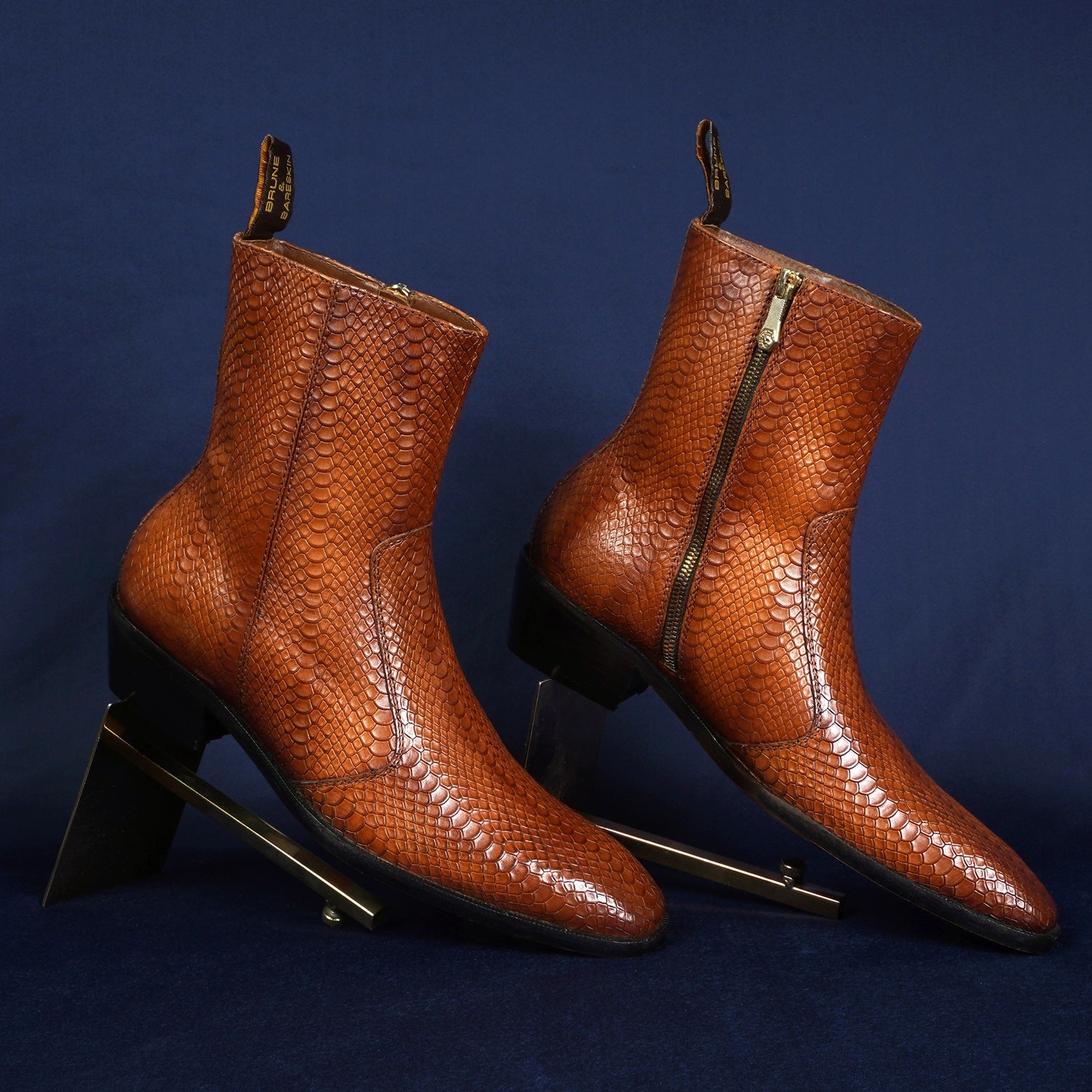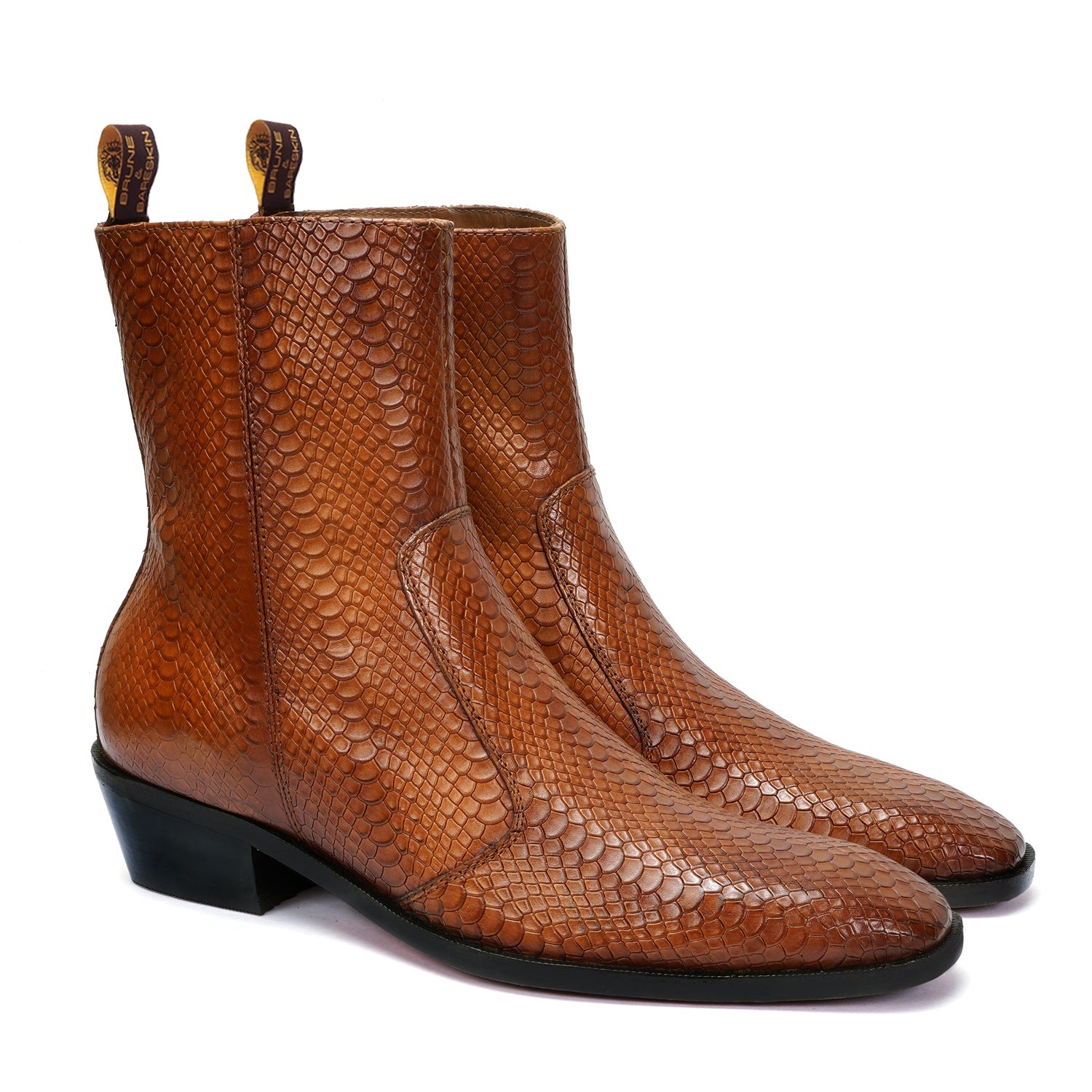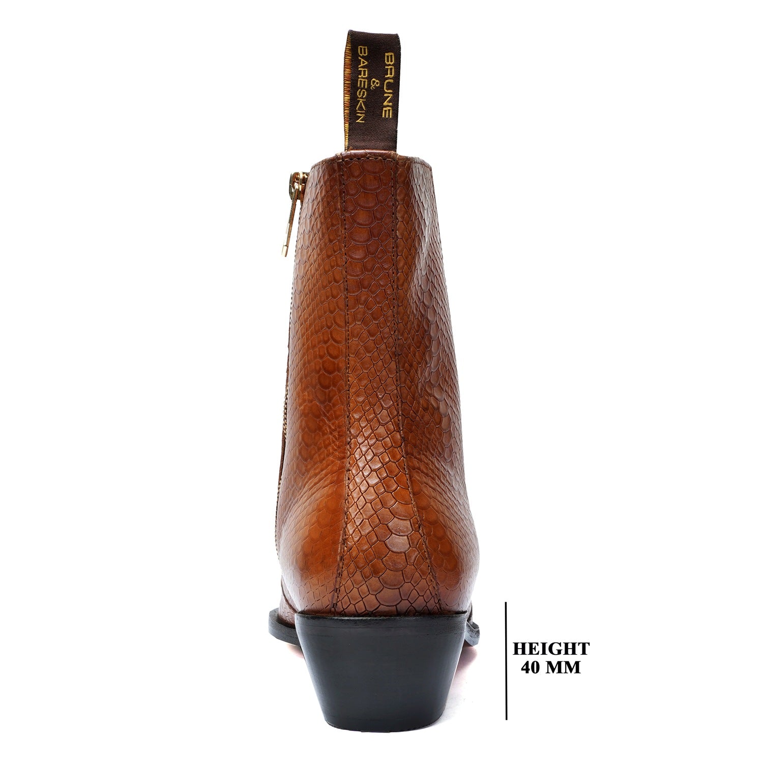 Elevate your style with the Brune & Bareskin Snake Skin Textured Leather Cuban Boots in Tan color. These expertly hand-crafted Chelsea boots feature premium quality, snake skin textured leather and a 40mm Cuban heel. The stitched detailing on the quarter and patina finish add a touch of sophistication. Designed for a perfect fit with an inner side zipper closure and a leather heel sole, these boots are versatile, blending well with both classic and modern pants.