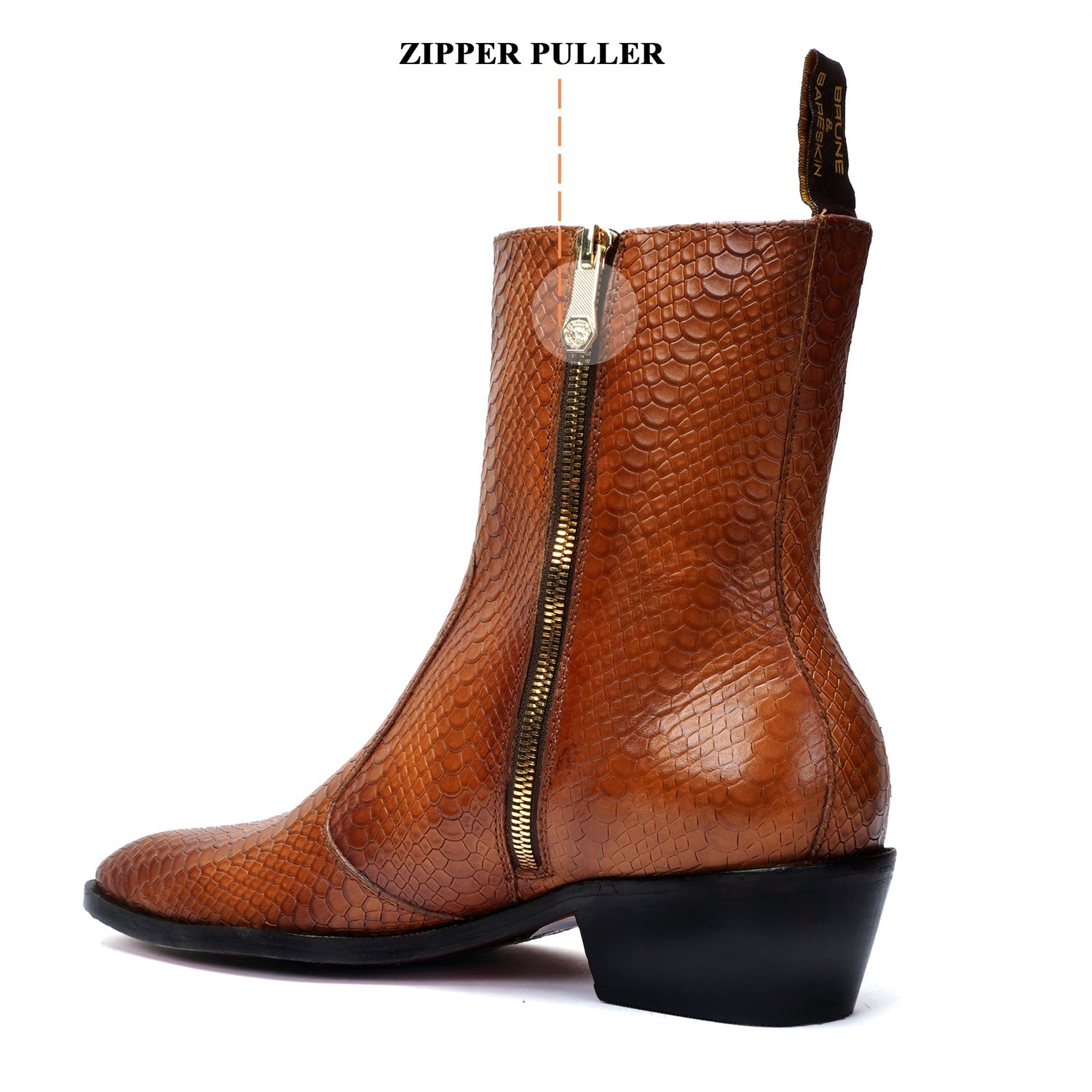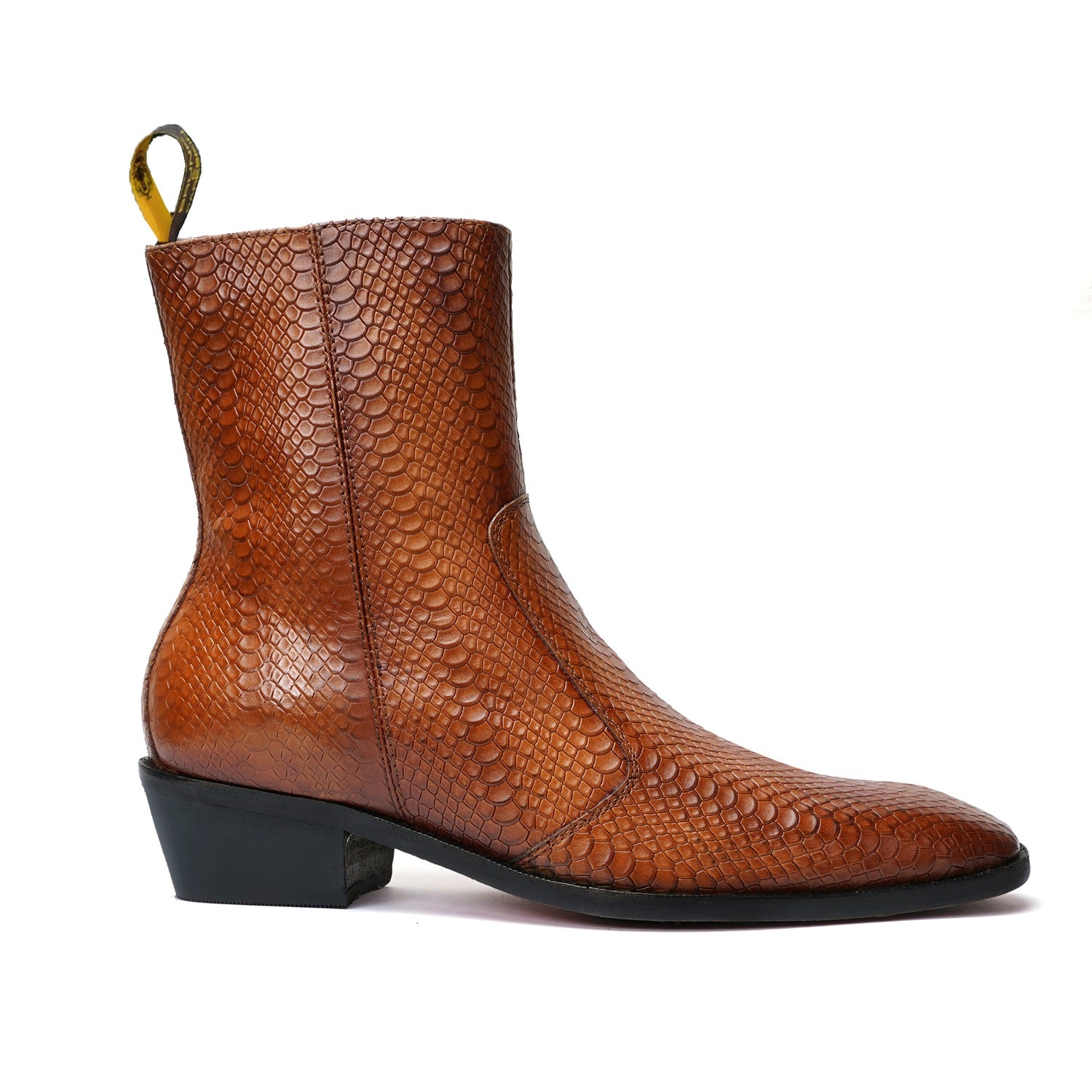 Snake Skin Textured Leather Cuban Boots in Tan Color