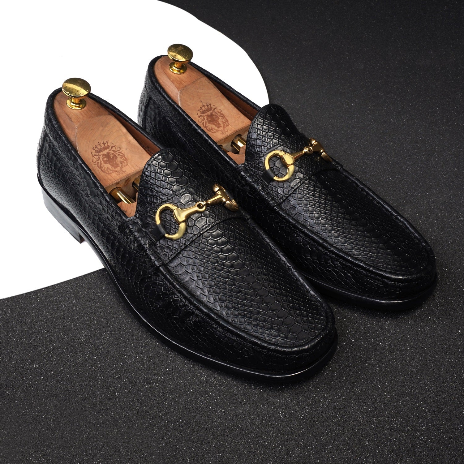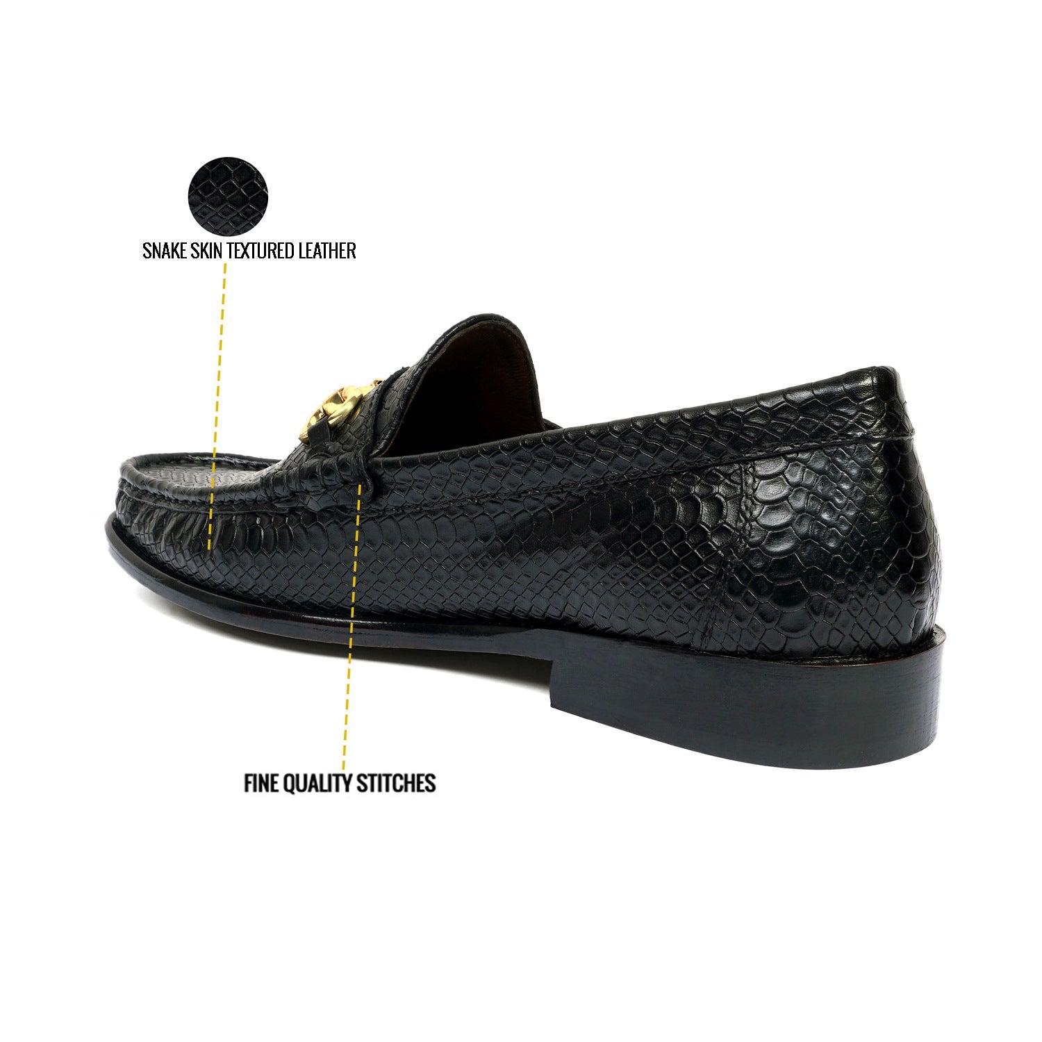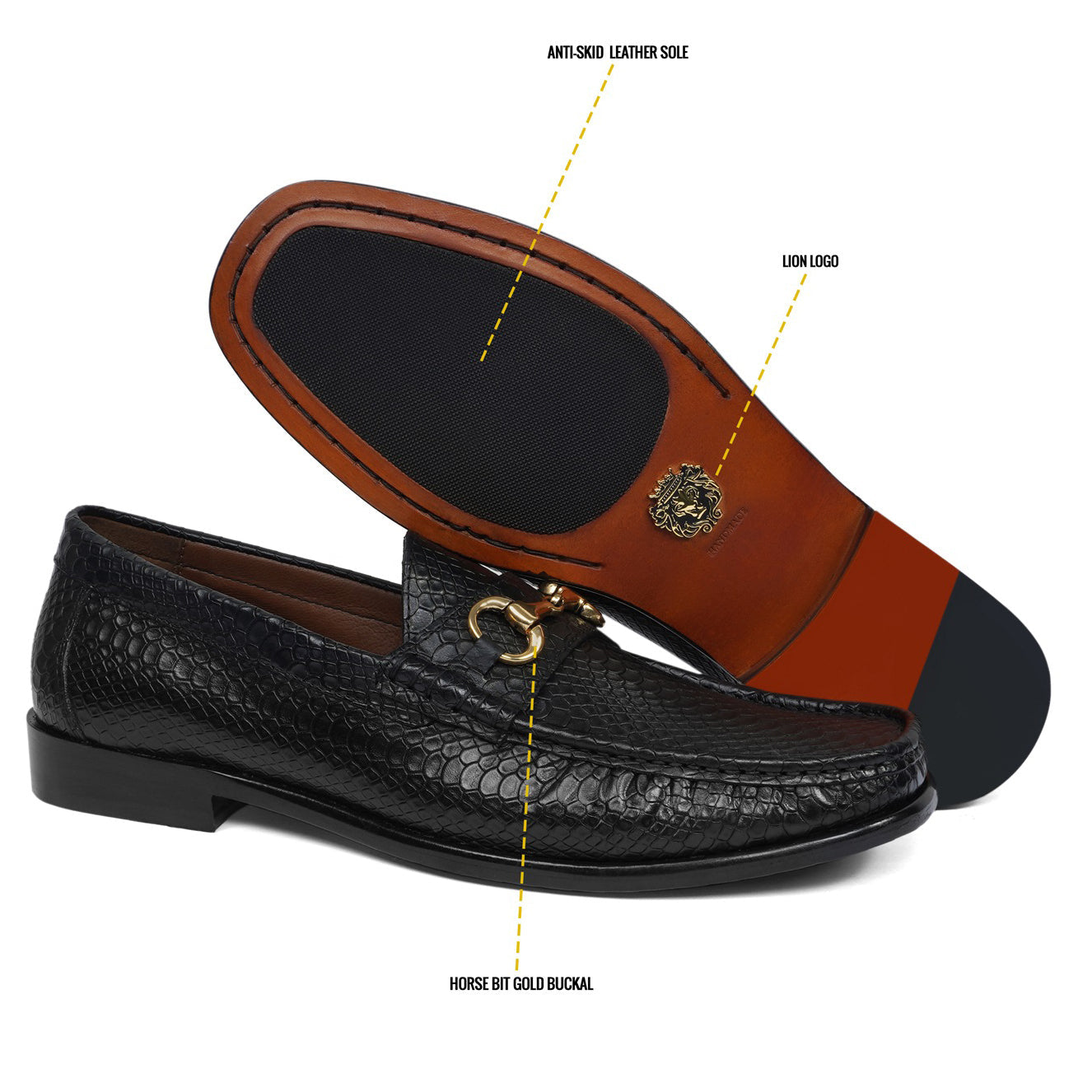 A modern twist on the classic Loafers is style thing to admire. The snake textured print leather looks very elegant. The golden horse-bit on the croco textured brown leather enhances the chic style further. The hand painted burnished effect on the genuine leather surface showcases the masterpiece level art. The contrasting leather sole glorifies the overall accent of the shoe.