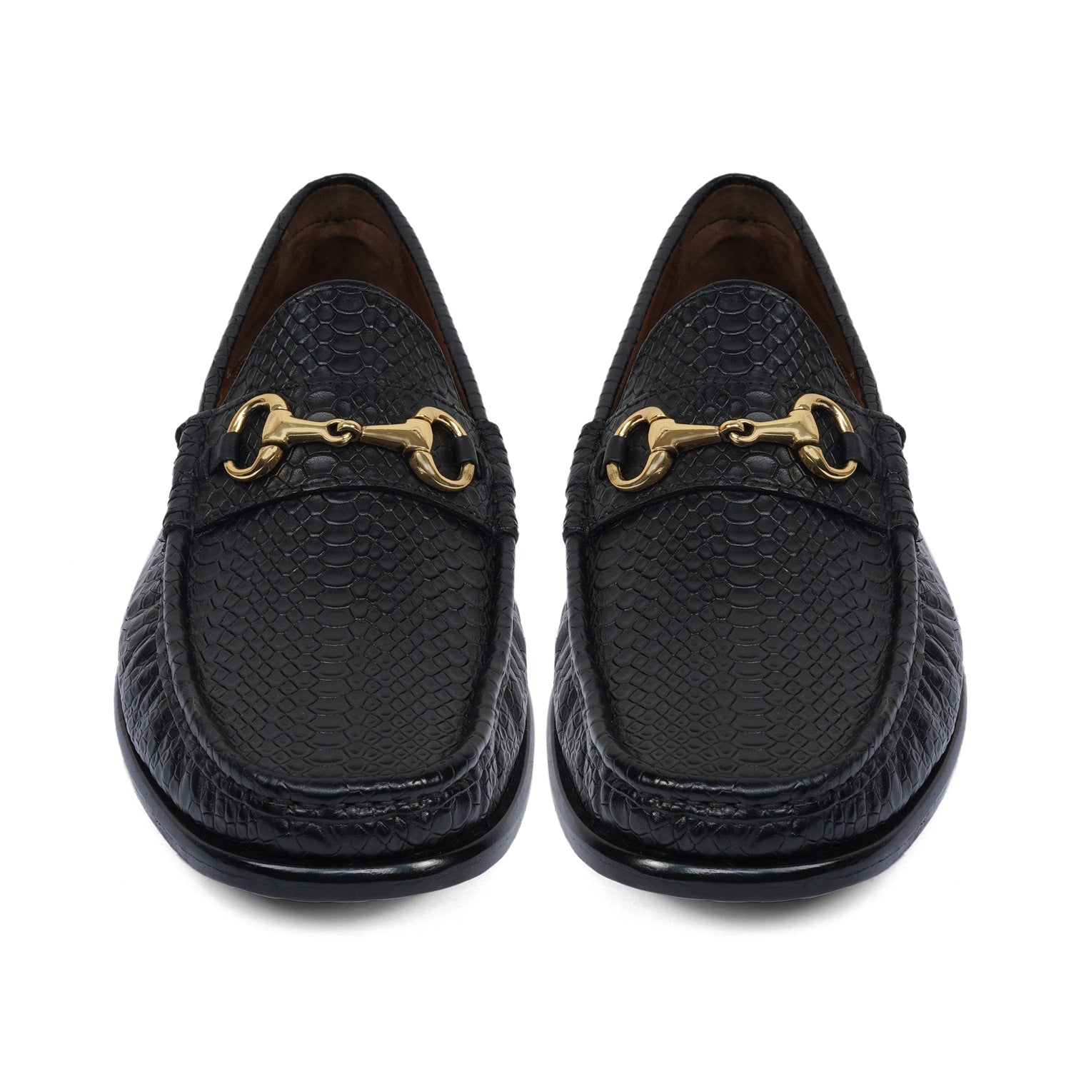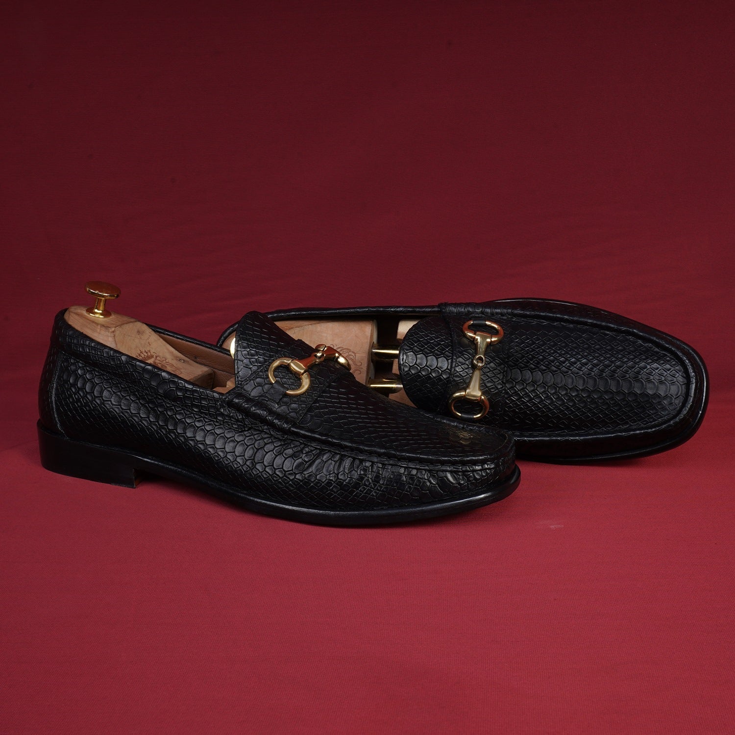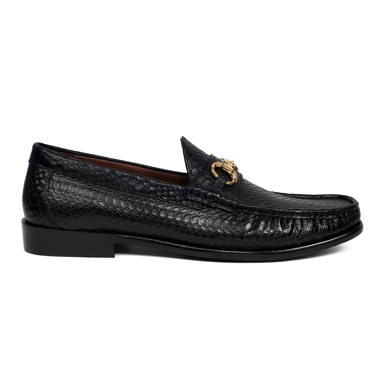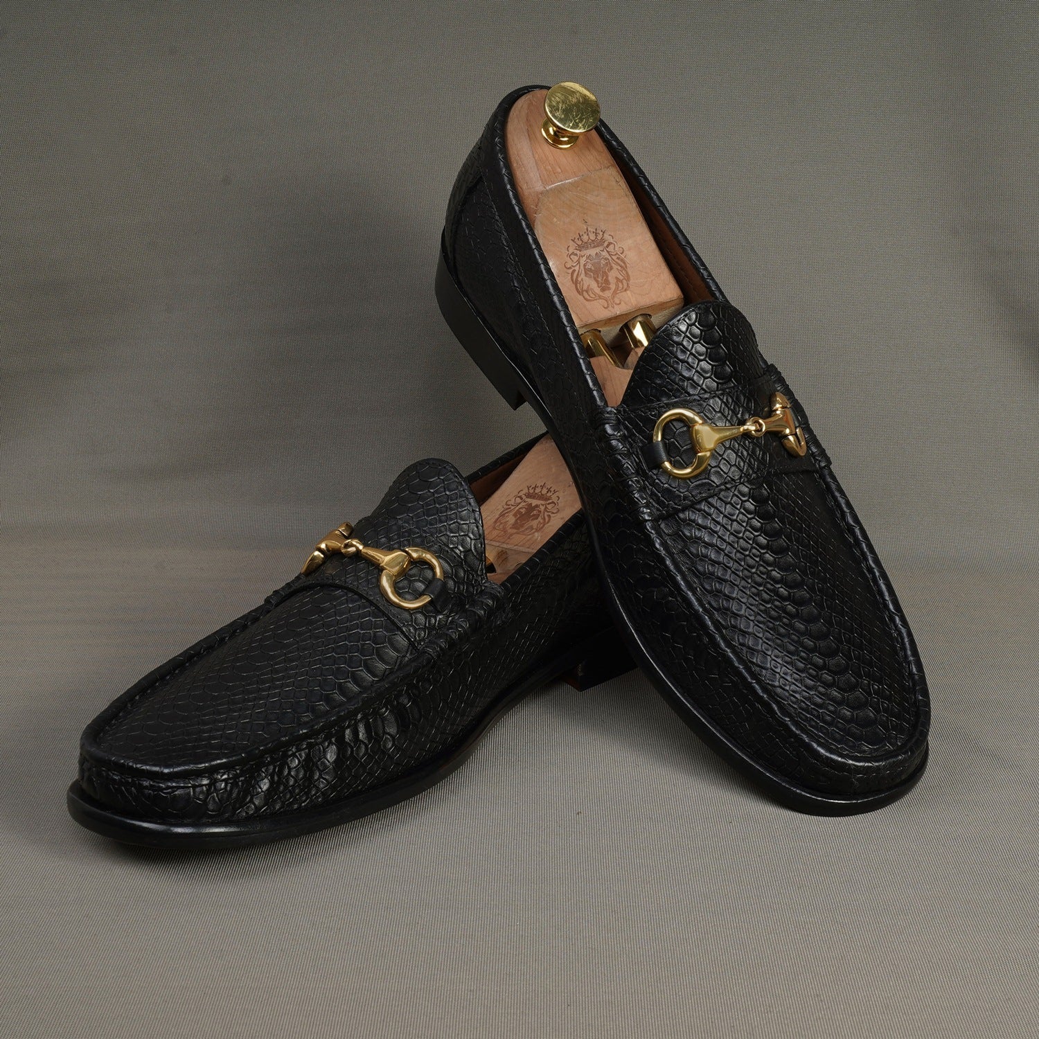 A modern twist on the classic Loafers is style thing to admire. The snake textured print leather looks very elegant. The golden horse-bit on the croco textured brown leather enhances the chic style further. The hand painted burnished effect on the genuine leather surface showcases the masterpiece level art. The contrasting leather sole glorifies the overall accent of the shoe.