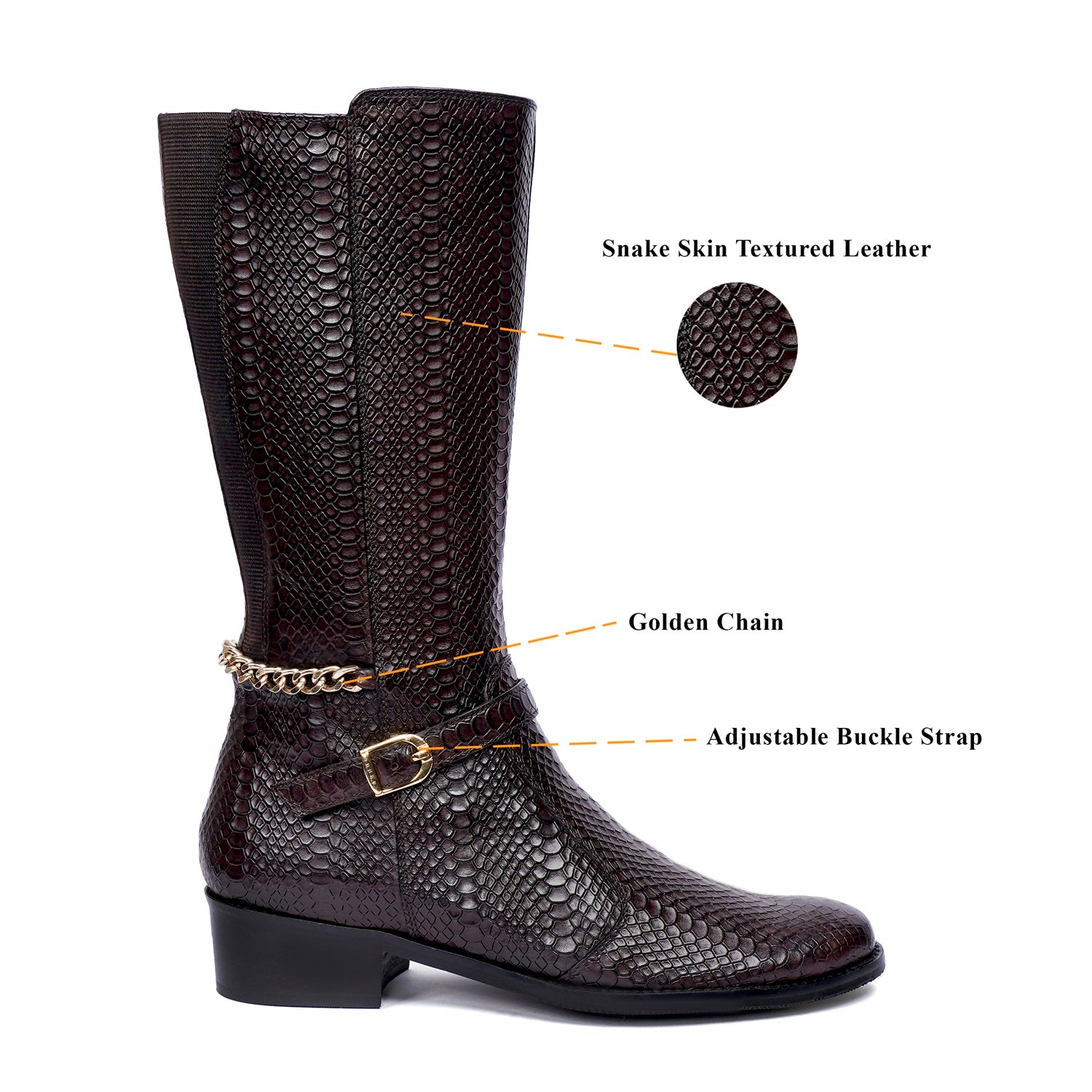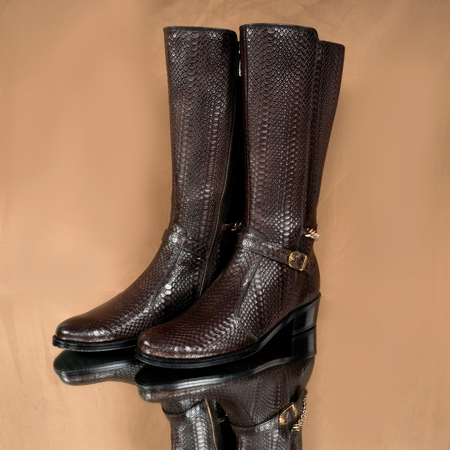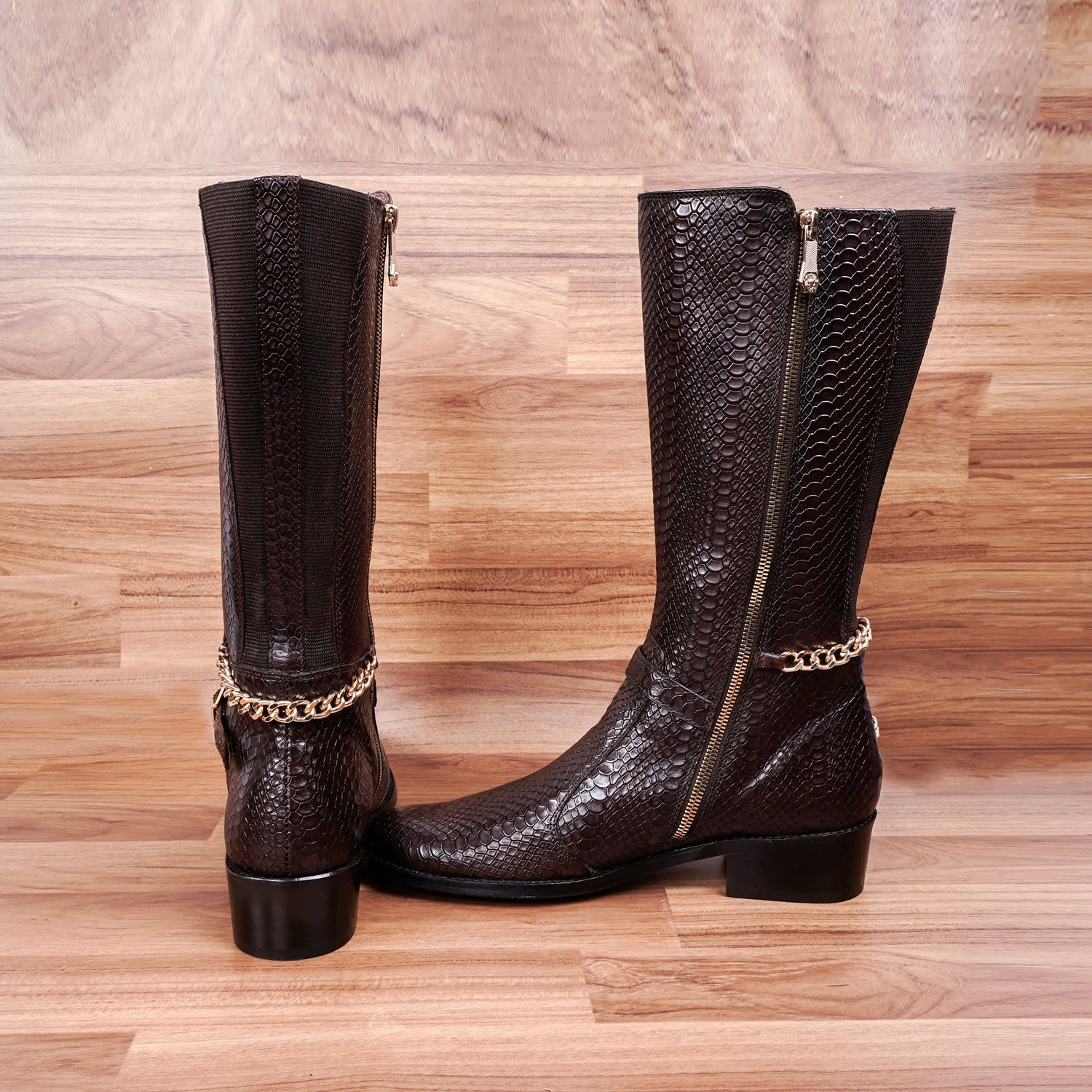 Stylish women’s dark brown boots crafted in premium snake-textured leather, detailed with a golden chain and side buckle for a bold, elegant look. Features an easy side zip closure and anti-skid leather sole for comfort, safety, and everyday wear.