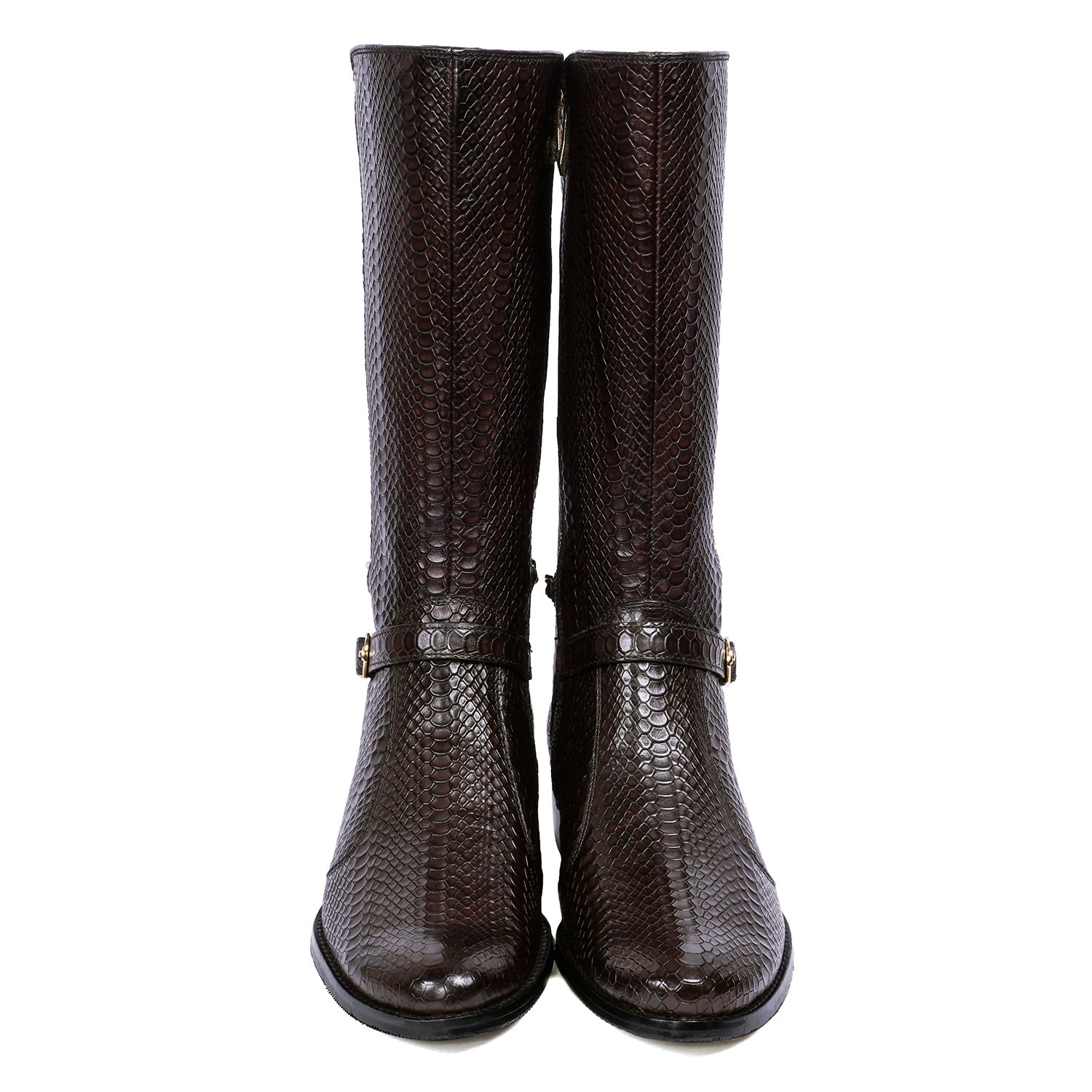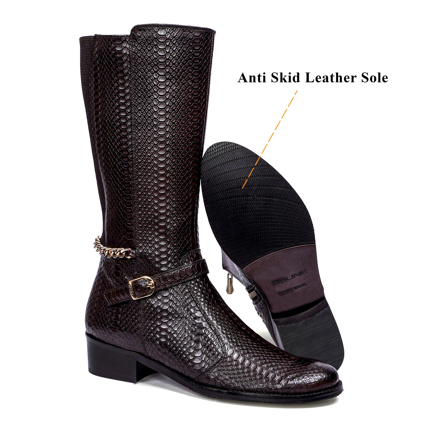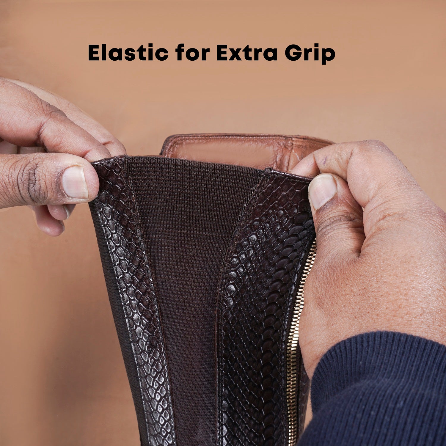 Stylish women’s dark brown boots crafted in premium snake-textured leather, detailed with a golden chain and side buckle for a bold, elegant look. Features an easy side zip closure and anti-skid leather sole for comfort, safety, and everyday wear.