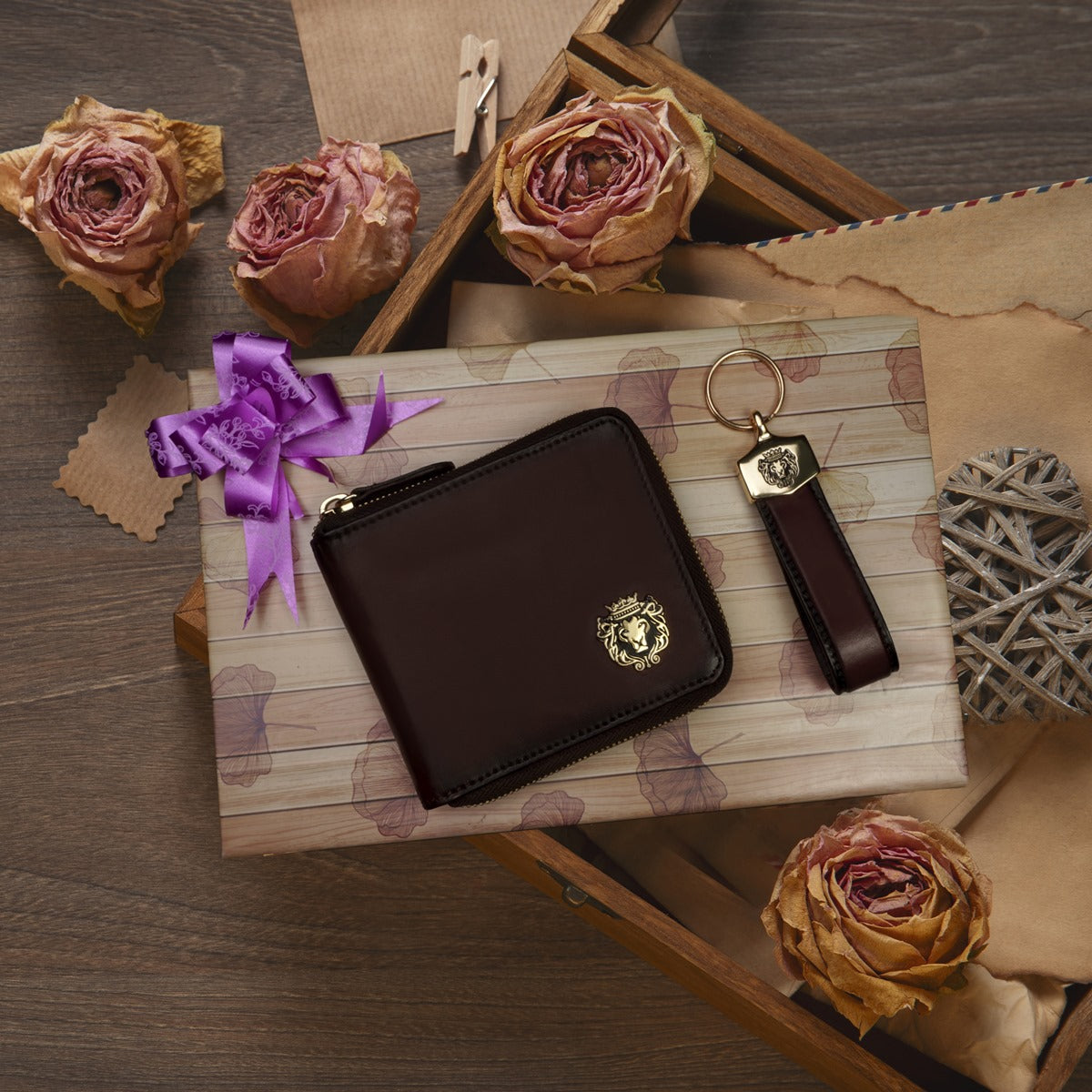 Introducing the exquisite special gifting combo pack by Brune & Bareskin, featuring a luxurious dark brown genuine leather zipper wallet and a complementing key chain. Crafted with meticulous attention to detail and hand-made artistry, this combo pack is a perfect blend of style, functionality, and elegance. The wallet is constructed from high-quality dark brown genuine leather, exuding a sense of sophistication and timelessness. The leather not only feels sumptuously soft to the touch but also ages beautifully, gaining character and personality over time. Its deep brown hue adds a touch of richness to your accessory collection. The combo pack also includes a matching key chain, which complements the wallet's design. The key chain features the same dark brown genuine leather and golden-finish lion logo, creating a harmonious duo that reflects your impeccable taste. Whether you're looking for a remarkable gift for a loved one or a statement accessory for yourself, the special gifting combo pack by Brune & Bareskin is a masterpiece that embodies elegance, luxury, and a touch of understated opulence. What are you waiting for? You can click on CUSTOMIZE NOW Button (Just above the "ADD TO CART" button) & fill the form to submit your customization requirements. Or you can reach us by Call, Email, WhatsApp, and DM.