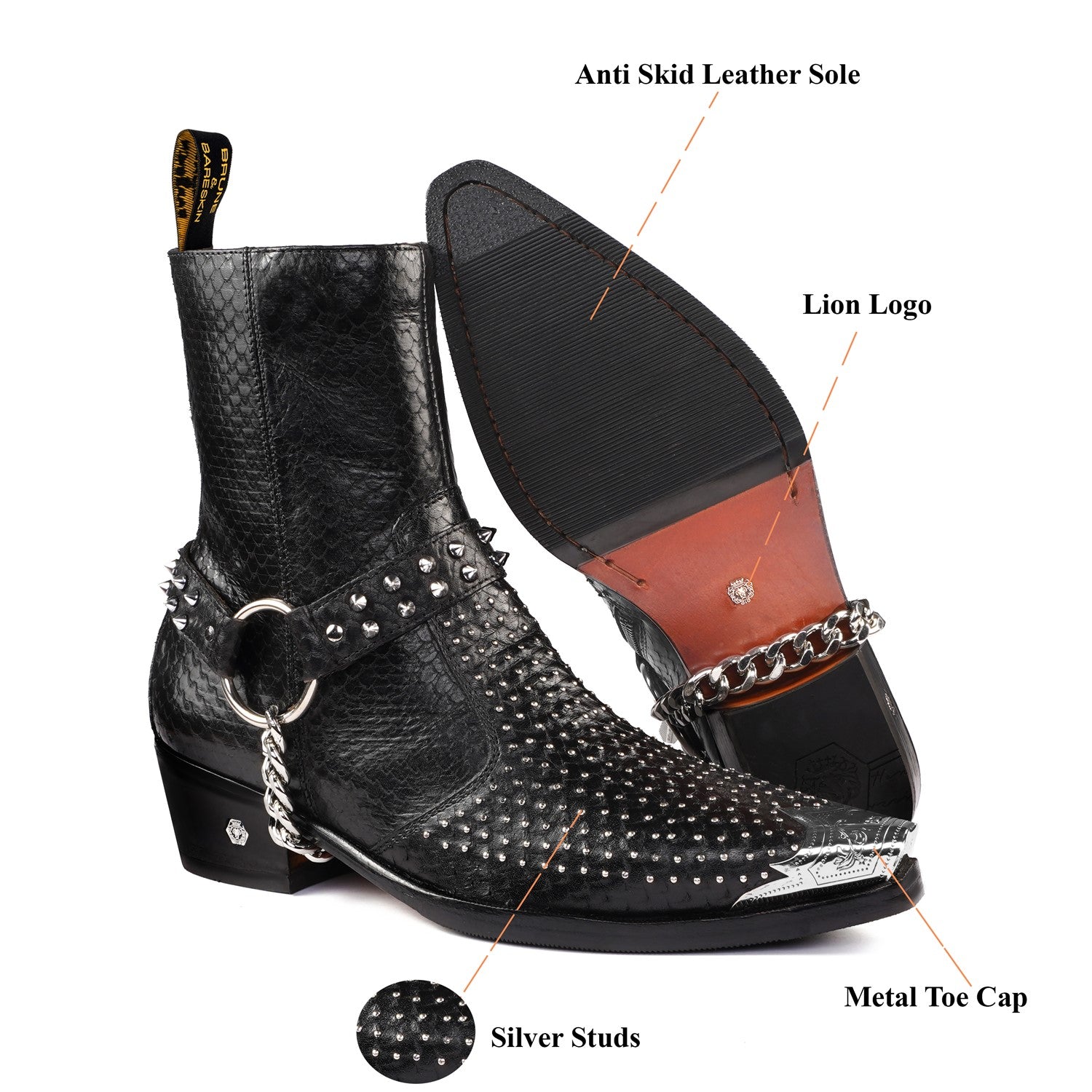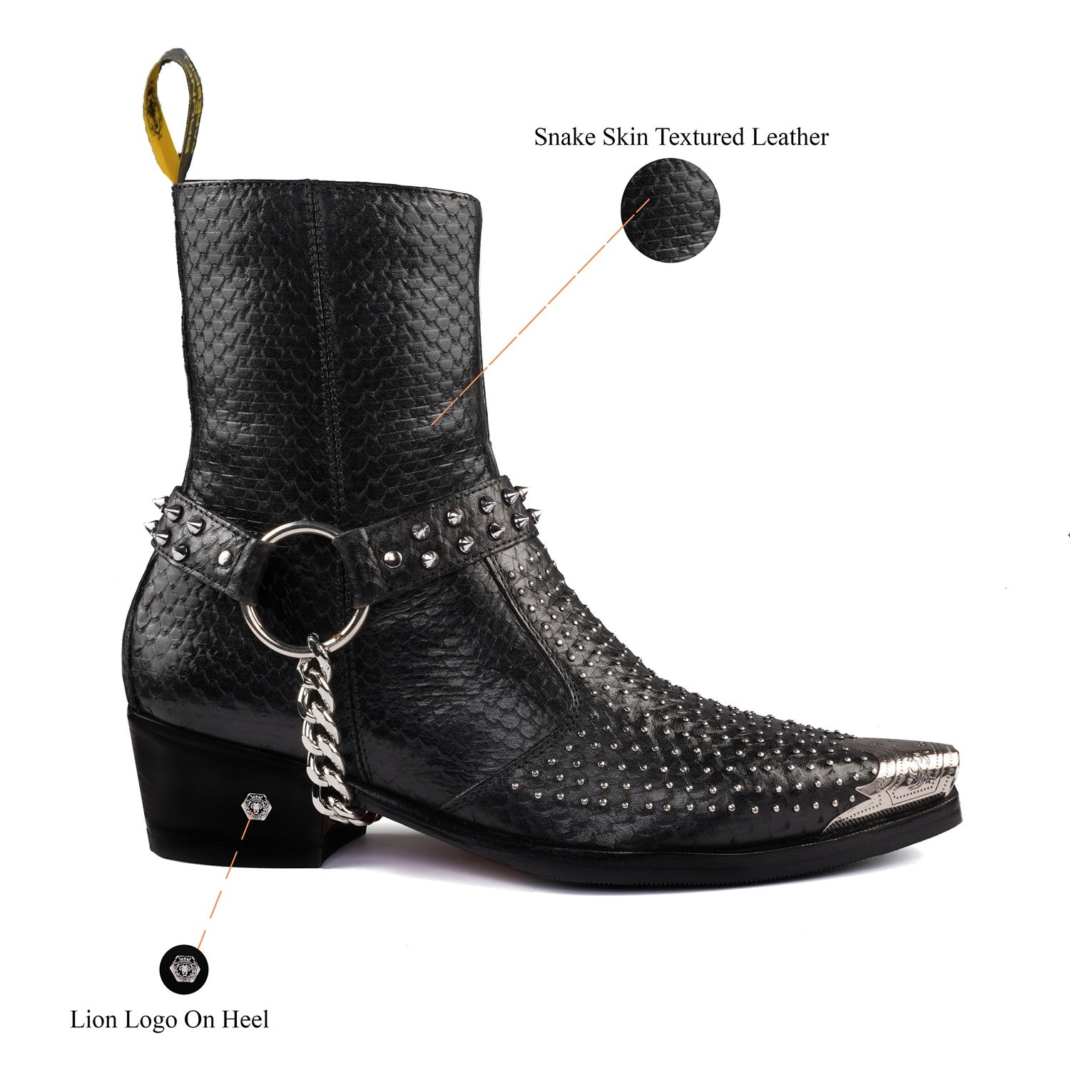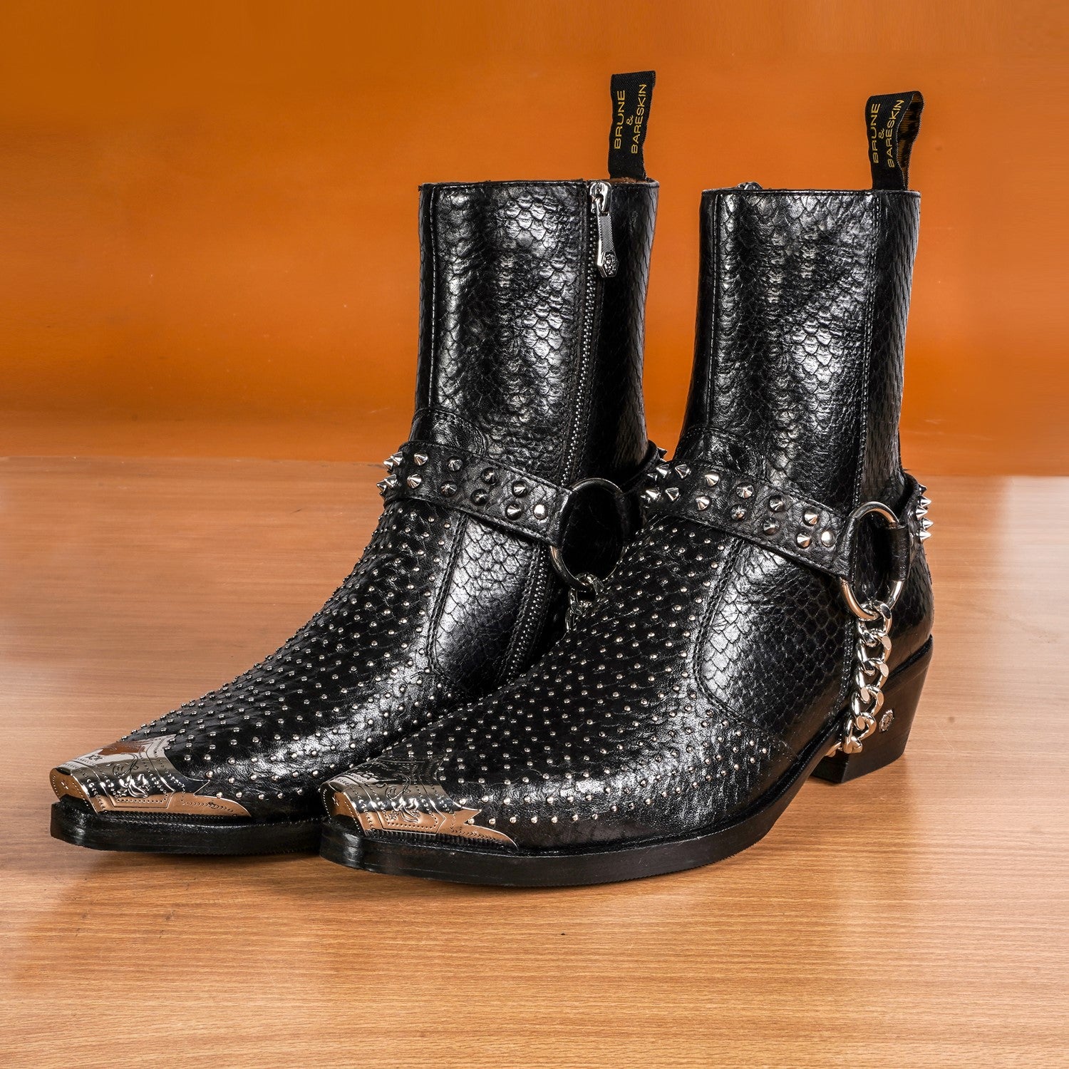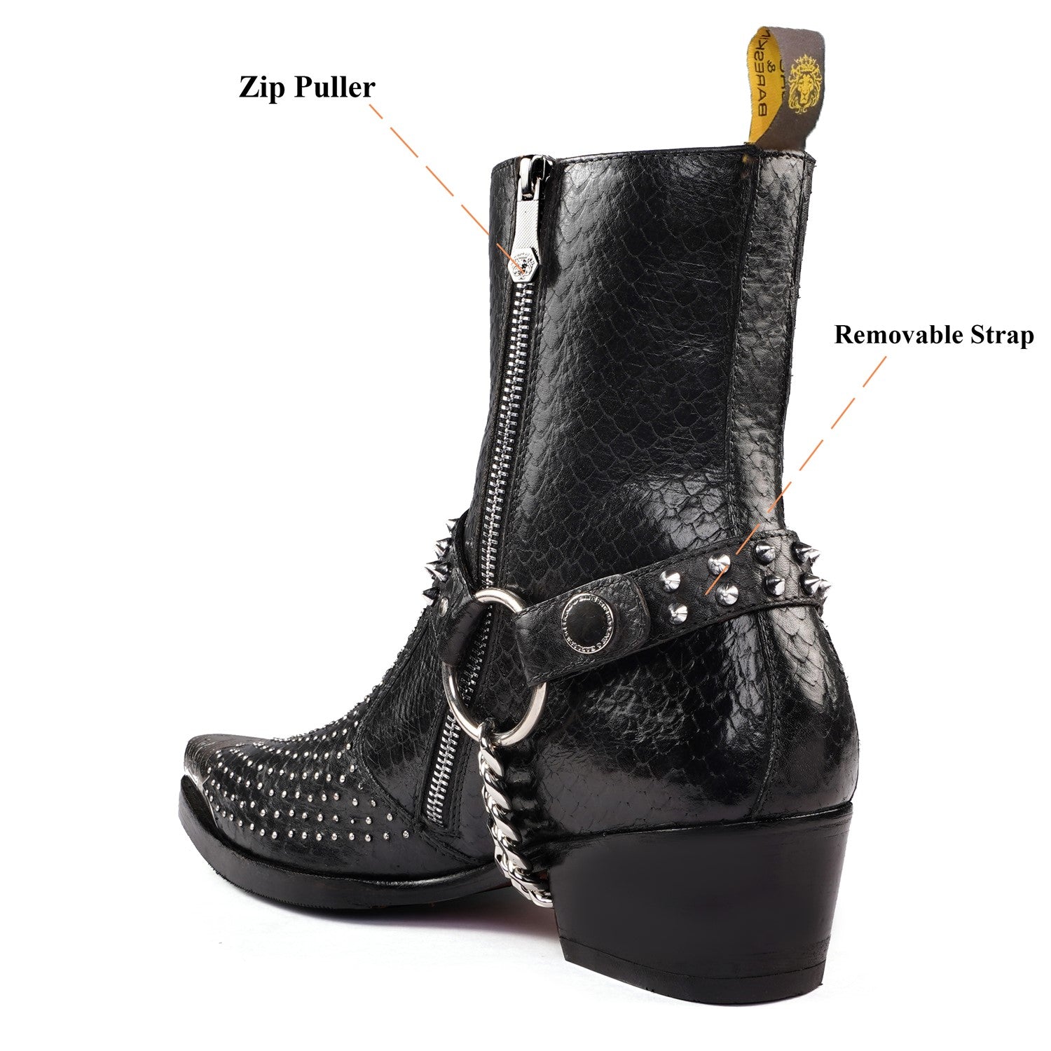 Introducing our Metallic Cap Toe Cowboy Boot in Black Leather - the perfect choice for any social event! Hand crafted from premium quality snake textured leather with removable strap, high ankle boot features a classic cow boy style with a unique touch of a metallic cap toe. With a 40mm cuban heel and extra cushioned footbed, it combines style and comfort. Enjoy a non-slip sole and a hand stitched pointed cap toe detail for added protection. Upgrade your look with brand Brune & Bareskin. You can customize this chic boots in any of your favorite color with our bespoke services.
