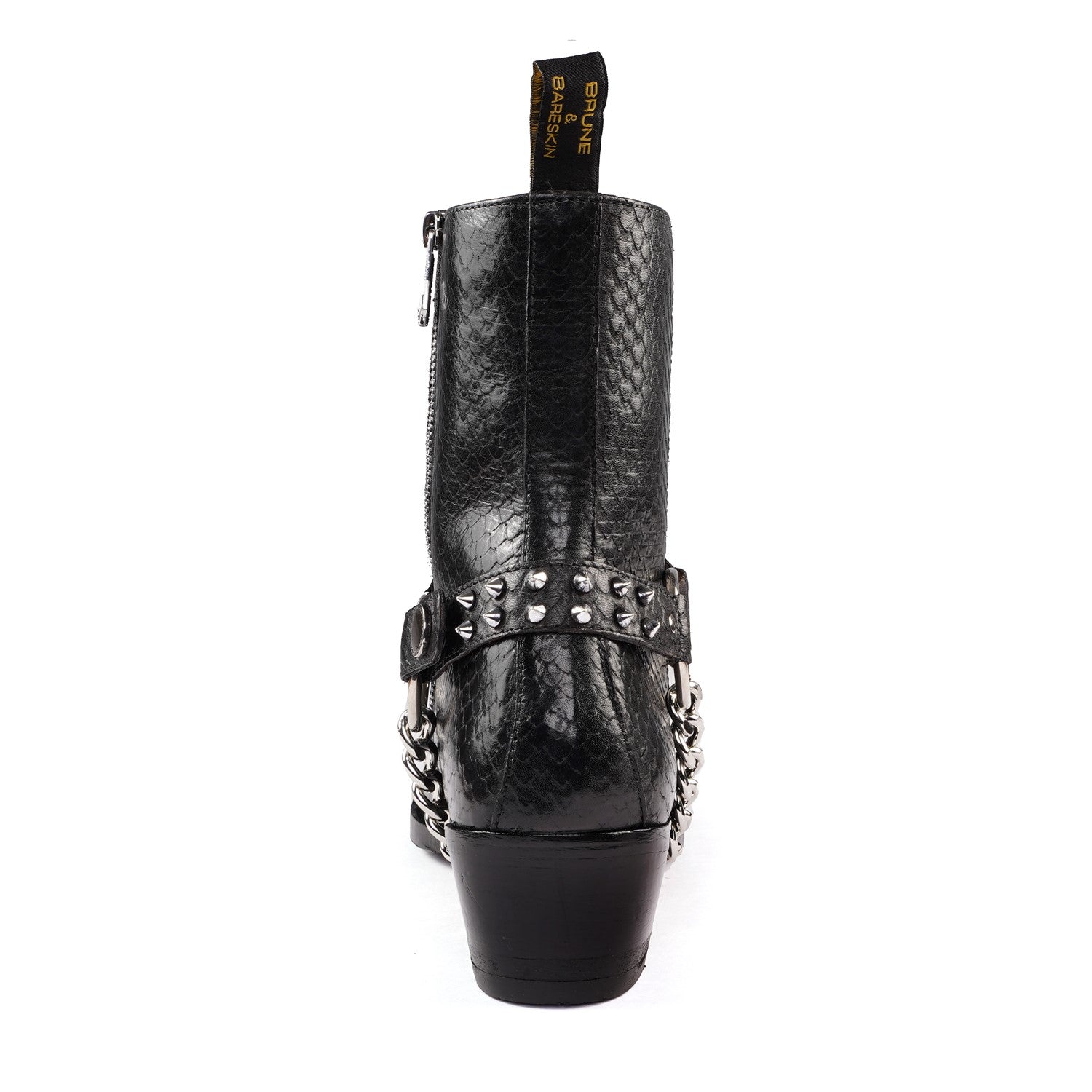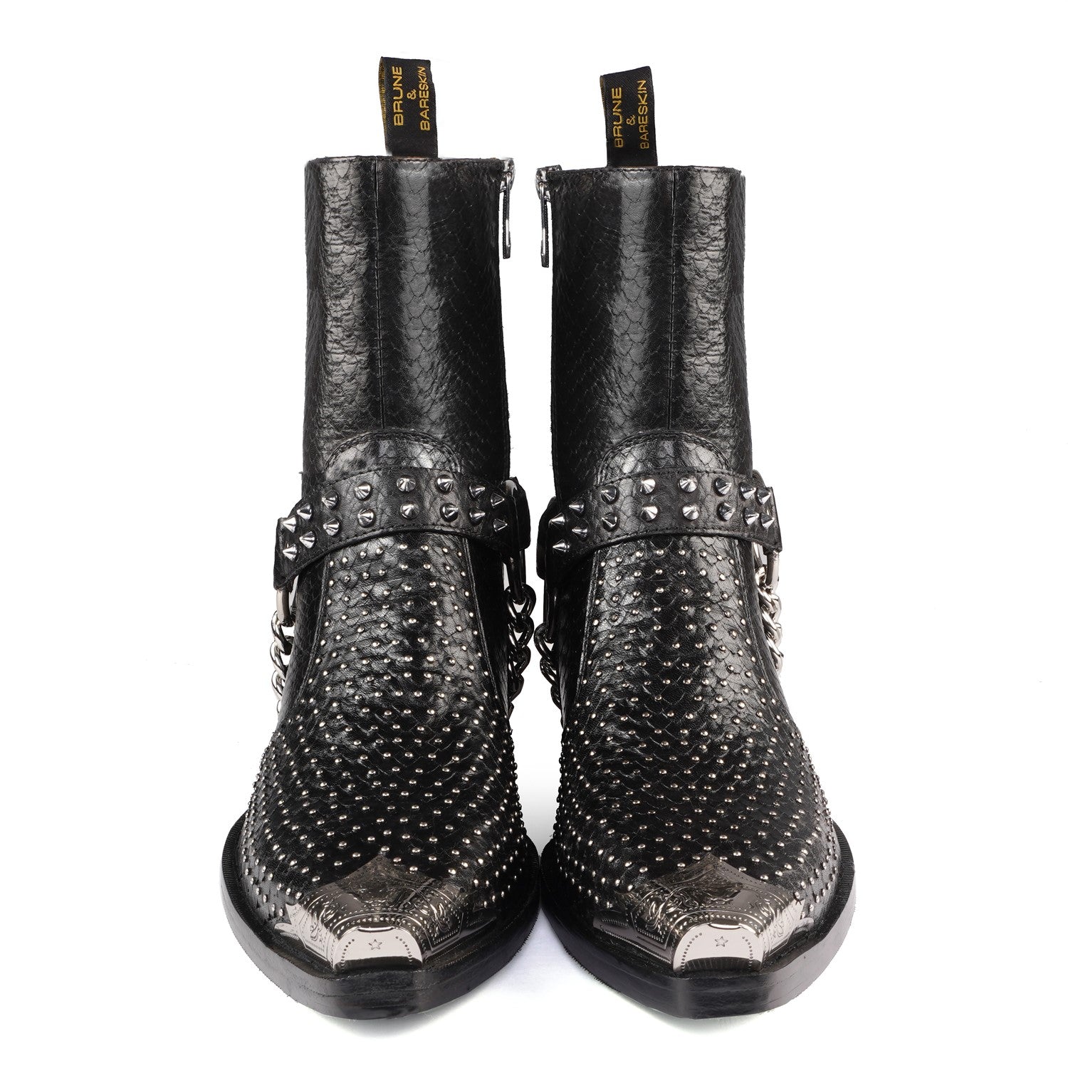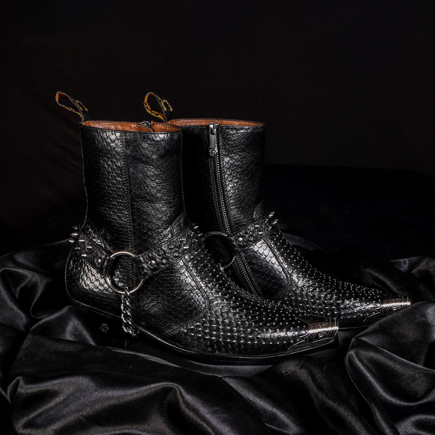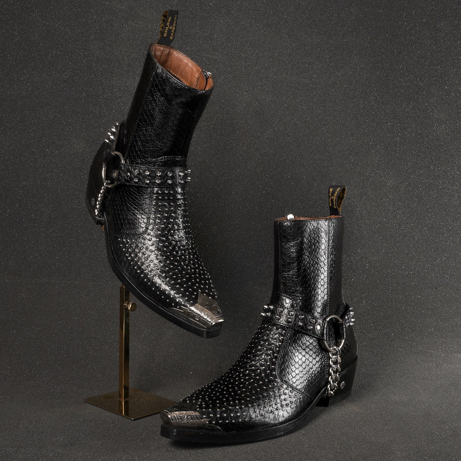 Introducing our Metallic Cap Toe Cowboy Boot in Black Leather - the perfect choice for any social event! Hand crafted from premium quality snake textured leather with removable strap, high ankle boot features a classic cow boy style with a unique touch of a metallic cap toe. With a 40mm cuban heel and extra cushioned footbed, it combines style and comfort. Enjoy a non-slip sole and a hand stitched pointed cap toe detail for added protection. Upgrade your look with brand Brune & Bareskin. You can customize this chic boots in any of your favorite color with our bespoke services.