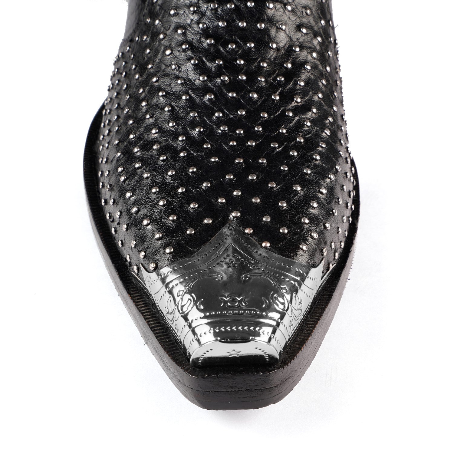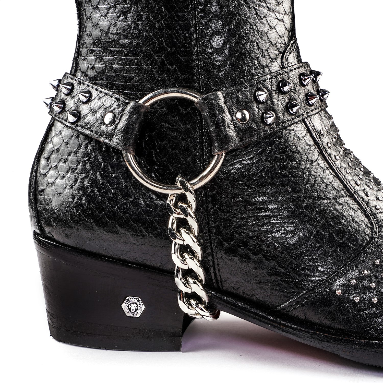 A distinctive silver studded chain wraps around the ankle, adding a touch of rebellious flair to the classic cowboy silhouette.