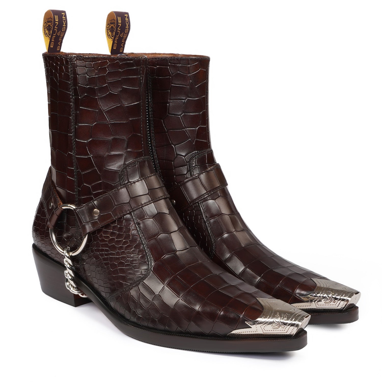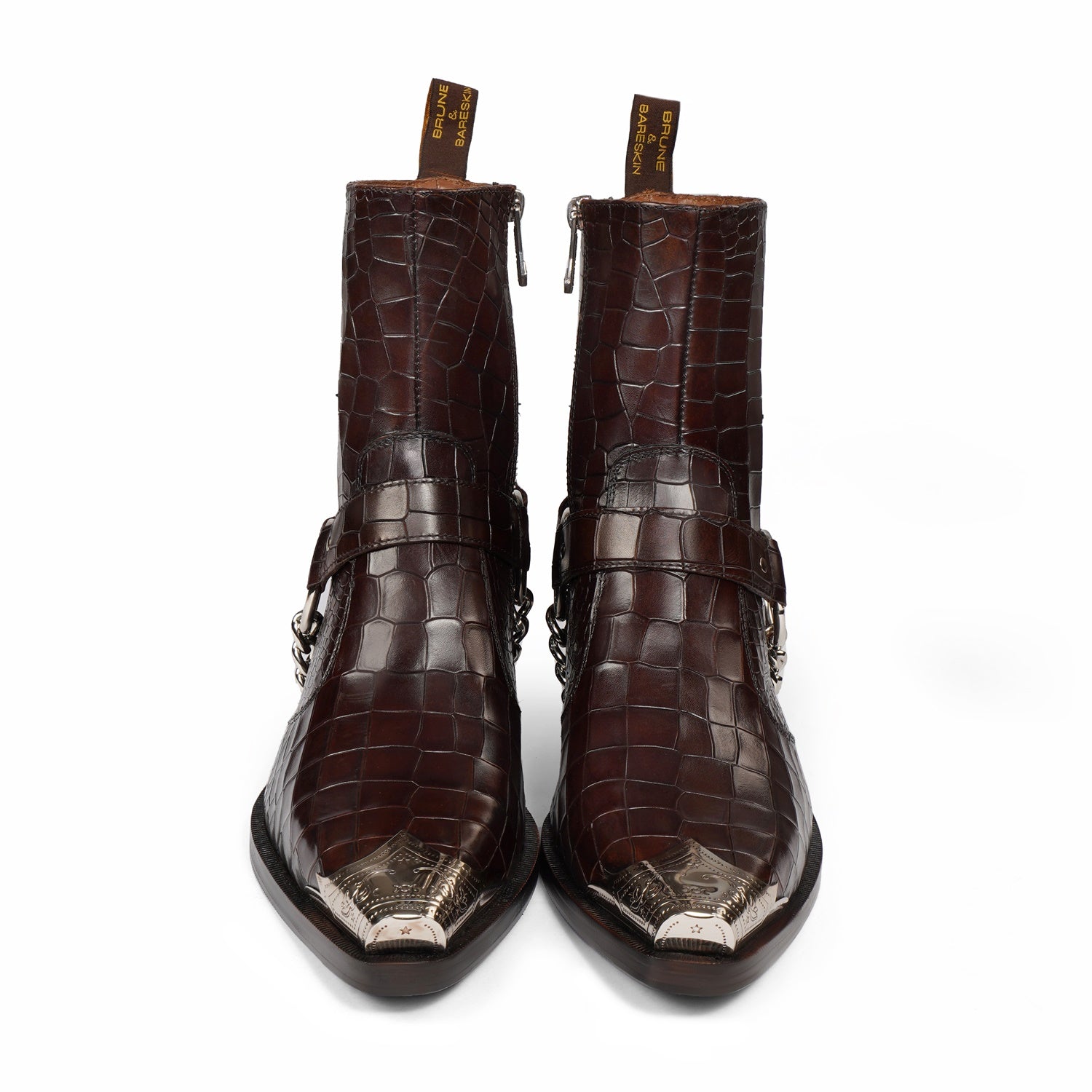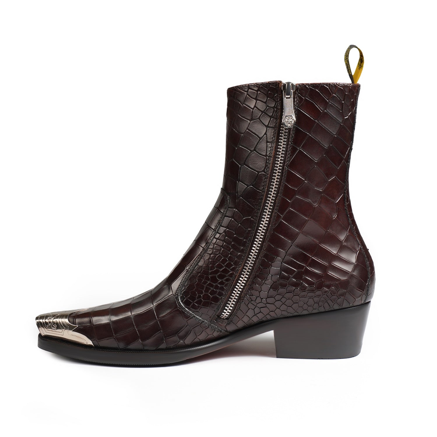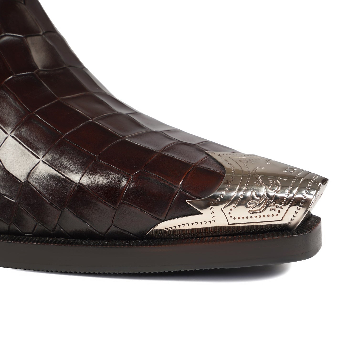 Introducing our Metallic Cap Toe Cowboy Boot in Dark Brown Leather - the perfect choice for any social event! Hand crafted from premium quality croco textured leather, this high ankle boot features a classic cow boy style with a unique touch of a metallic cap toe. With a 40mm cuban heel and extra cushioned footbed, it combines style and comfort. Enjoy a non-slip sole and a hand stitched pointed cap toe detail for added protection. Upgrade your look with brand brune & bareskin. You can customize this chic boots in any of your favorite color with our bespoke services.