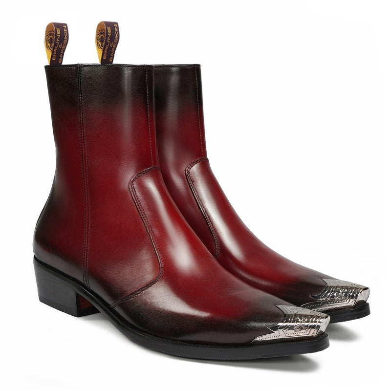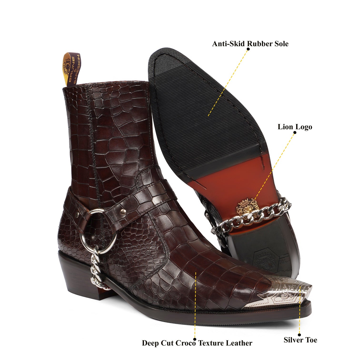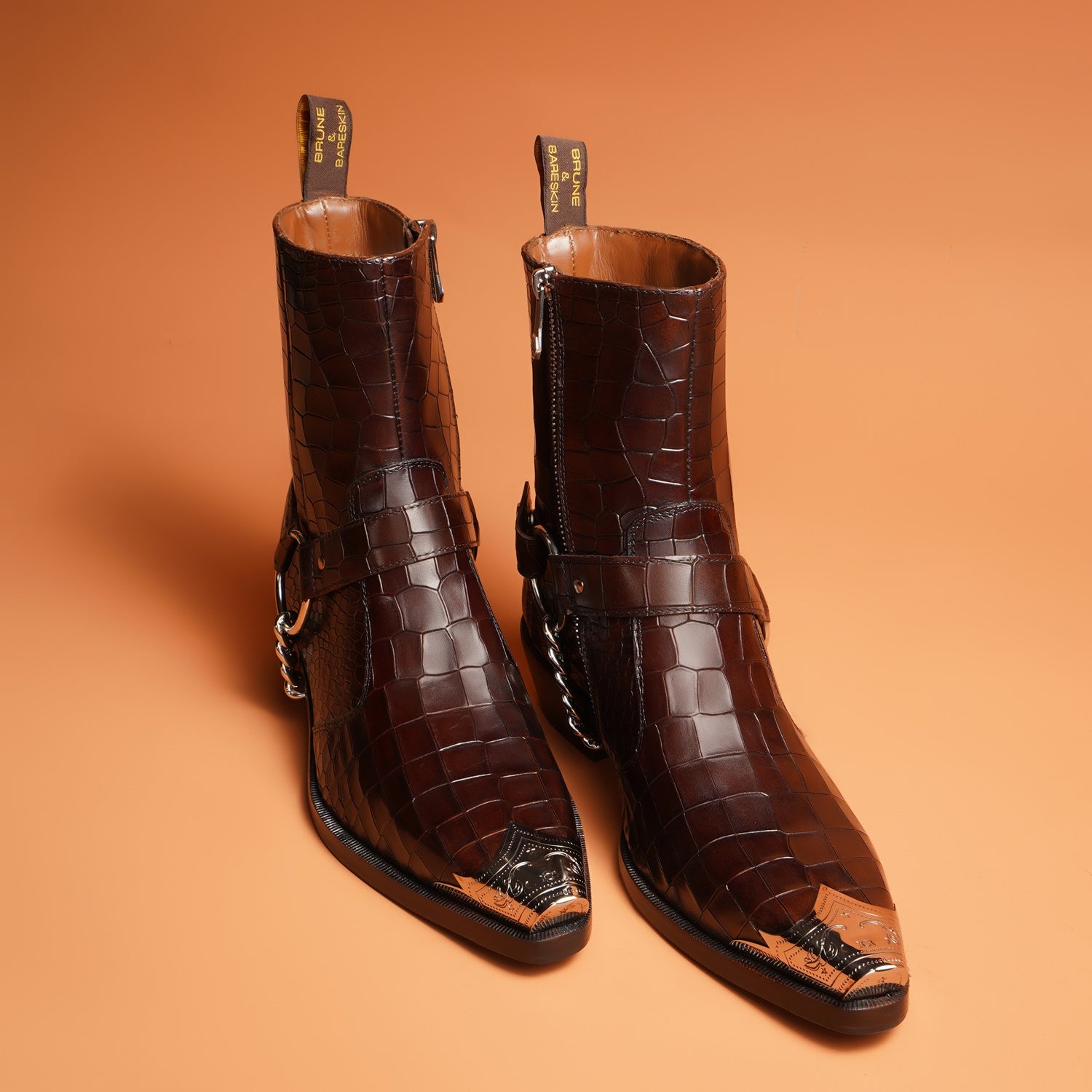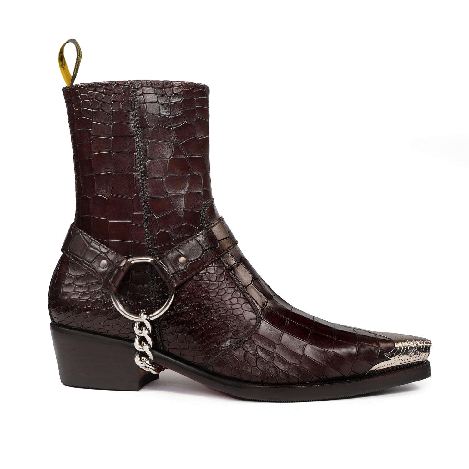 Introducing our Metallic Cap Toe Cowboy Boot in Dark Brown Leather - the perfect choice for any social event! Hand crafted from premium quality croco textured leather, this high ankle boot features a classic cow boy style with a unique touch of a metallic cap toe. With a 40mm cuban heel and extra cushioned footbed, it combines style and comfort. Enjoy a non-slip sole and a hand stitched pointed cap toe detail for added protection. Upgrade your look with brand brune & bareskin. You can customize this chic boots in any of your favorite color with our bespoke services.
