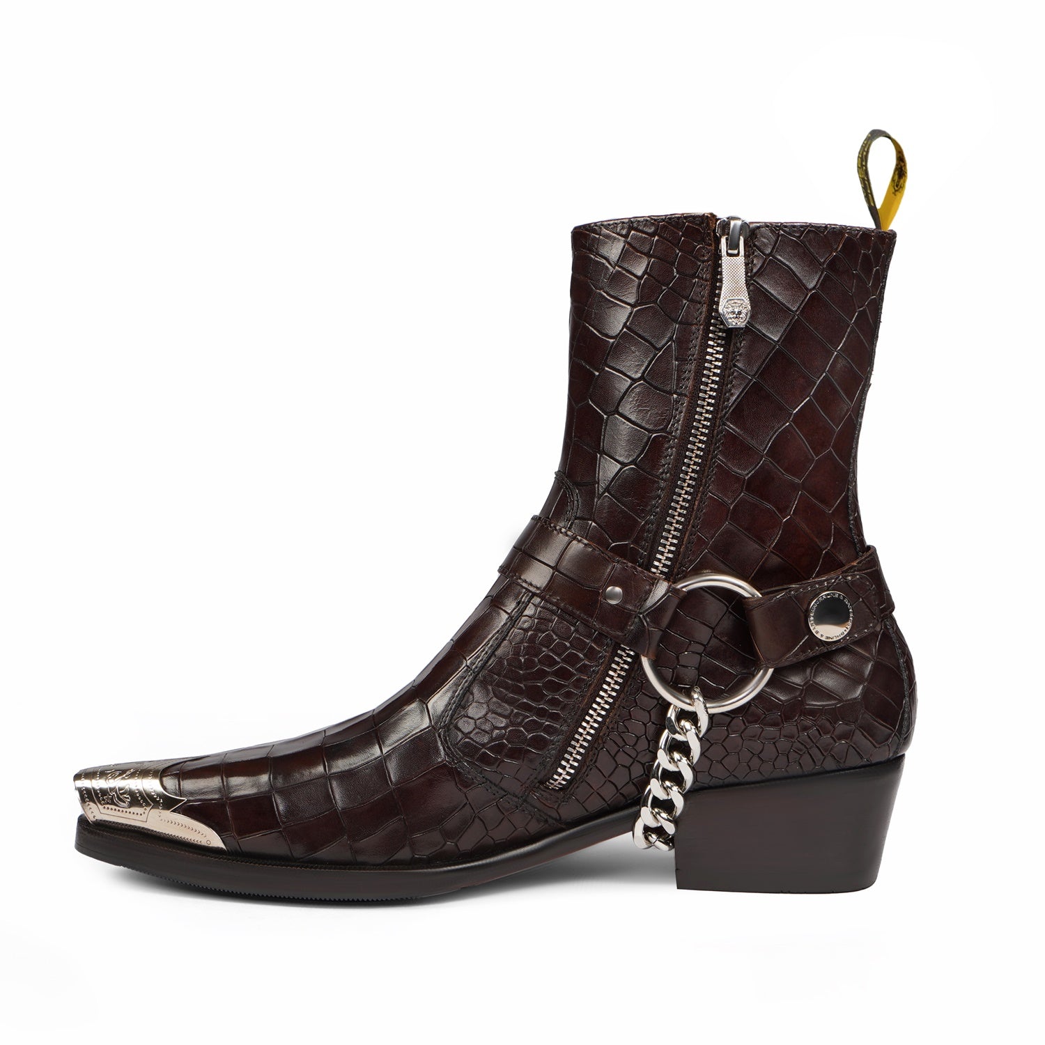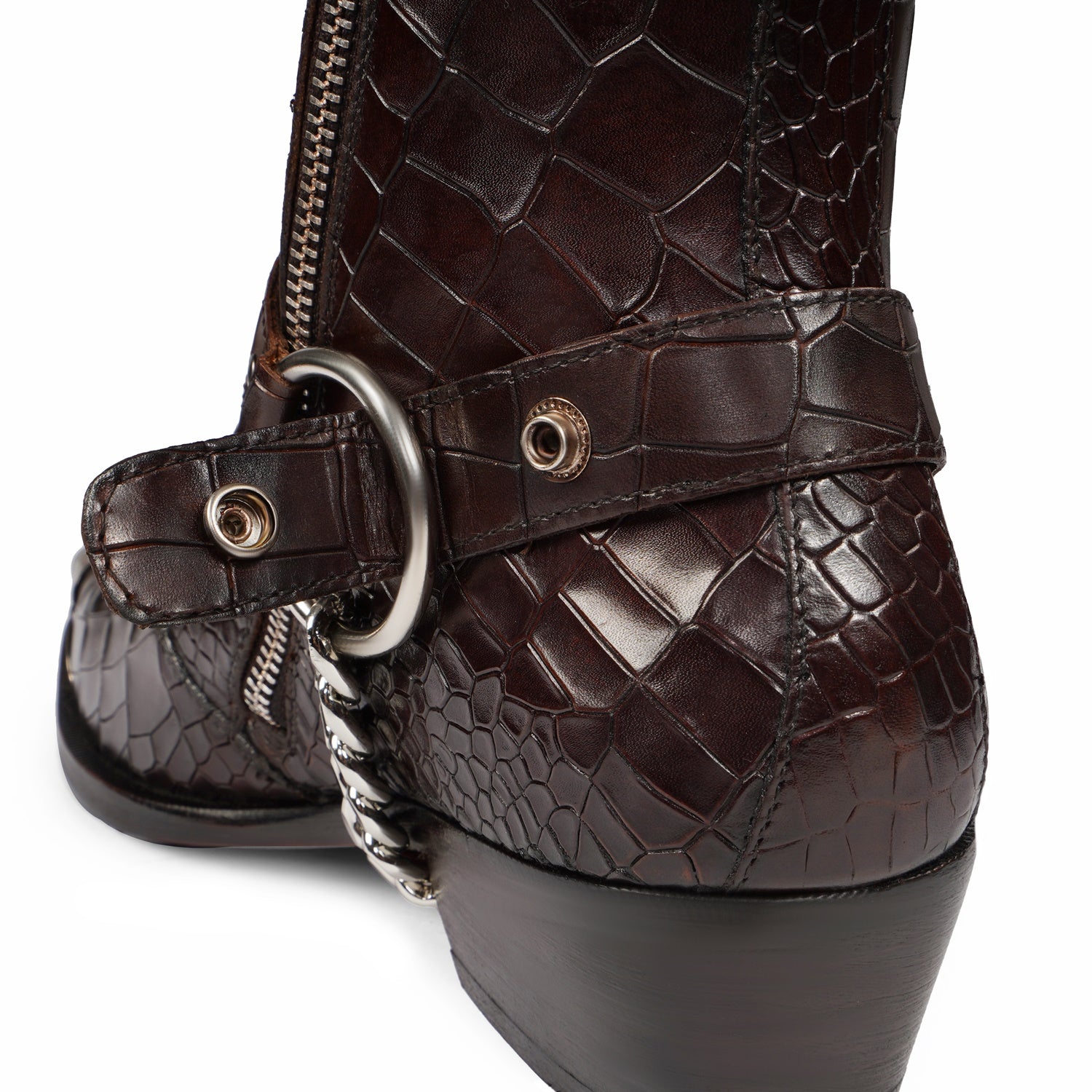 A distinctive silver studded chain wraps around the ankle, adding a touch of rebellious flair to the classic cowboy silhouette.