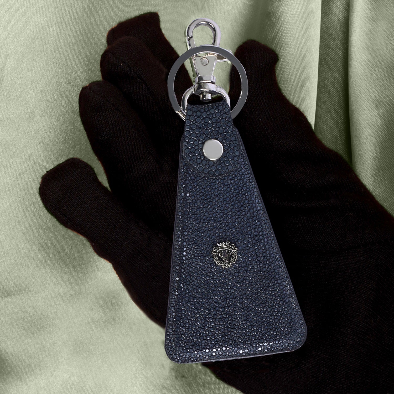 This grey exotic stingray fish leather Key-Chain is made to give you a completely elegant look. It's key chain of hand-finished stingray fish genuine leather with sure-to-be satisfied fit and style. Stingray leather made with the skin of stingray fish. This hide is covered in countless tiny calcium-rich bubbles that resist scratching, scuffing, and puncturing with ease aside from its beauty; stingray skin is a very durable material that it is perfect for the for the your accessories are subjected to. This catch lock design can be used to hang to the bag or belt loop of pant or jeans. The quality of leather Key-chain ranks high on durability and style factors. This elegant triangular shape key-chain is a must-have travel accessory. The two BRUNE & BARESKIN signature silver lion brand logo increases the style quotient. stingray fish leather is used for making your style. The silver finished fitting compliments it's overall color. Brune & Bareskin's signature lion logo on the center looks very chic. This leather has a natural shine which only increases with regular usage. Due to its superior quality & ultra durability it can last for 4 decades easily. It is water & scratch resistant.