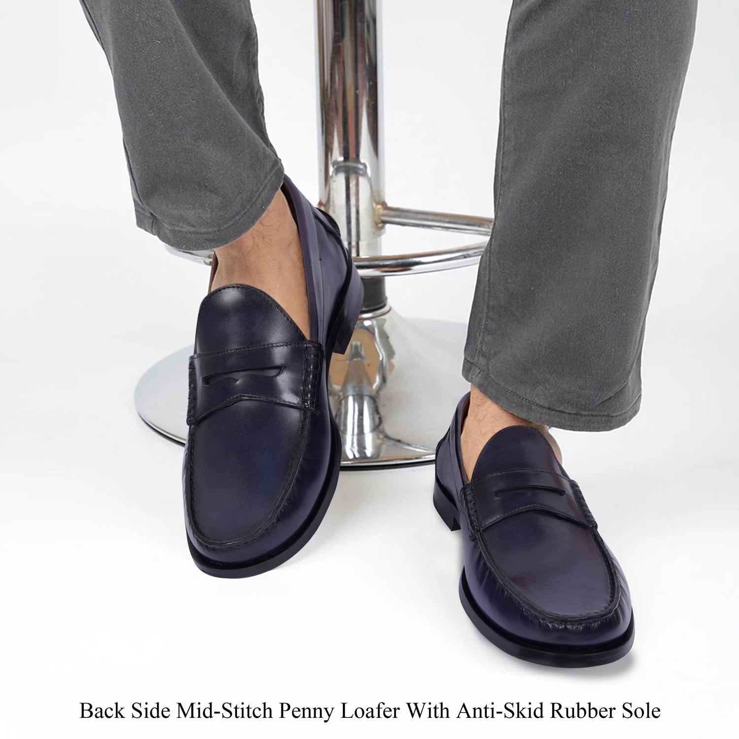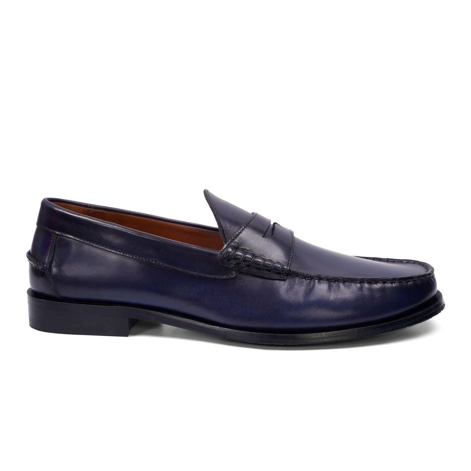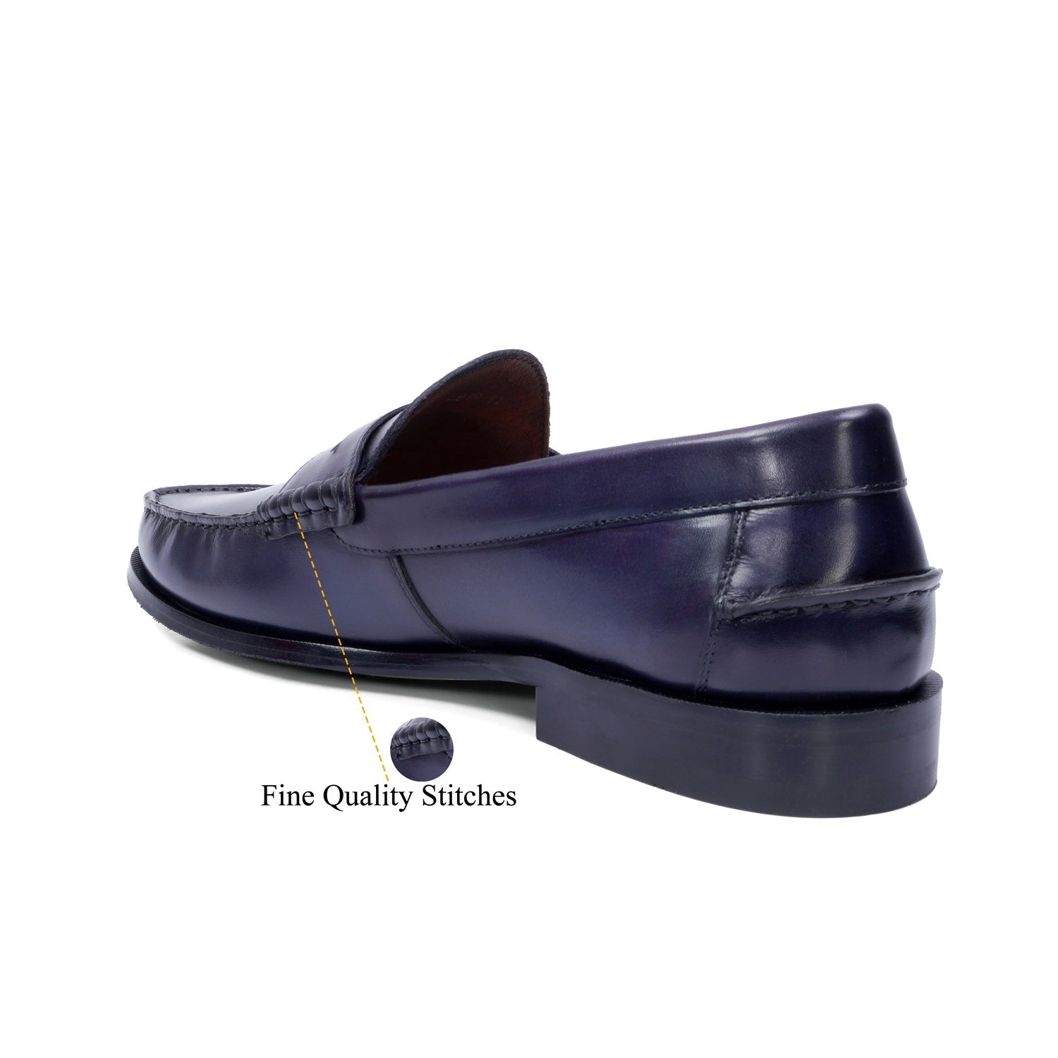 Step into timeless style with the Stitched Penny Loafer in Genuine Blue Leather. Hand-crafted by Brune & Bareskin, these classic shoes feature a unique triangular cut strap and anti-skid leather sole. Shoes are quite spacious and therefore very comfortable, especially if you have broad or wide feet. Slip-on loafer provide all the support and comfort of a sneaker, without the need to tie laces or use straps to keep them on. Trendy and functional, with a low heel, for the fashion-forward man. You can get it made in your favorite color with our bespoke services.