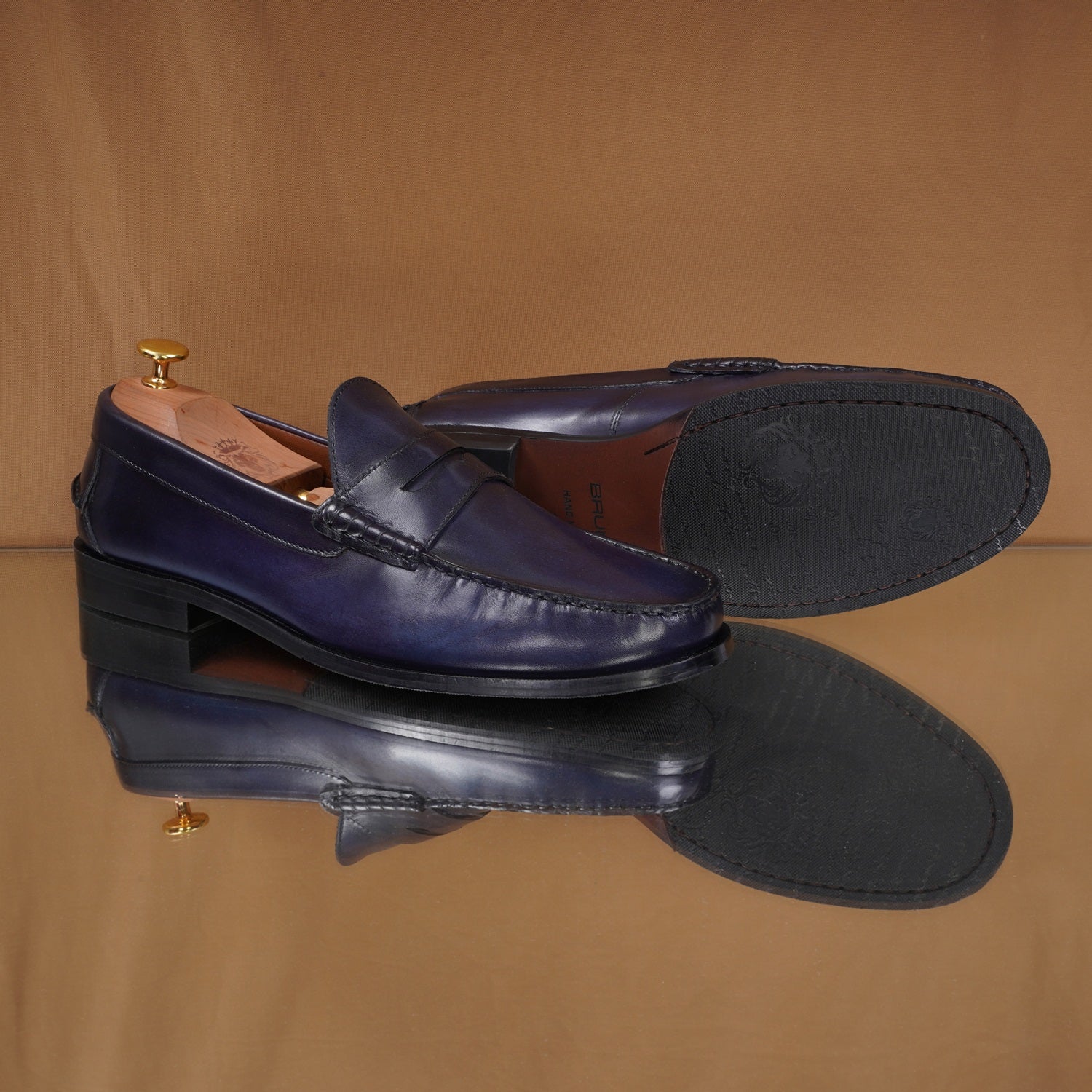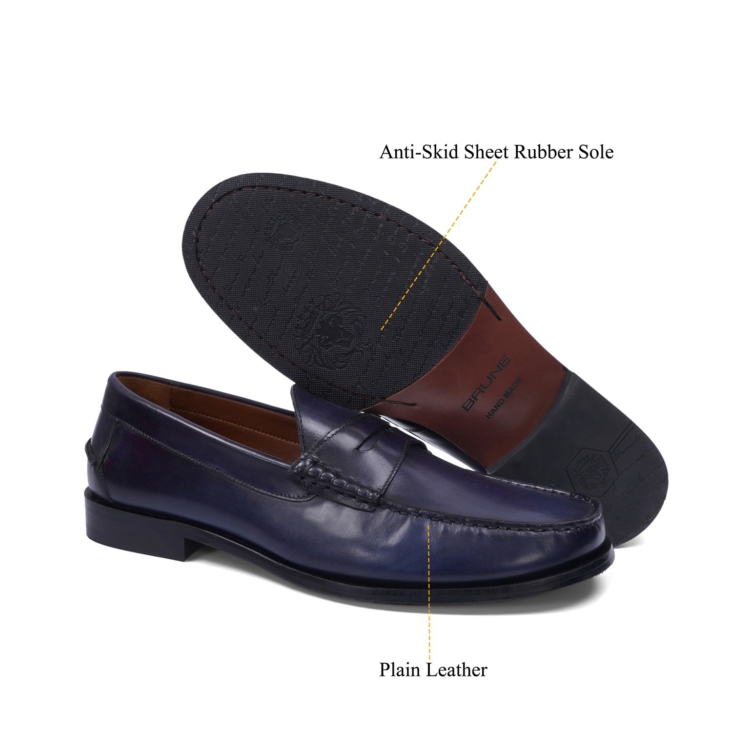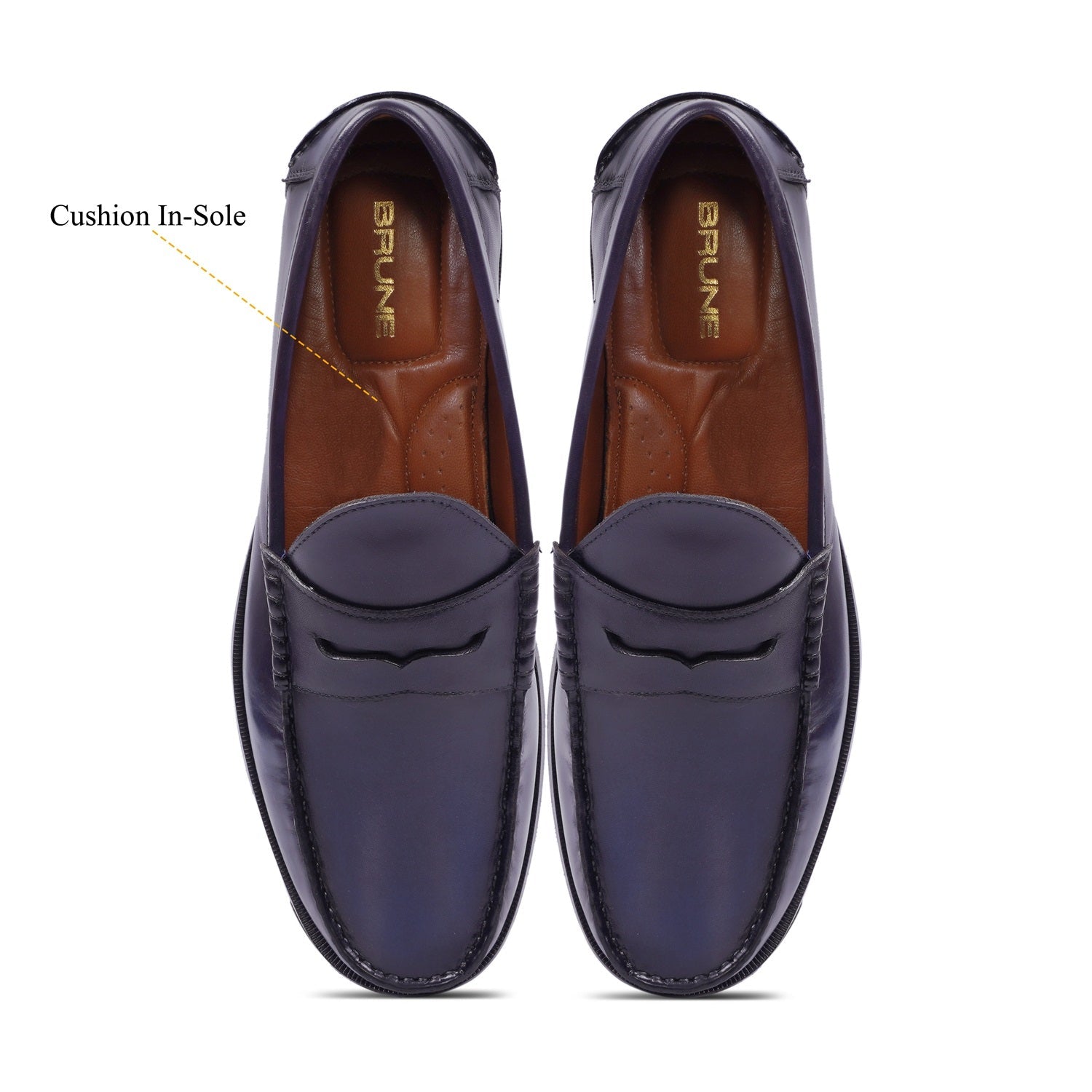 Step into timeless style with the Stitched Penny Loafer in Genuine Blue Leather. Hand-crafted by Brune & Bareskin, these classic shoes feature a unique triangular cut strap and anti-skid leather sole. Shoes are quite spacious and therefore very comfortable, especially if you have broad or wide feet. Slip-on loafer provide all the support and comfort of a sneaker, without the need to tie laces or use straps to keep them on. Trendy and functional, with a low heel, for the fashion-forward man. You can get it made in your favorite color with our bespoke services.