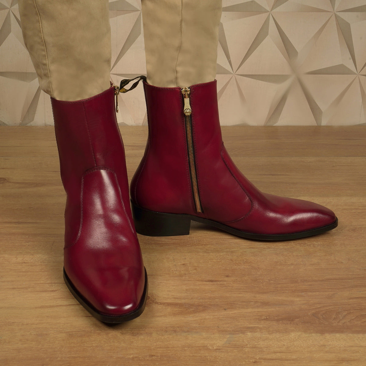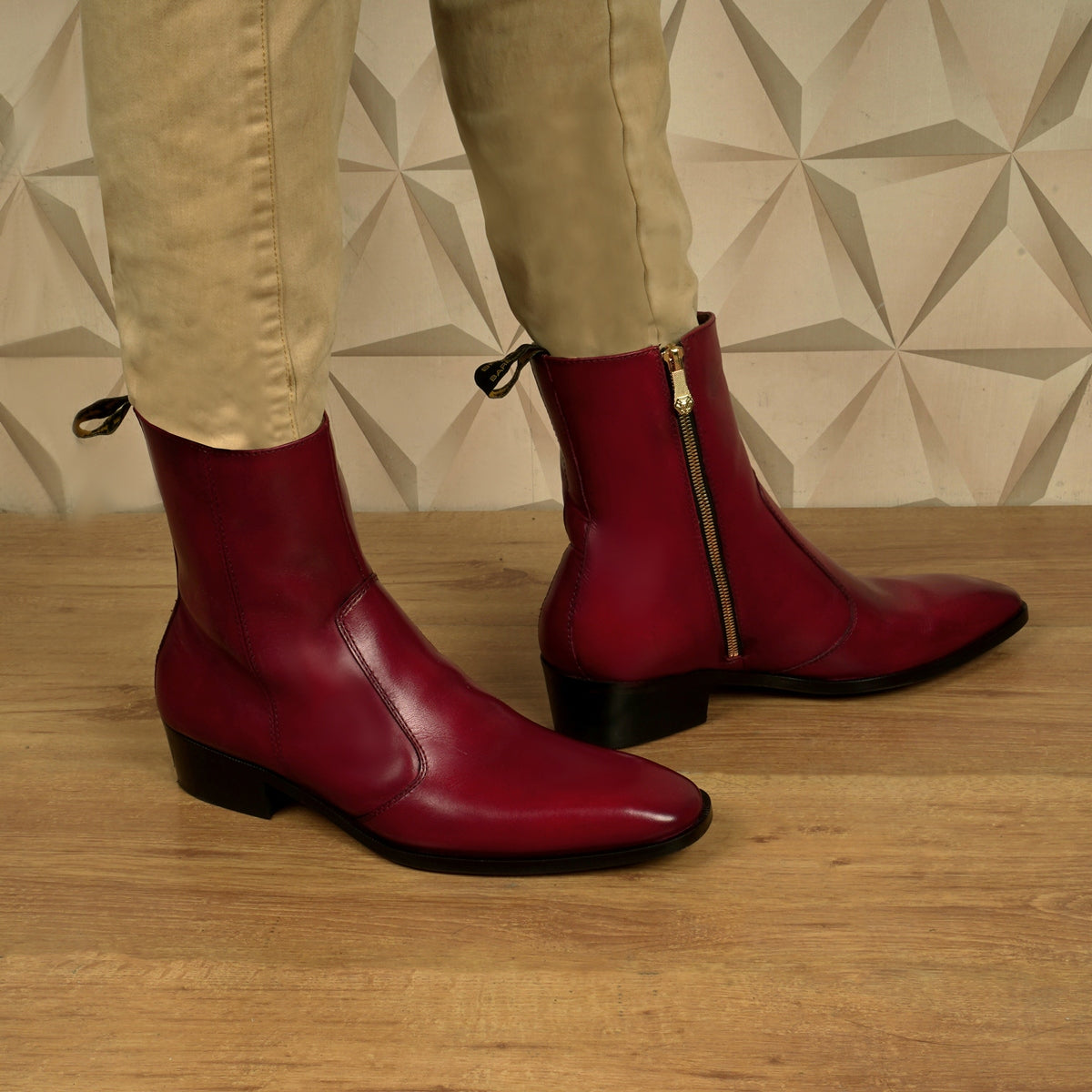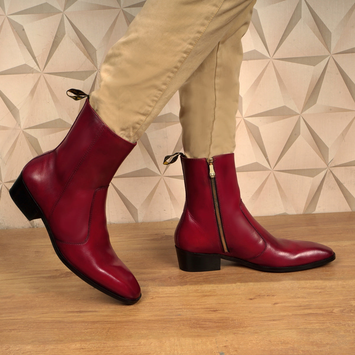 We craft these high ankle Wine genuine leather boots to give you an elite look. The stitched detailing on the quarter looks classy. The golden zip closure provides an extra ease to wear these exquisite boots. The pure leather sole & (40MM)Cuban heel offers great comfort. Cuban Heel(40MM) Essentially, it is a straight, medium-high heel with a slightly curved back. This is one of a kind Chelsea boot with a perfect Cuban heel. You can customize this chic boots in any of your favorite color according to your attire with our bespoke services. They are easy to team with formal trousers as they blend well with the classic fabrics as well as the modern blended synthetic fabric pants, slacks and trousers.