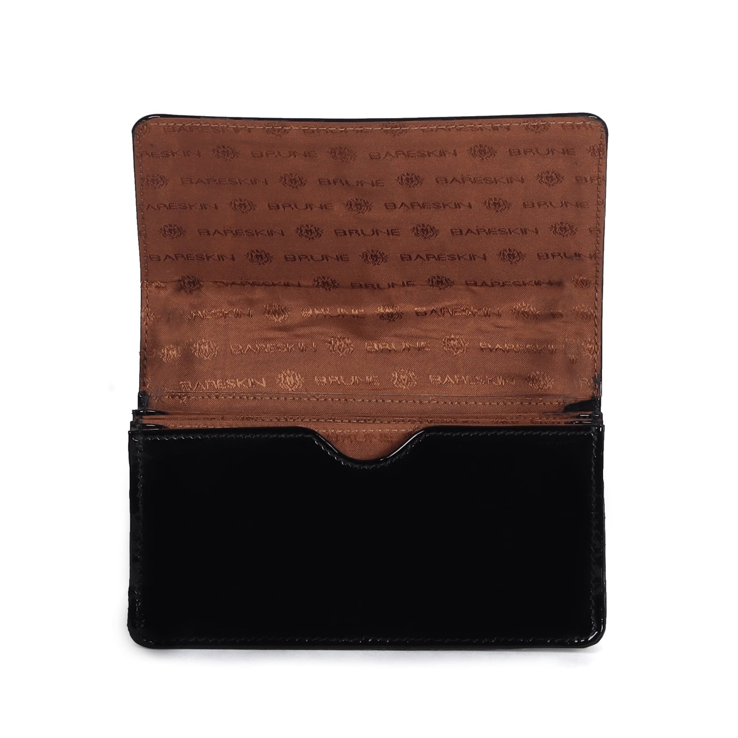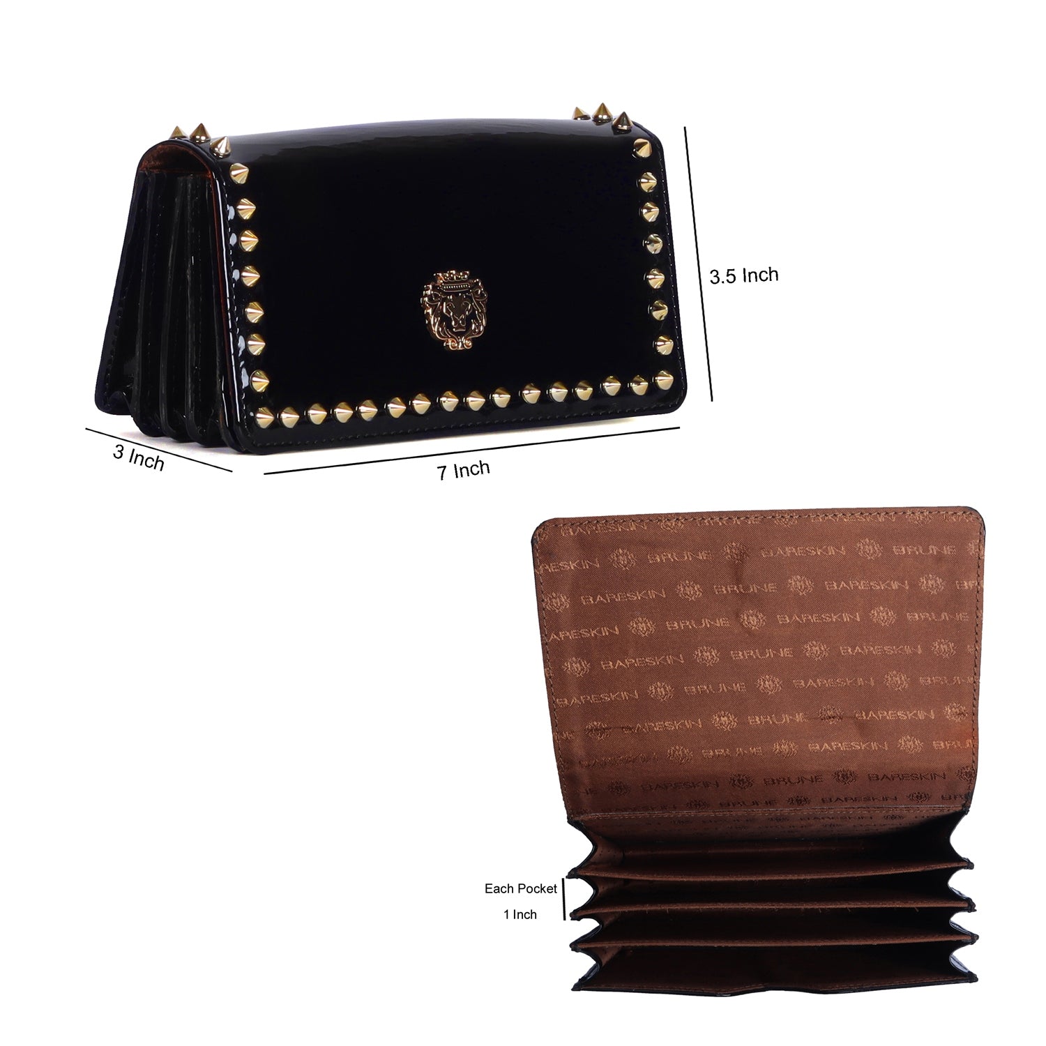 Black color in patent leather, this trendy wallet/clutch from Brune & Bareskin is specially designed for fashion-conscious women. Made from 100% Genuine Leather, this wallet ensures lasting durability. This is one of the most versatile clutch/wallet from Brune & Bareskin. This ladies wallet is made up of Imported Leather with additional soft touch and feel. It is a perfect companion for travel. The bi-fold opening wallet features three main pockets. Black patent leather with a polyester lining and features three full-length pockets for notes. It a perfect buy for today's generation. The golden arrowhead stud work on patent wallet is so delicate & admirable that only a few of these will be made. The BRUNE & BARESKIN signature metal golden brand lion logo on it increases the elegance. The magnetic button provides the extra security to it.