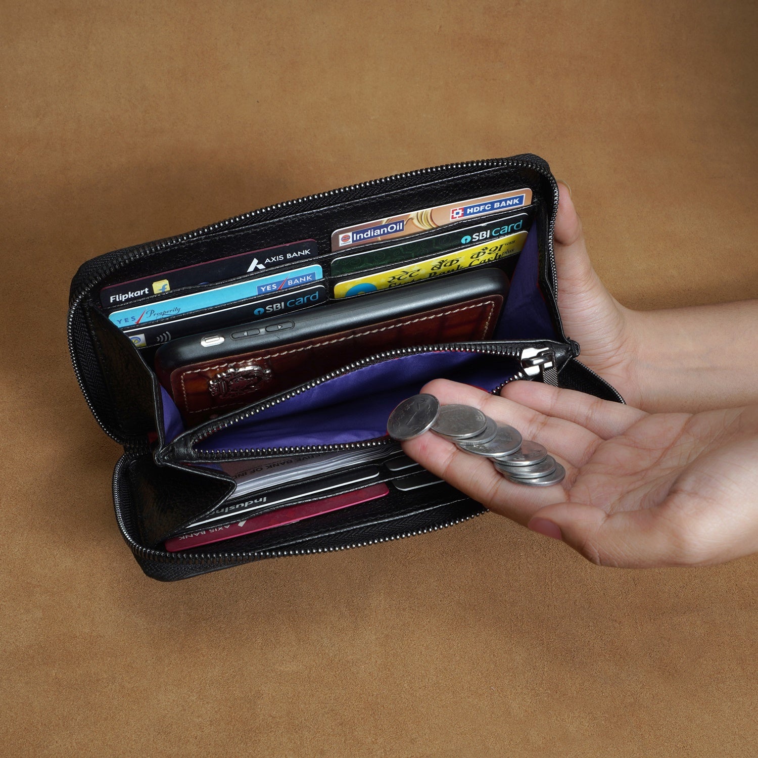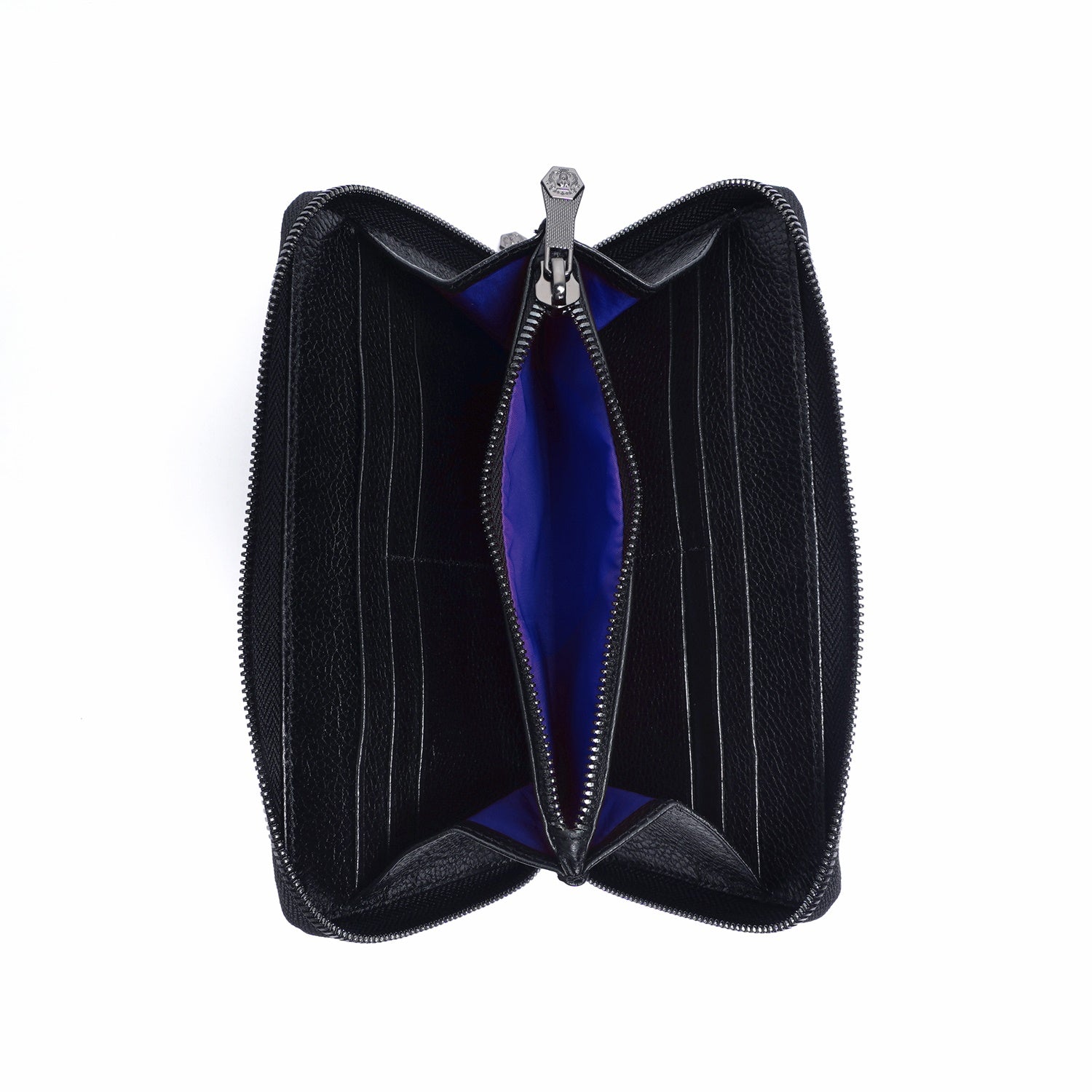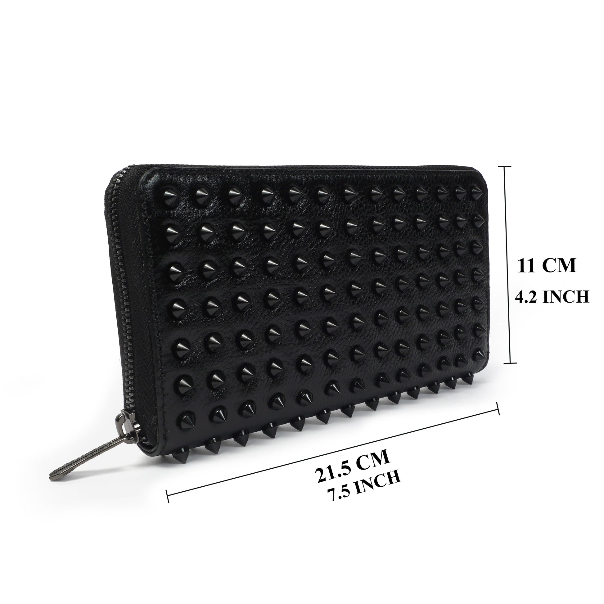 This Studded Black Ladies Clutch/Wallet from Brune & Bareskin is the perfect combination of fashion and function. Its luxurious textured leather and black studs give it a chic and sophisticated look. It's zip closure and multiple compartments conveniently store your cards and cash securely. Get ready to dazzle with this stylish and practical accessory! This is perfect gift for someone special.