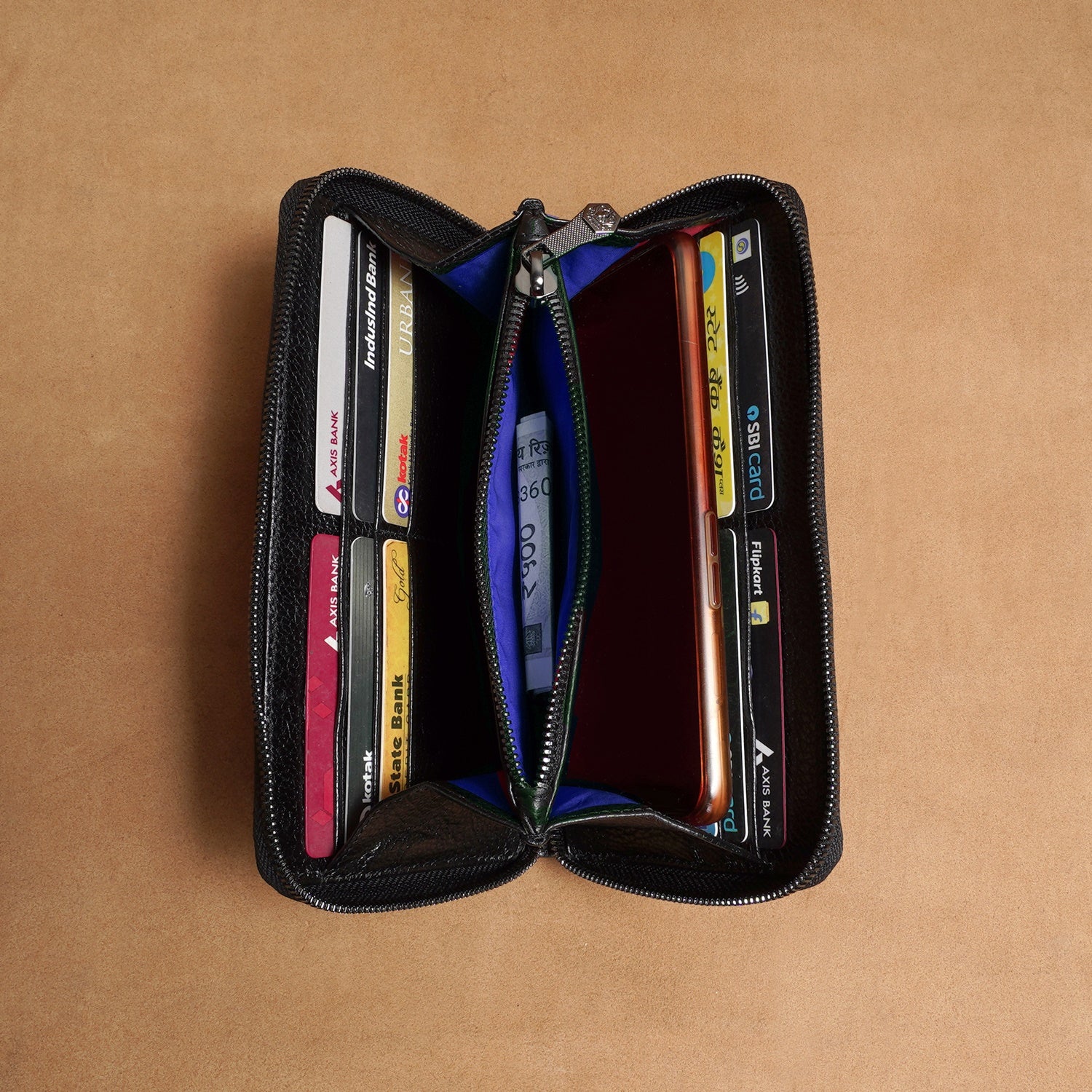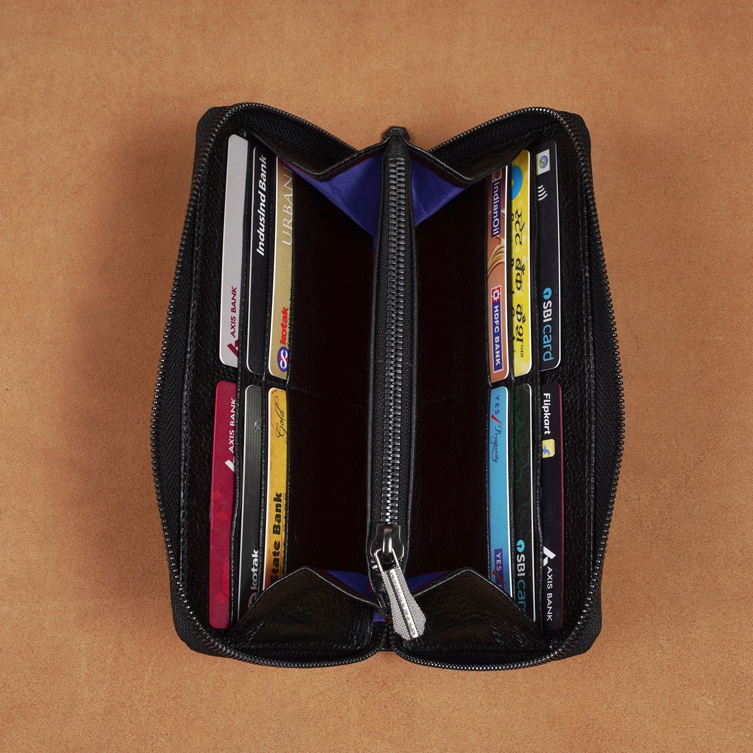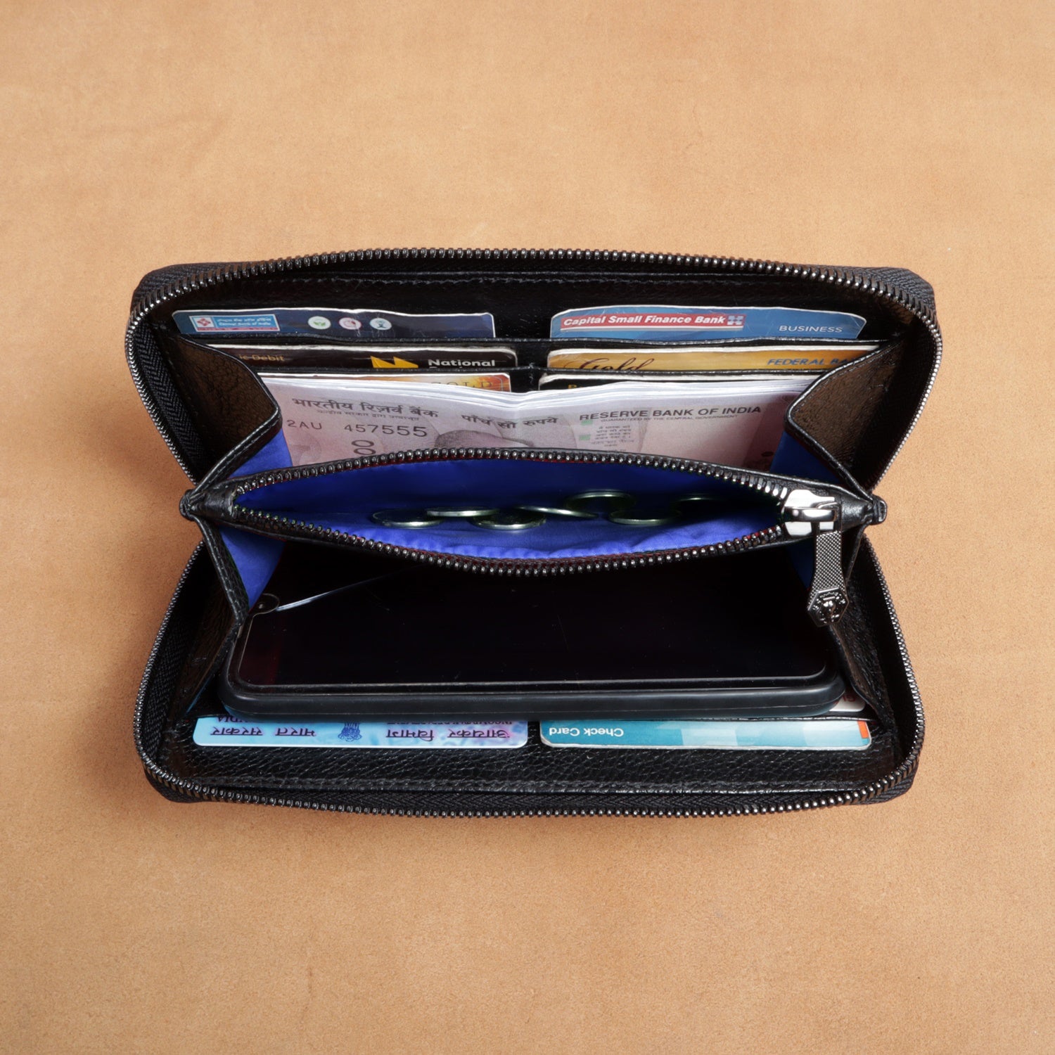 This Studded Black Ladies Clutch/Wallet from Brune & Bareskin is the perfect combination of fashion and function. Its luxurious textured leather and black studs give it a chic and sophisticated look. It's zip closure and multiple compartments conveniently store your cards and cash securely. Get ready to dazzle with this stylish and practical accessory! This is perfect gift for someone special.