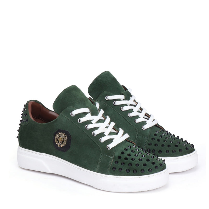 Elevate your style with our handcrafted Studded Black Sneaker in Genuine Leather. The latest addition to our collection, these men's low top Sneakers are hand made with premium quality black leather and full arrow head studs detailing. The derby lace-up closure and rubberized sole ensure a perfect fit and better grip, while the padded foot-bed and collar provide extra comfort while walking. Complete with a silver finish metal lion logo, our Sneakers embody higher styling standards with a premium quality patina finish.