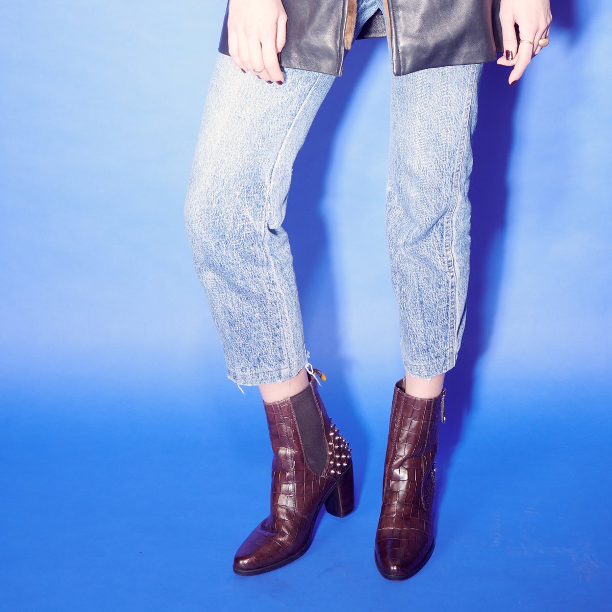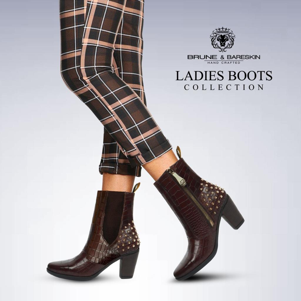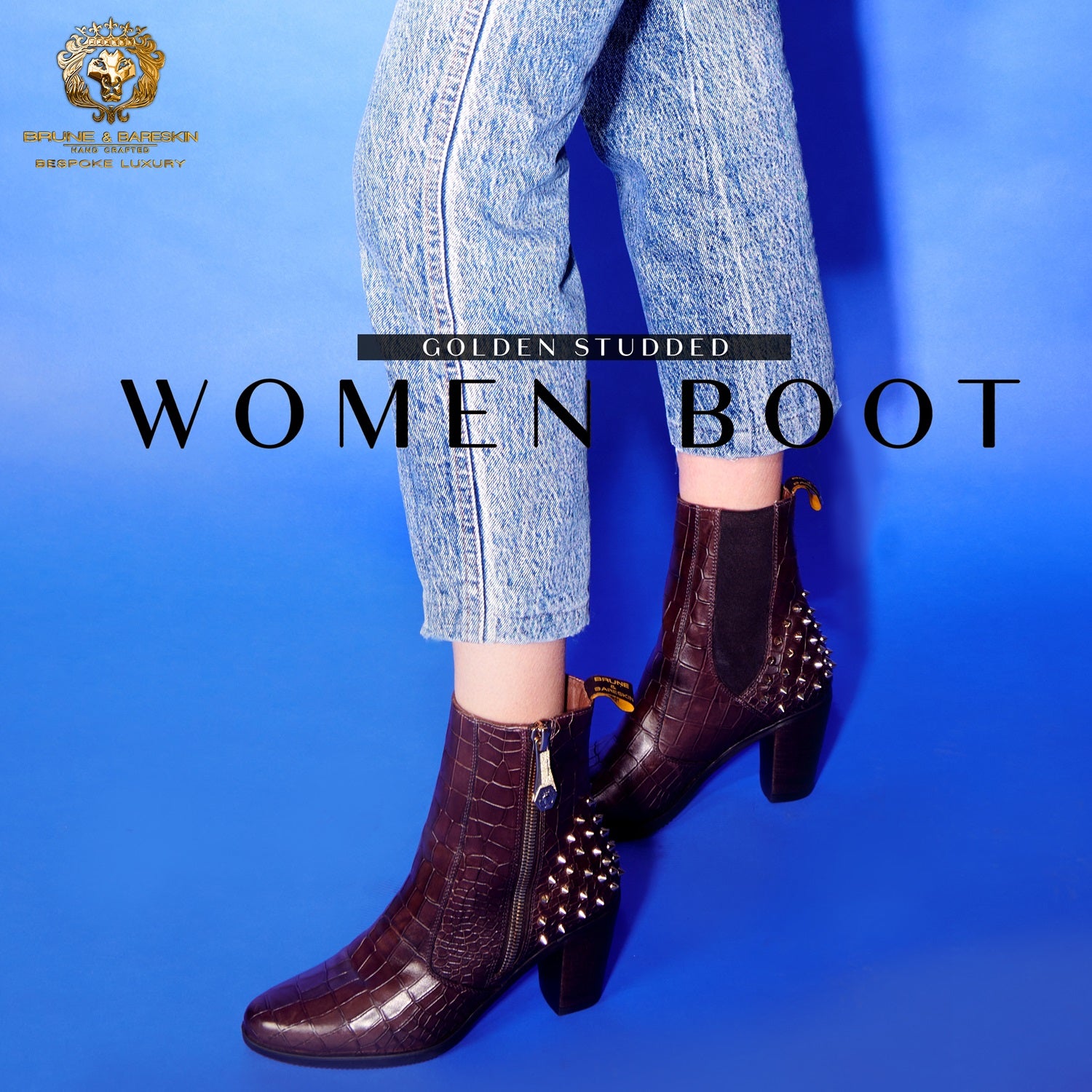 Studded Brown Boots for Ladies in Deep Cut Croco Textured Leather by Brune & Bareskin