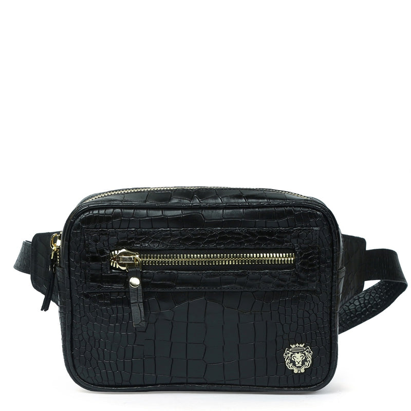 Studded fanny Pack Bag in Black Croco Texture Leather