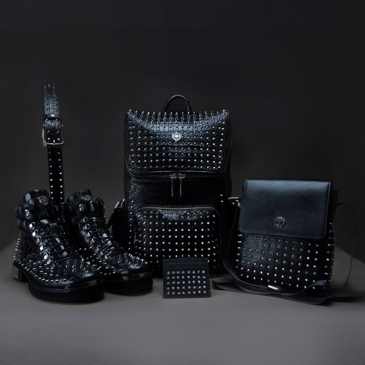 This combo is perfect for the Black Lovers out there. It's a Combo of elegant Card Holder, Belt, Chunky Boots, Backpack and Crossbody Bag in Croco textured leather with silver arrowhead studs by BRUNE & BARESKIN. The silver stud detailing on products give a credible look. Brune & Bareskin signature metal lion brand logo increase the style quotient of the products. This type of combo is known for its unique and eye-catching design, as well as its durability and longevity. This combo is good to gift to your closed ones you can buy it for yourself too.