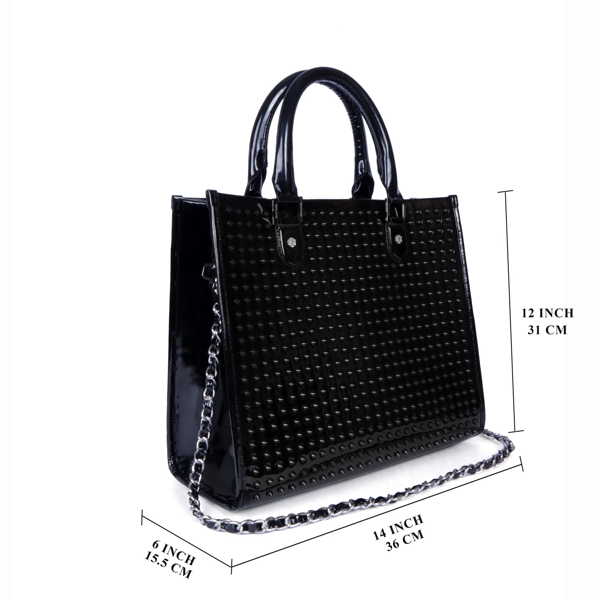 Created with luxury in mind, Tote around your style with this Brune & Bareskin patent leather handbag is an essential addition to any woman's accessory collection. With its medium size and oh-so-glamorous arrowhead studs, this black beauty is perfect for your everyday office needs, shopping, and more! And don’t worry, your things will be safe and sound due to the snap button closure. Time to flaunt your chicness in this luxurious ladies patent leather handbag! This hand bag can be personalized with your name initials in any color shade with our bespoke services.