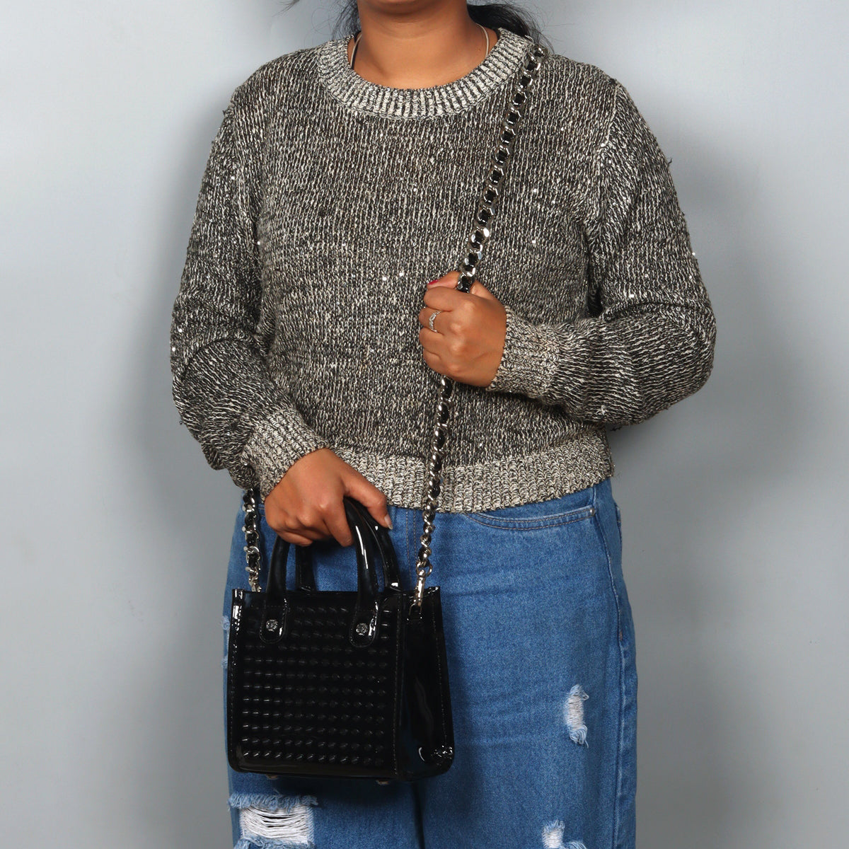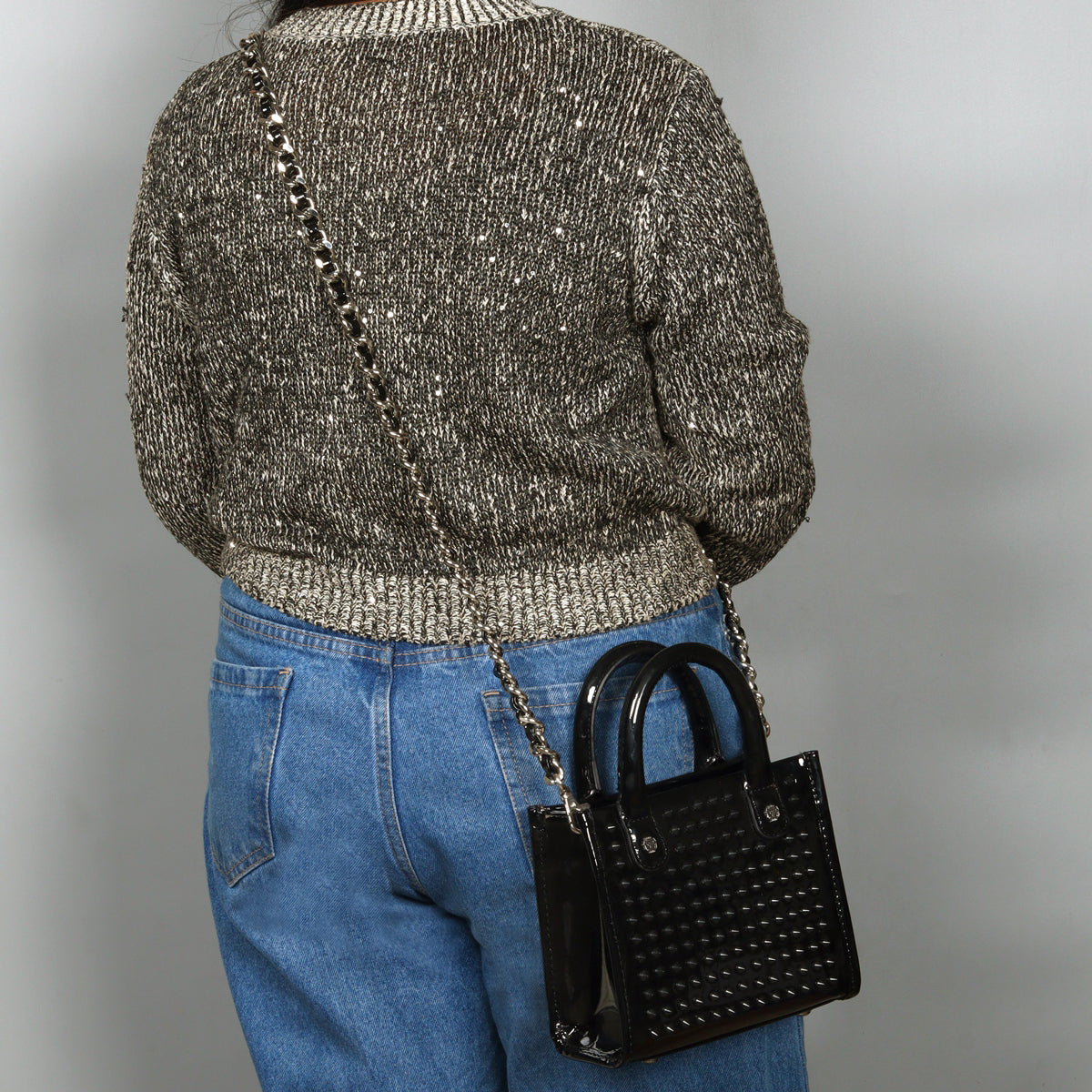 This black mini sized patent leather hand bag looks very elegant. Crafted with black patent leather, this handbag has been embellished with arrow head studs detailing. The square space allows it to carry for travelling. The main button compartment provides the extra security to it. This bag is quite very handy for the traveler's as well. It provides the easy access to the needy essentials. Stylish look makes it an eye catching accessory. Stylish in appearance with its size its gonna be an eye stopper. This bag classic silver chain bag strap with black leather weaved/threaded through choice of length and hook with two silver mini loin logo on front side. The black stud detailing give a credible look. 100% pure genuine leather is used for making your style. This hand bag can be personalized with your name initials in any color shade and in any size with our bespoke services. This is a must-have addition to your fashion collection.