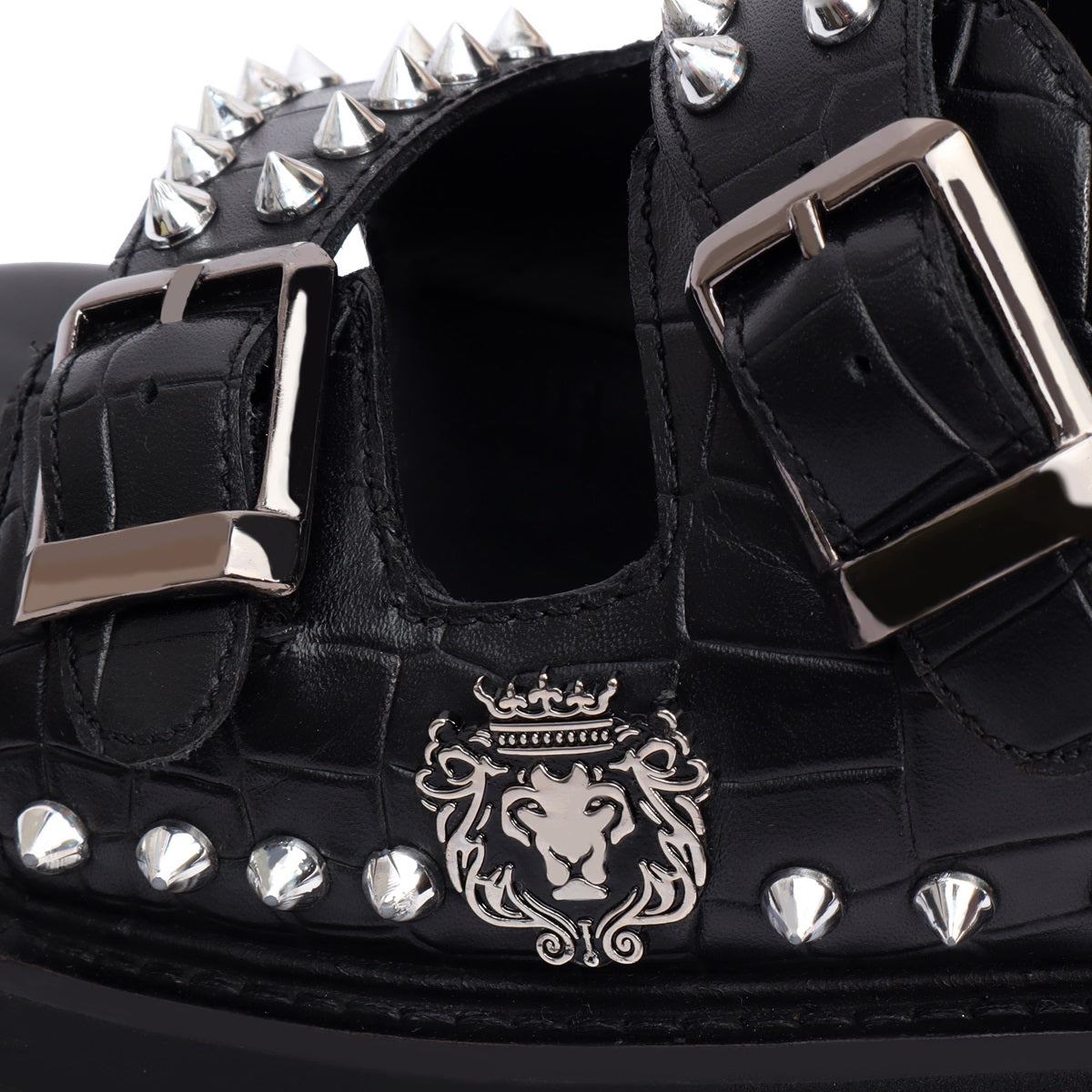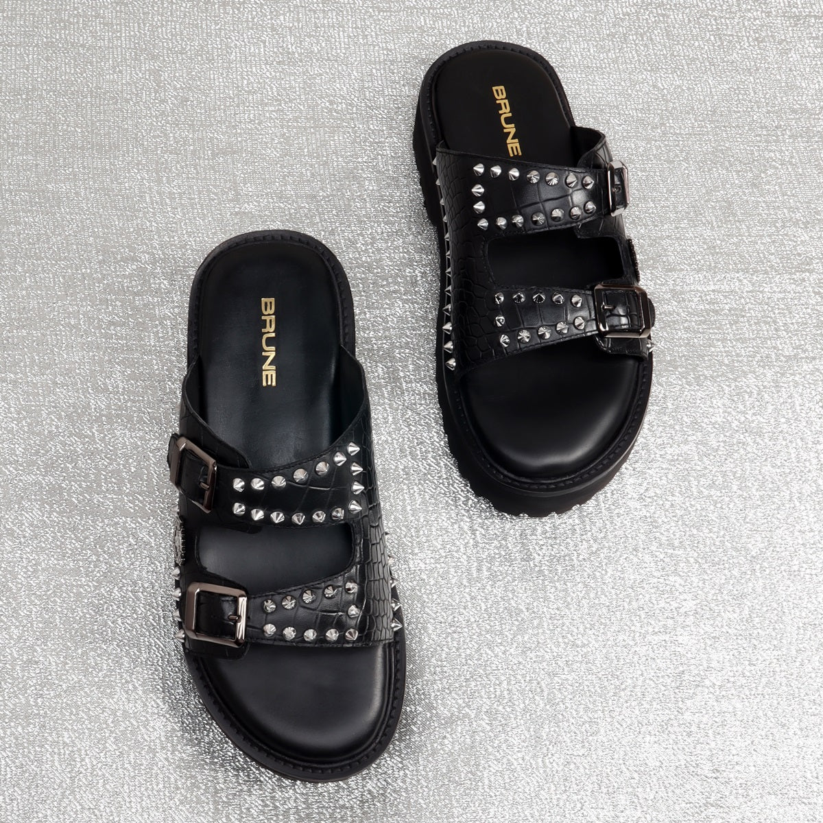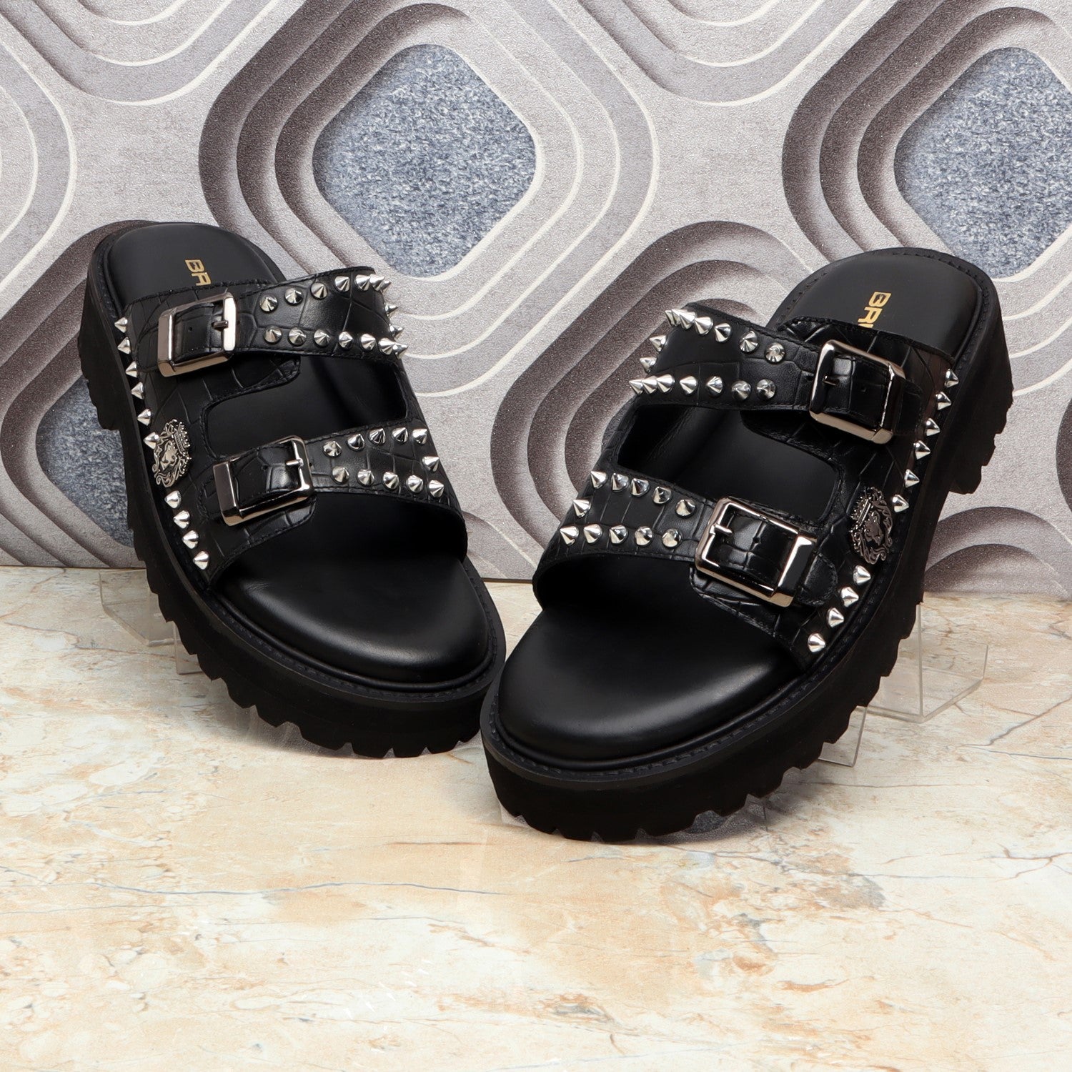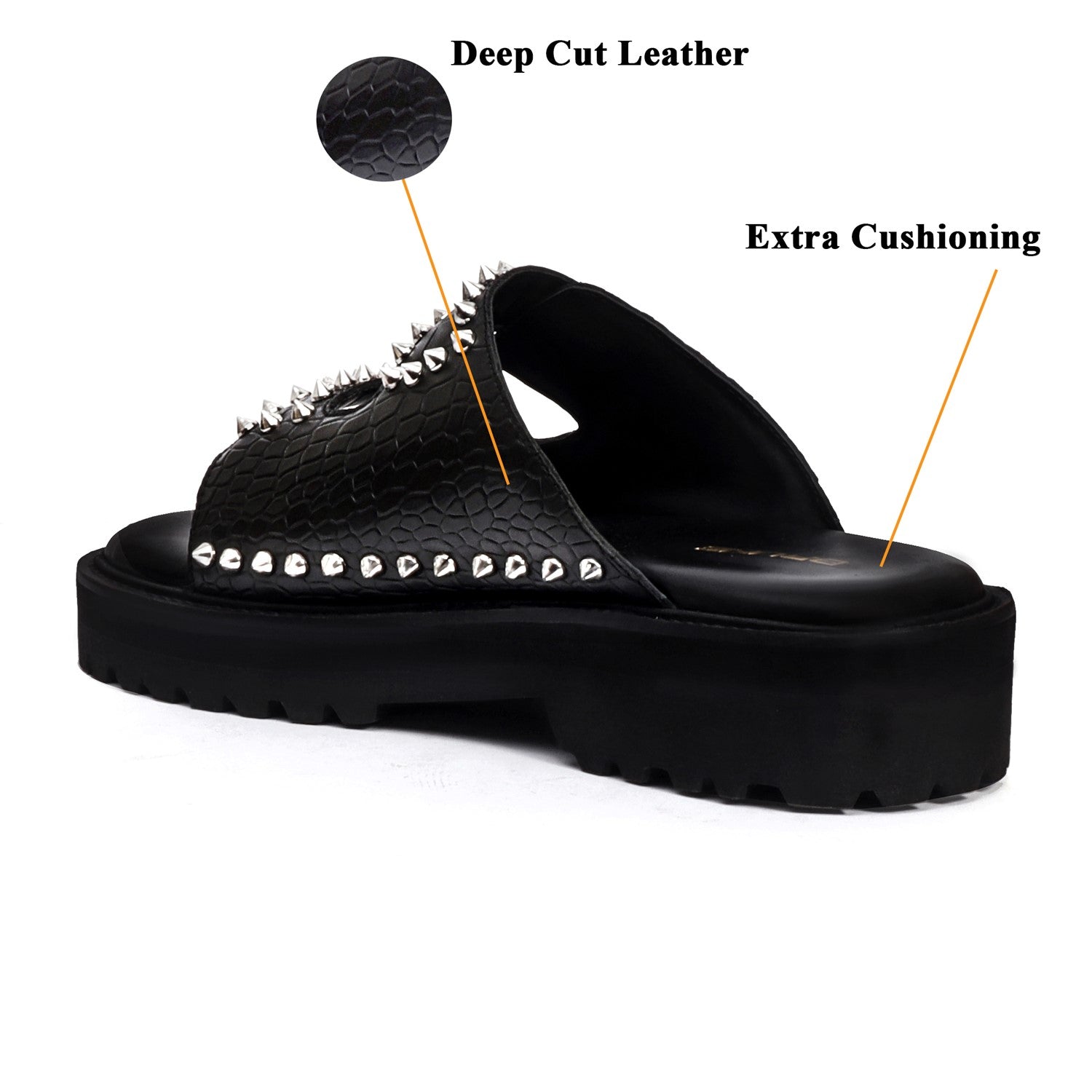 Studded Slide-in Slippers with Chunky Sole in Black Cut Croco Leather Detailing