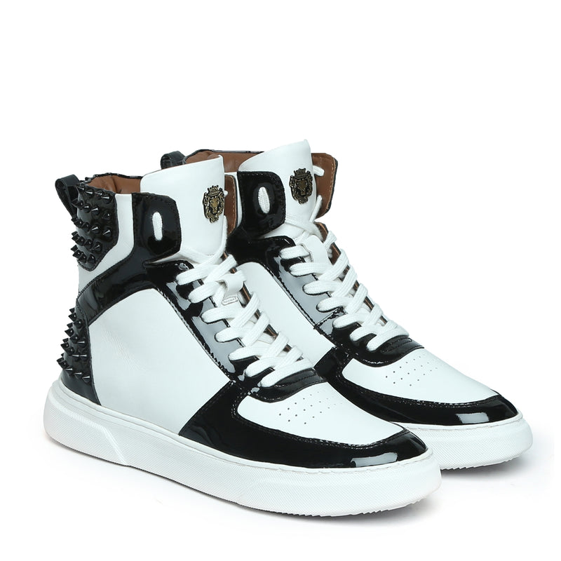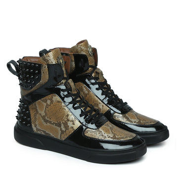 This black studded snake print leather sneaker is made to bring the elegance to your looks. Contrasting black studs & black patent leather compliments the textured snake leather. It is entirely handcrafted from precisely selected highest quality materials. The high top lace-up design provides a snug fit and extra padding on collar provides the all day long comfort.