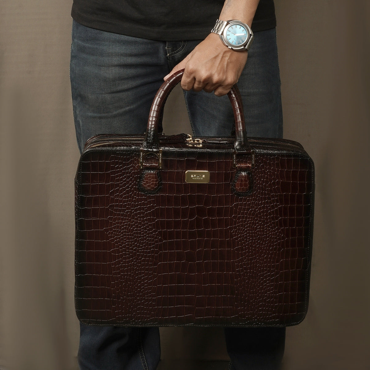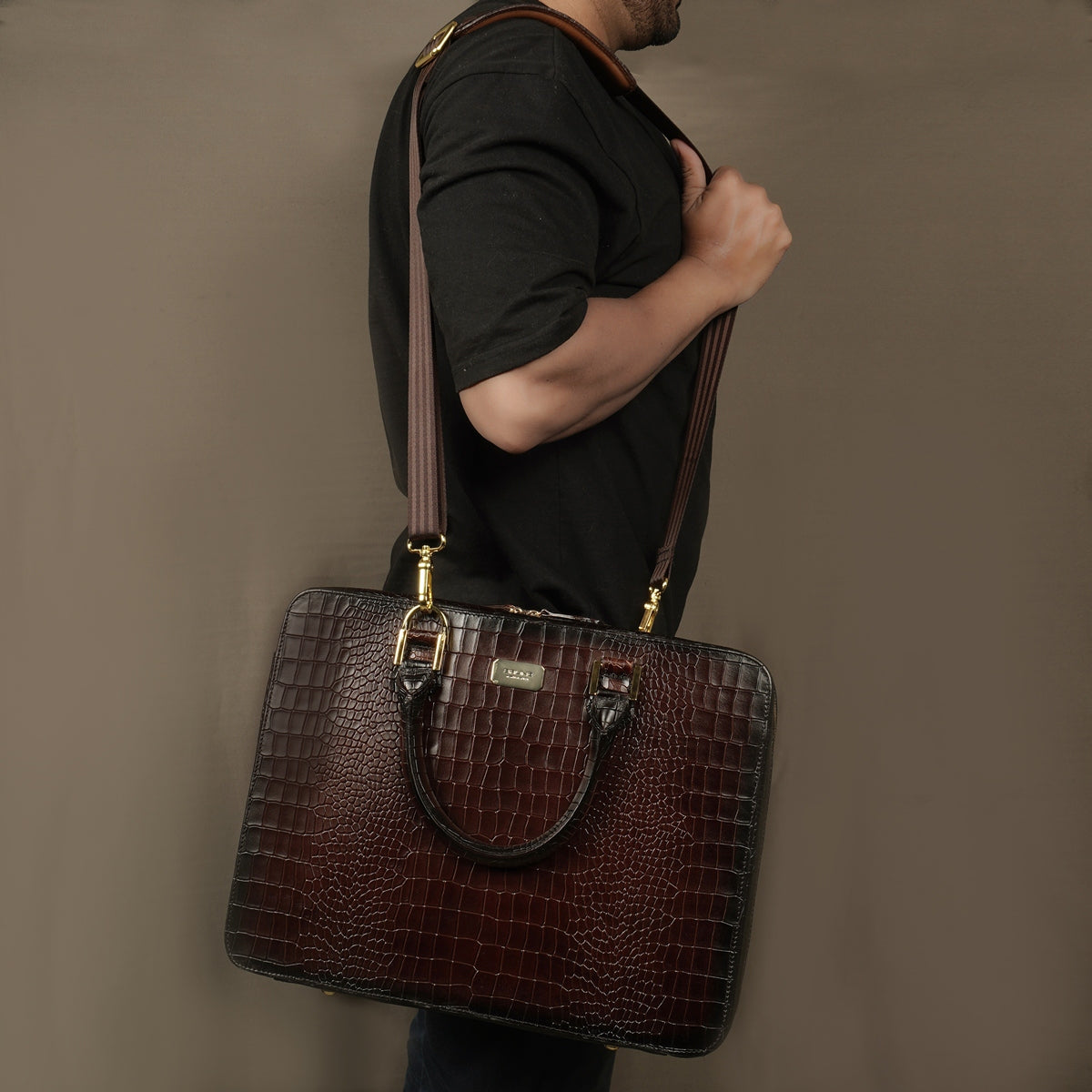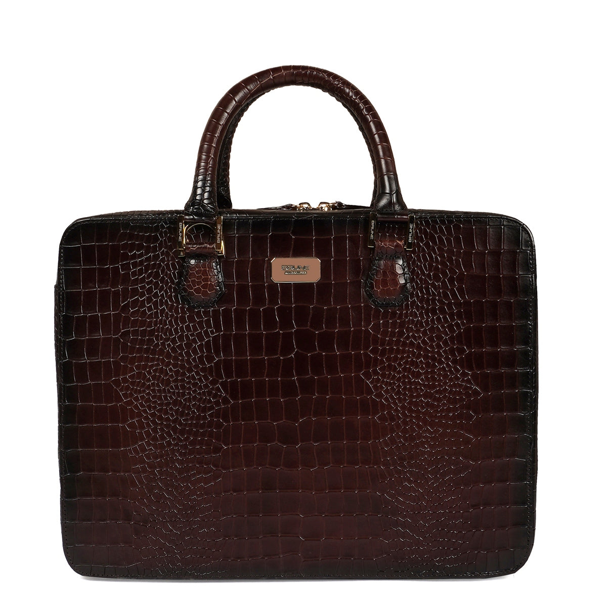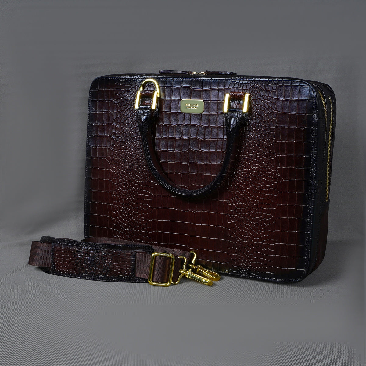 Brune & Bareskin dark brown luxurious croco leather laptop briefcase is a type of bag designed to carry a laptop and other business essentials. It is typically made of high-quality croco leather and features several compartments and pockets for storing documents, pens, business cards, and other items. The dark brown luxurious leather office laptop briefcase provides the perfect gentleman look. Dark brown croco print leather laptop briefcases bag are a popular choice for professionals who need to carry their laptops and work materials with them on a daily basis. our handcrafted genuine leather bag is hand-painted to achieve an artistic look. It has a dedicated laptop sleeve inside with an ultra-soft lining with brune golden plate on front side. It has a dedicated suitcase opening organizer compartment with multiple pockets. The adjustable shoulder strap connects and removes easily with the hidden hardware loops and lion logo embossed. Golden zippers are often used in designer bags to create a luxurious and high-end feel. The trolley handle strap in a laptop bag is a convenient feature that allows you to easily attach your bag to the handle of your luggage when traveling. You can get it customized in your favorite color shade with name Initials with our bespoke services.