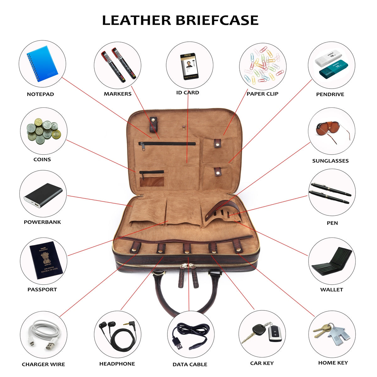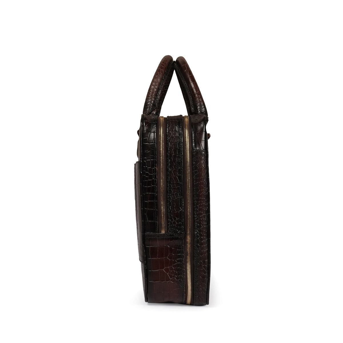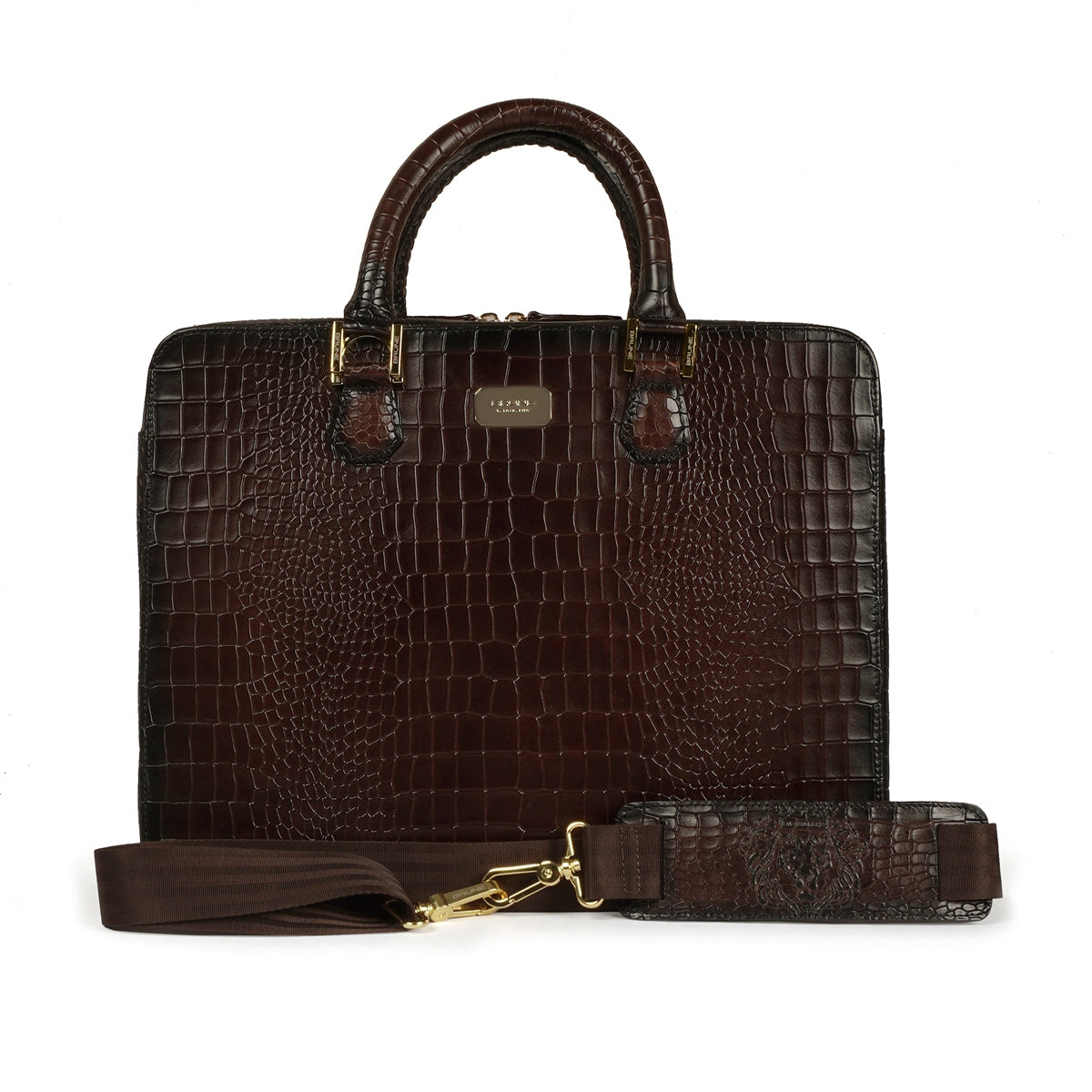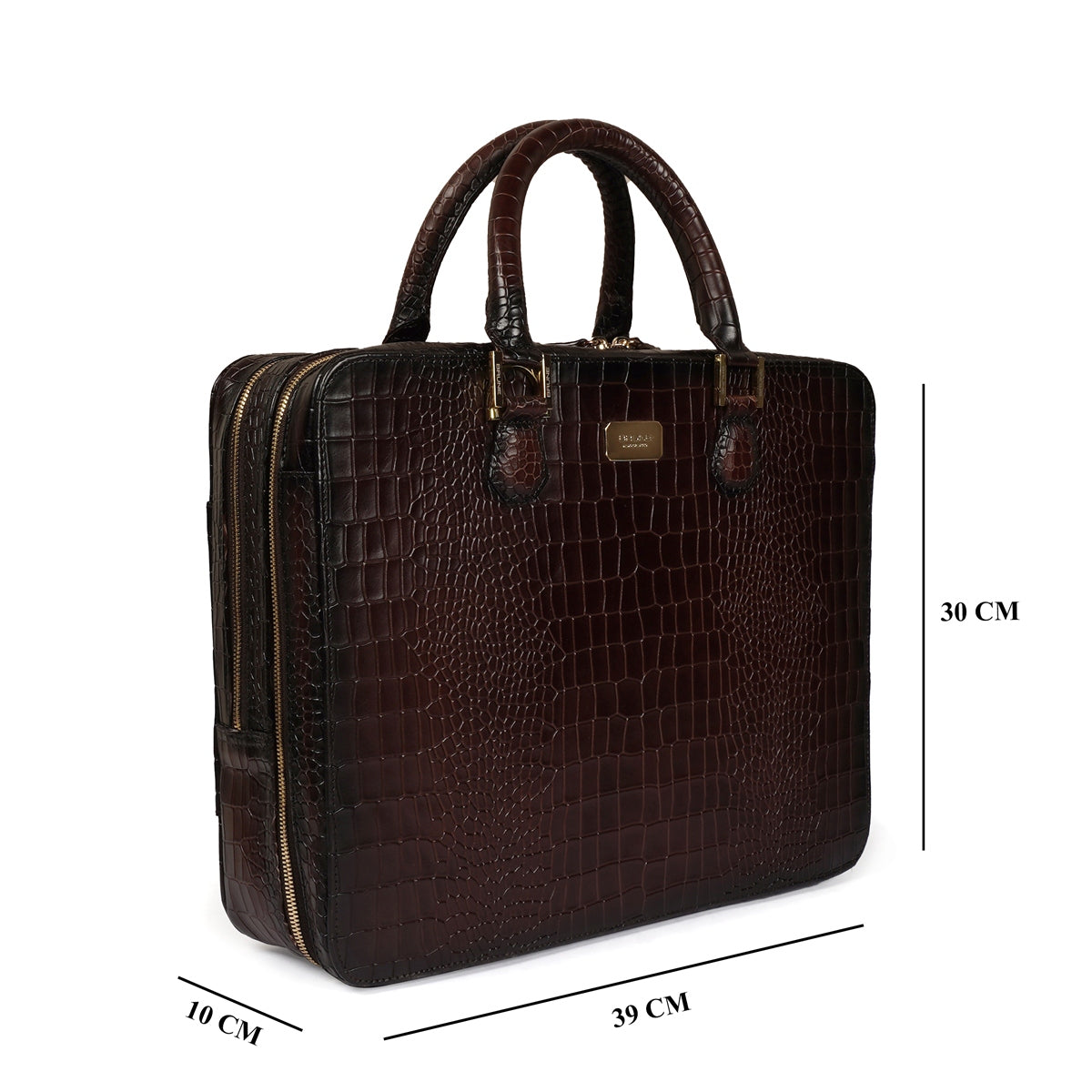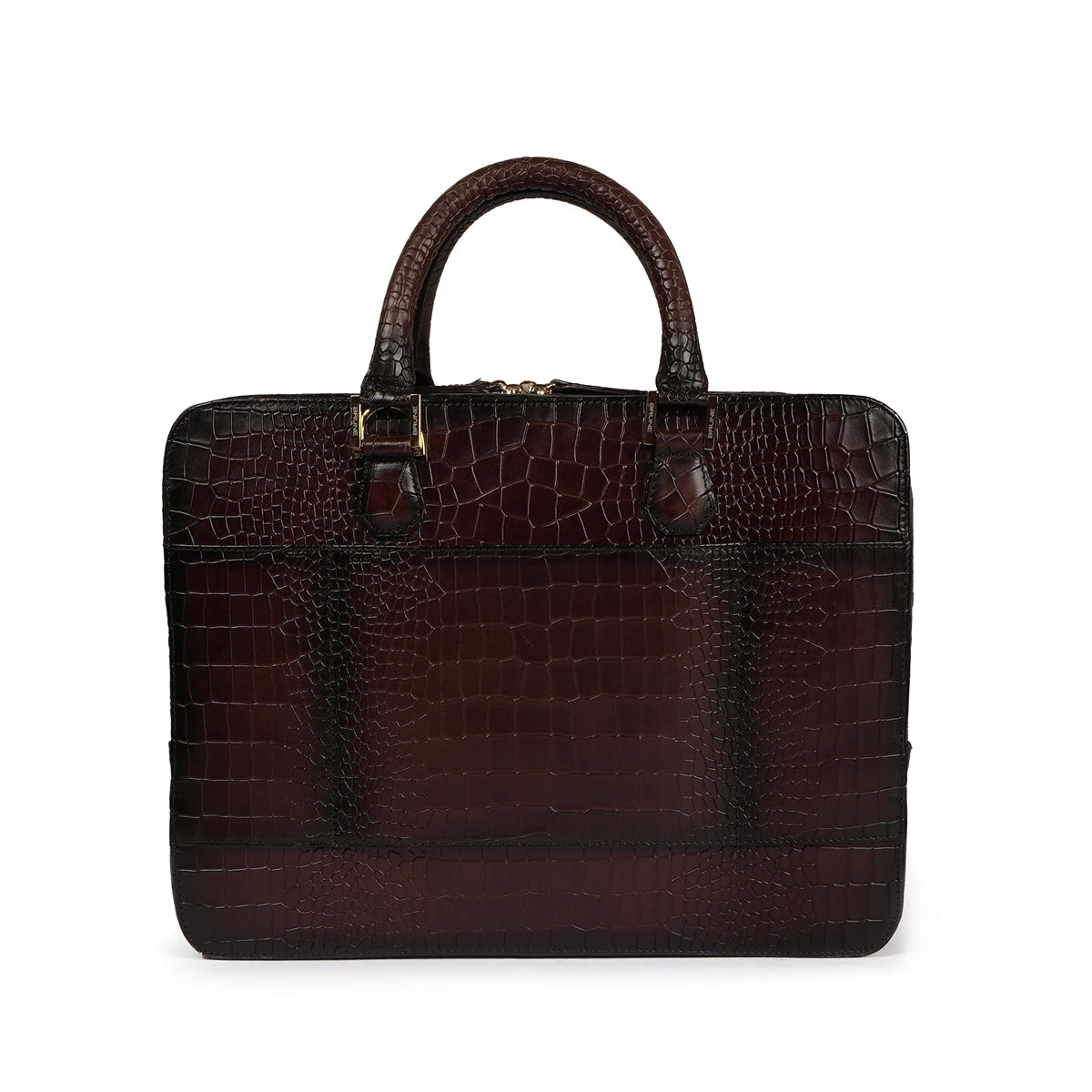 Brune & Bareskin dark brown luxurious croco leather laptop briefcase is a type of bag designed to carry a laptop and other business essentials. It is typically made of high-quality croco leather and features several compartments and pockets for storing documents, pens, business cards, and other items. The dark brown luxurious leather office laptop briefcase provides the perfect gentleman look. Dark brown croco print leather laptop briefcases bag are a popular choice for professionals who need to carry their laptops and work materials with them on a daily basis. our handcrafted genuine leather bag is hand-painted to achieve an artistic look. It has a dedicated laptop sleeve inside with an ultra-soft lining with brune golden plate on front side. It has a dedicated suitcase opening organizer compartment with multiple pockets. The adjustable shoulder strap connects and removes easily with the hidden hardware loops and lion logo embossed. Golden zippers are often used in designer bags to create a luxurious and high-end feel. The trolley handle strap in a laptop bag is a convenient feature that allows you to easily attach your bag to the handle of your luggage when traveling. You can get it customized in your favorite color shade with name Initials with our bespoke services.