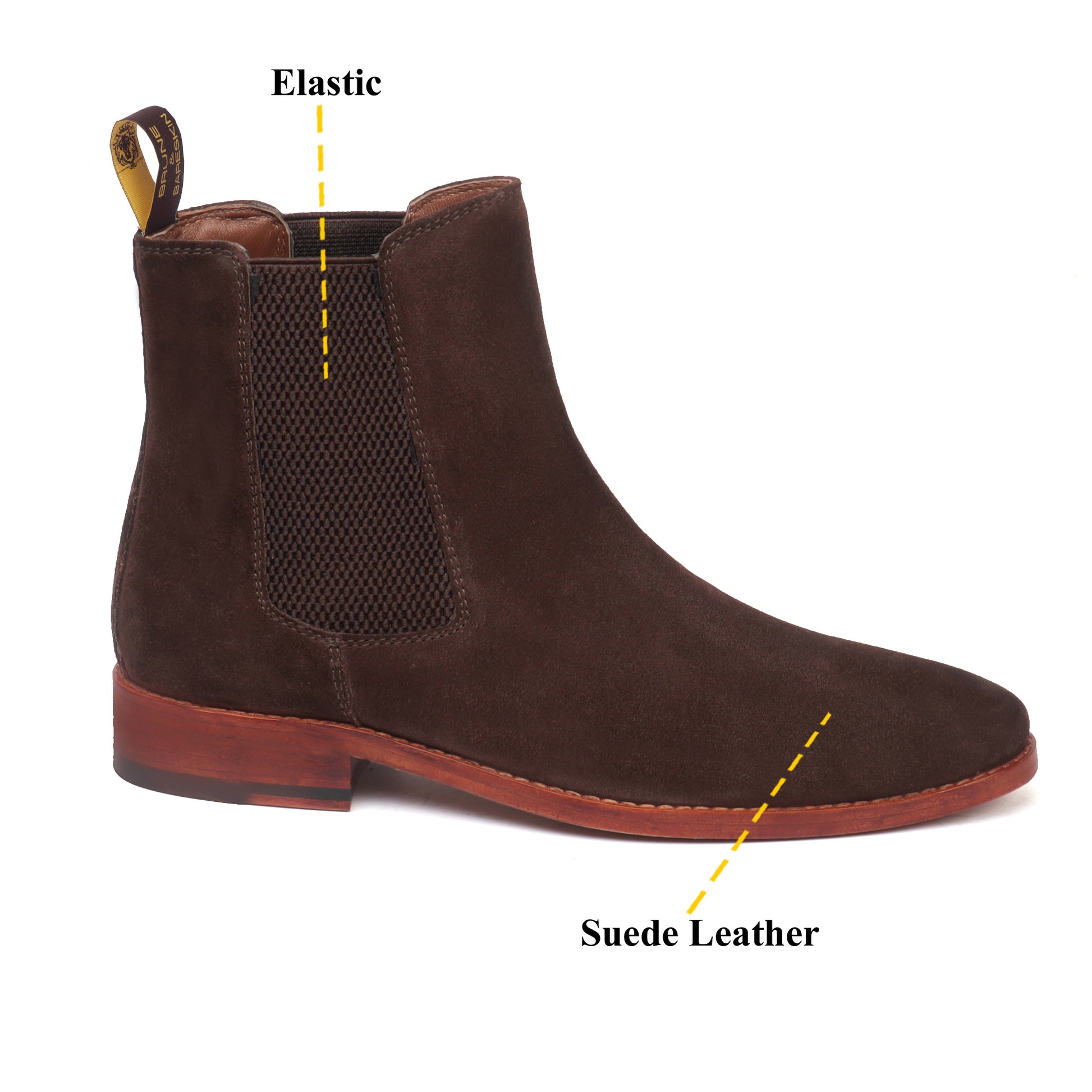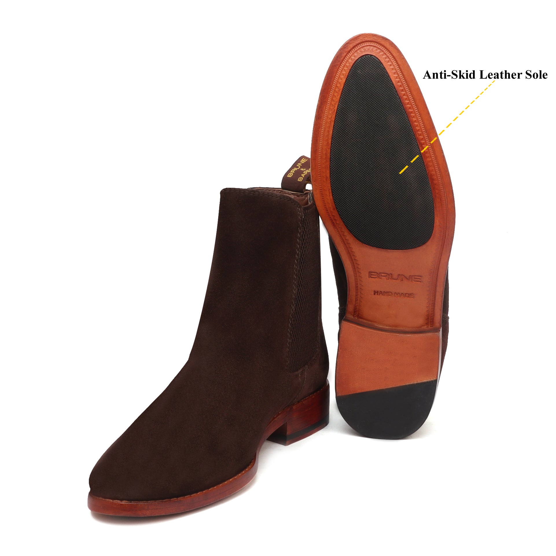 Timeless and sophisticated, the Suede Leather Chelsea Boot from Brunes & Bareskin is the perfect accessory for any formal ensemble. With its dark brown shade and luxe suede leather making, this boot seamlessly combines elegance with practicality, featuring a leather sole, inner and outer side elastic pocket closures, and an anti-skid sole for a secure fit. Unlike any other boot, the Suede Leather Chelsea Boot is the premier choice for the discerning man.