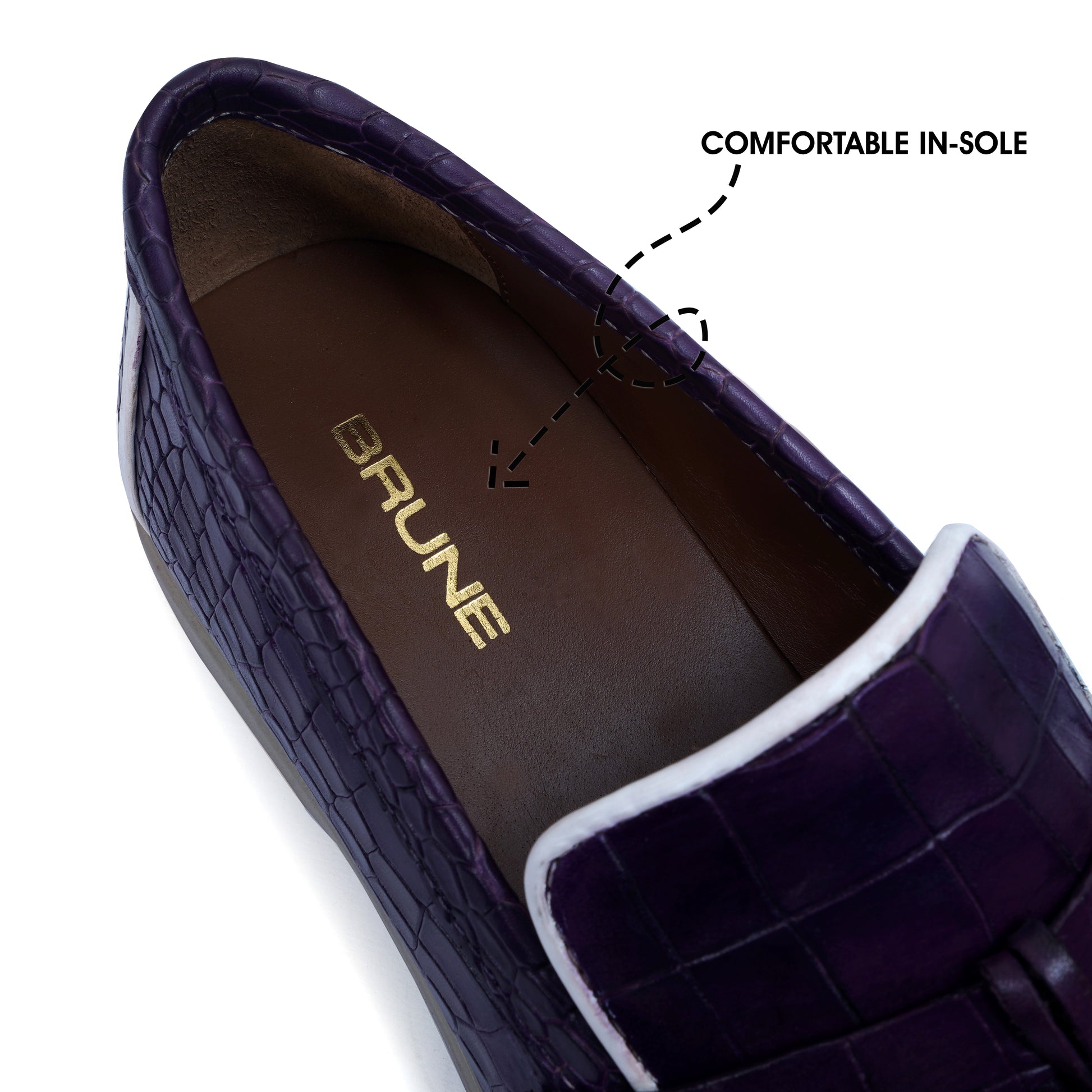 Introducing our Summer Charms Walk Yacht Loafers - Designer shoes with a luxurious patina finish and deep cut leather. Hand-crafted and customized with a stunning purple color, these loafers boast a tassel with metal branding and a stylish almond toe. With a durable anti-skid rubber sole, they're the perfect combination of comfort and style for your summer excursions. From the summer collection by brand Brune & Bareskin, don't miss out on these exclusive and sophisticated yacht loafers.