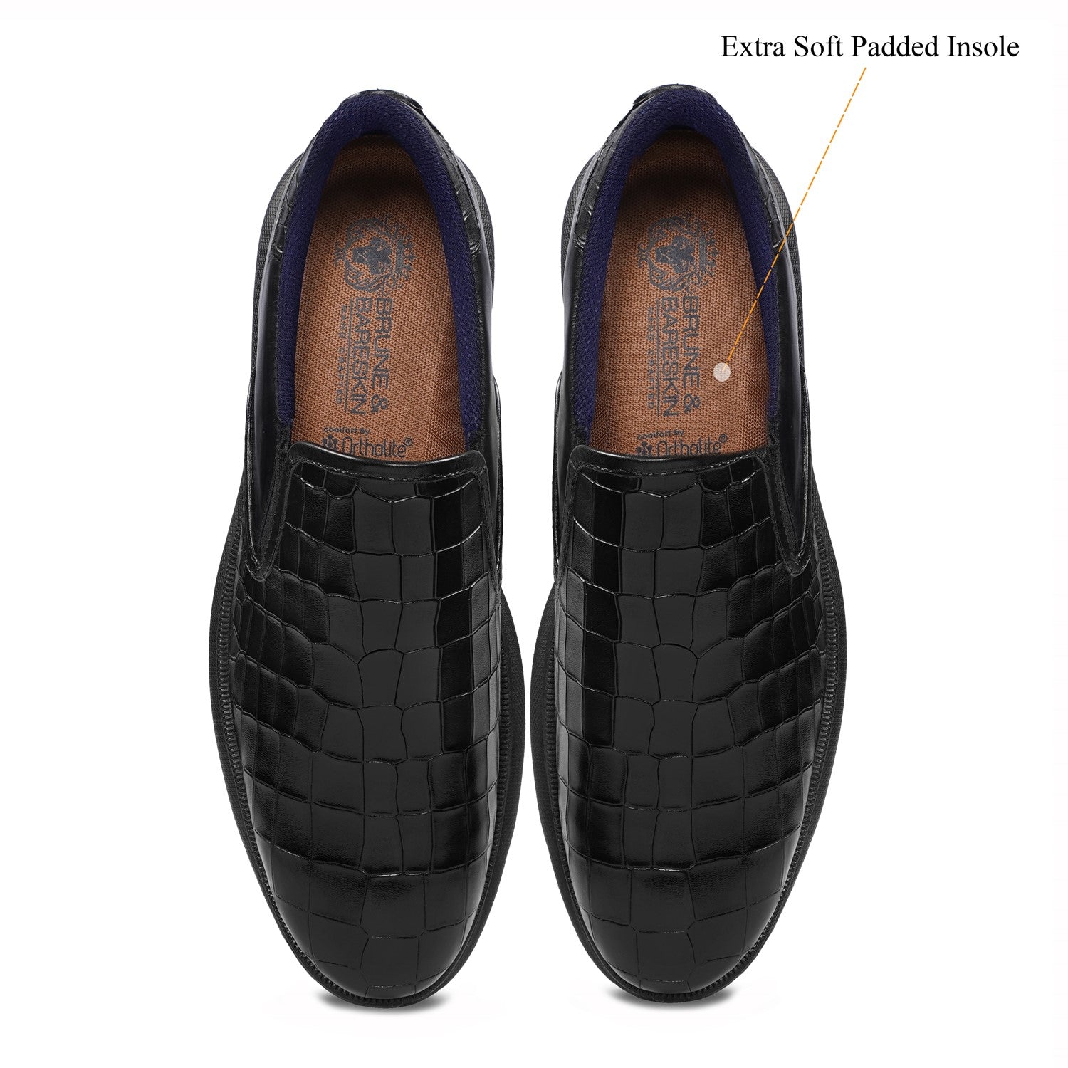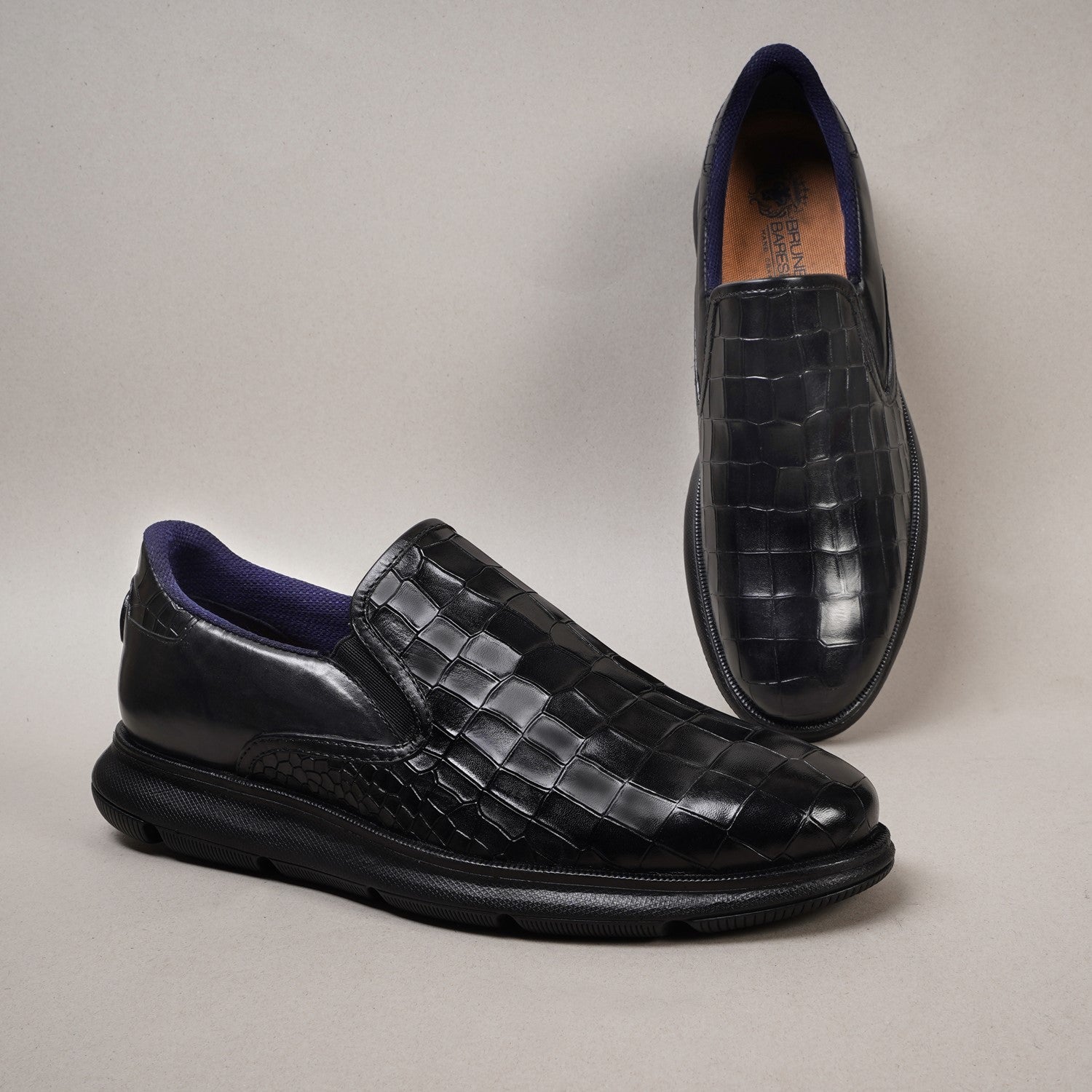 Get ready for ultimate comfort and style with these Brune & Bareskin low top black sneakers. Handmade with premium quality materials, these ultra-lightweight sneakers are not only stylish but also extra comfortable. Featuring a cut croco textured leather vamp and shoe collar, these sneakers are perfect for any casual outfit. Plus, the subtle embossed lion logo and cushioned foot-bed add a touch of luxury. With an anti-skid patterned rubber sole, these sneakers are perfect for any activity.