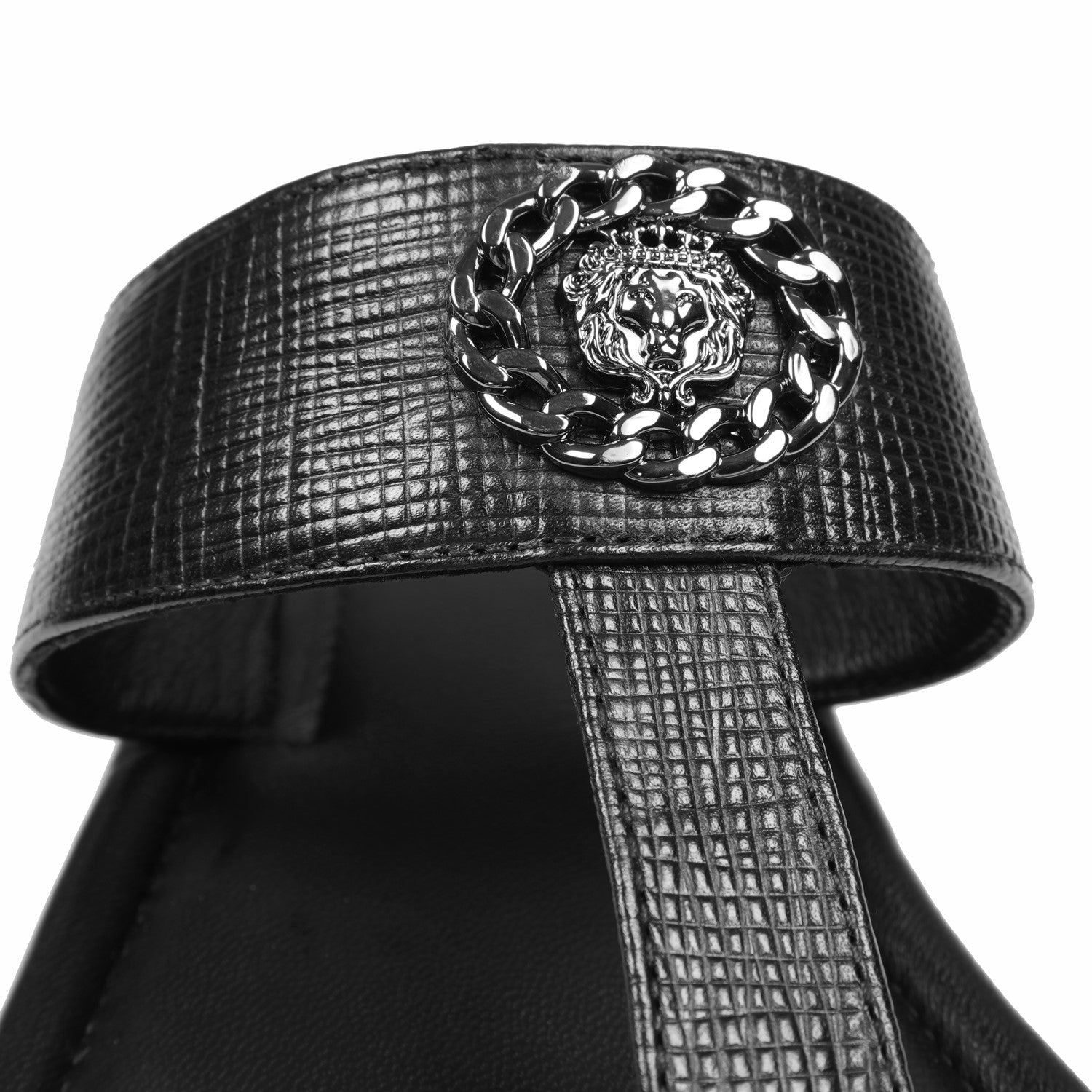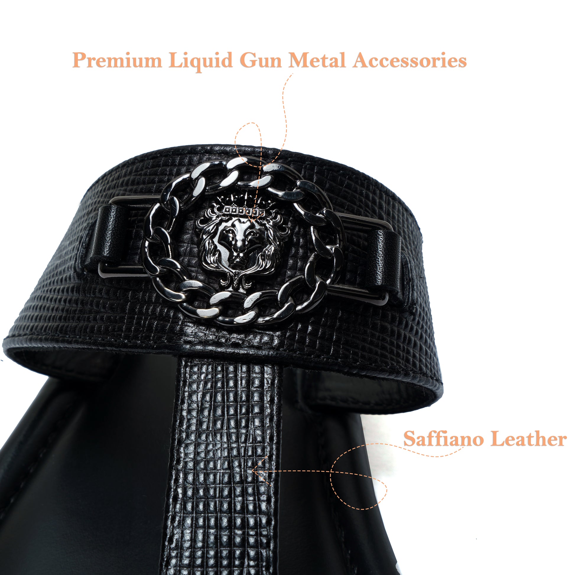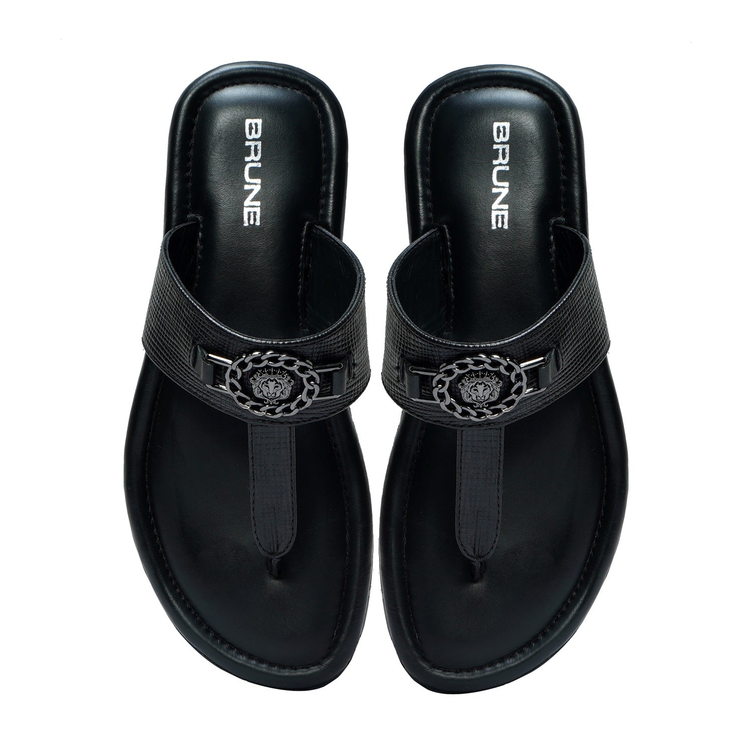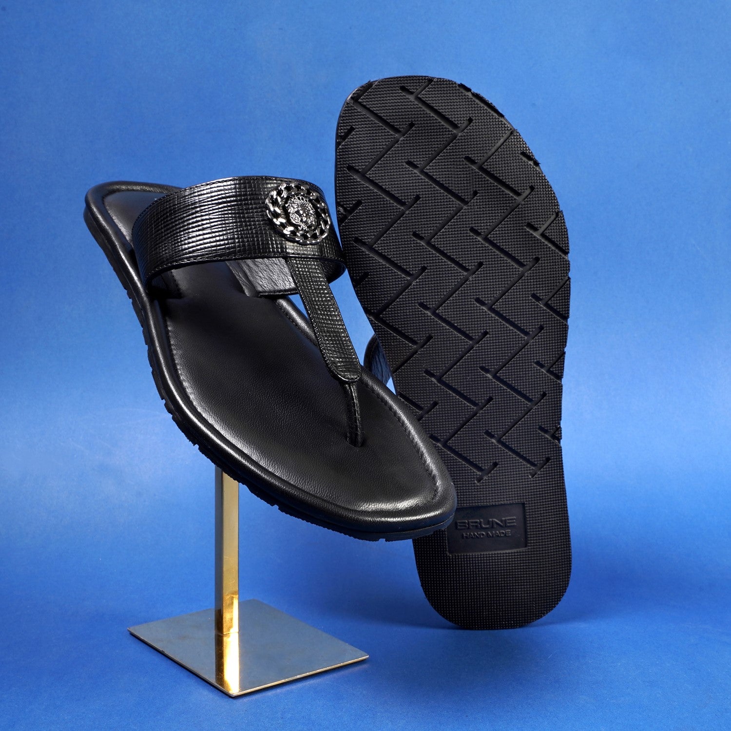 Introducing the ultimate in luxury, the Brune & Bareskin Saffiano T-Strap Black Slide-in Slipper. Hand crafted and hand stitched with exotic saffiano genuine leather, this sleek t-strap slipper exudes sophistication with a gunmetal chain embellishment and trademark lion logo. Enjoy both comfort and style with the super-soft base and rubberized flat sole. Perfect for the fashion-forward man. You can customize this chic boots in any of your favorite color with our bespoke services.