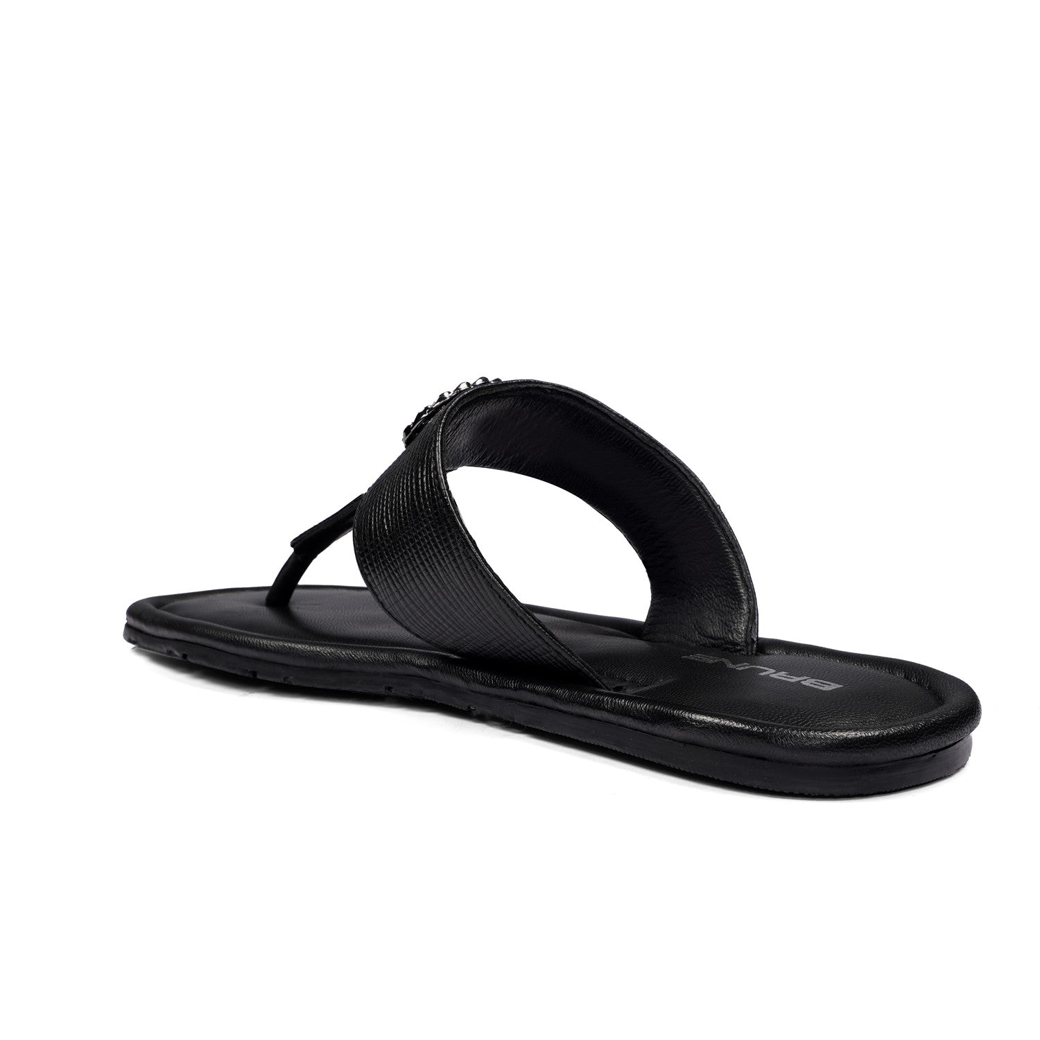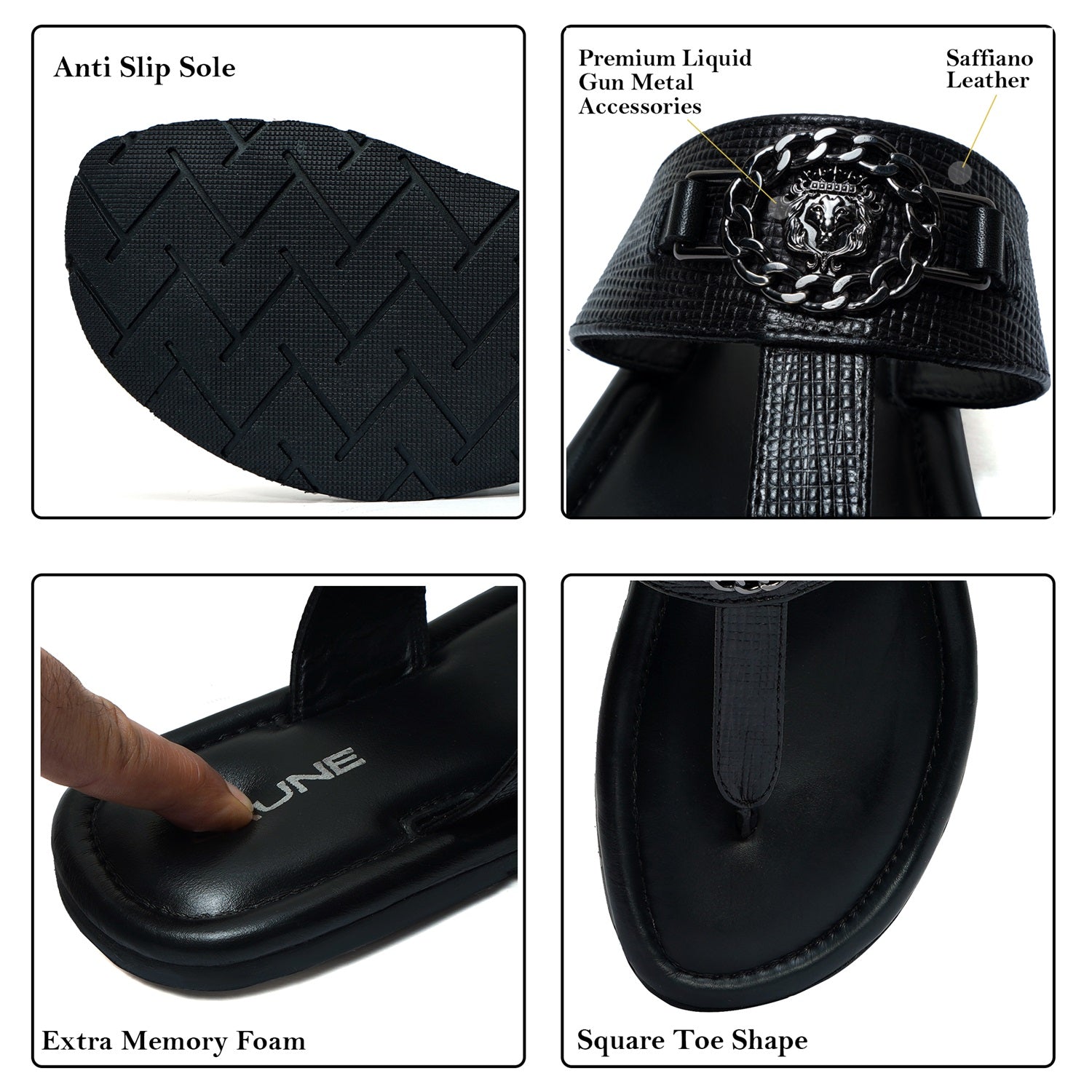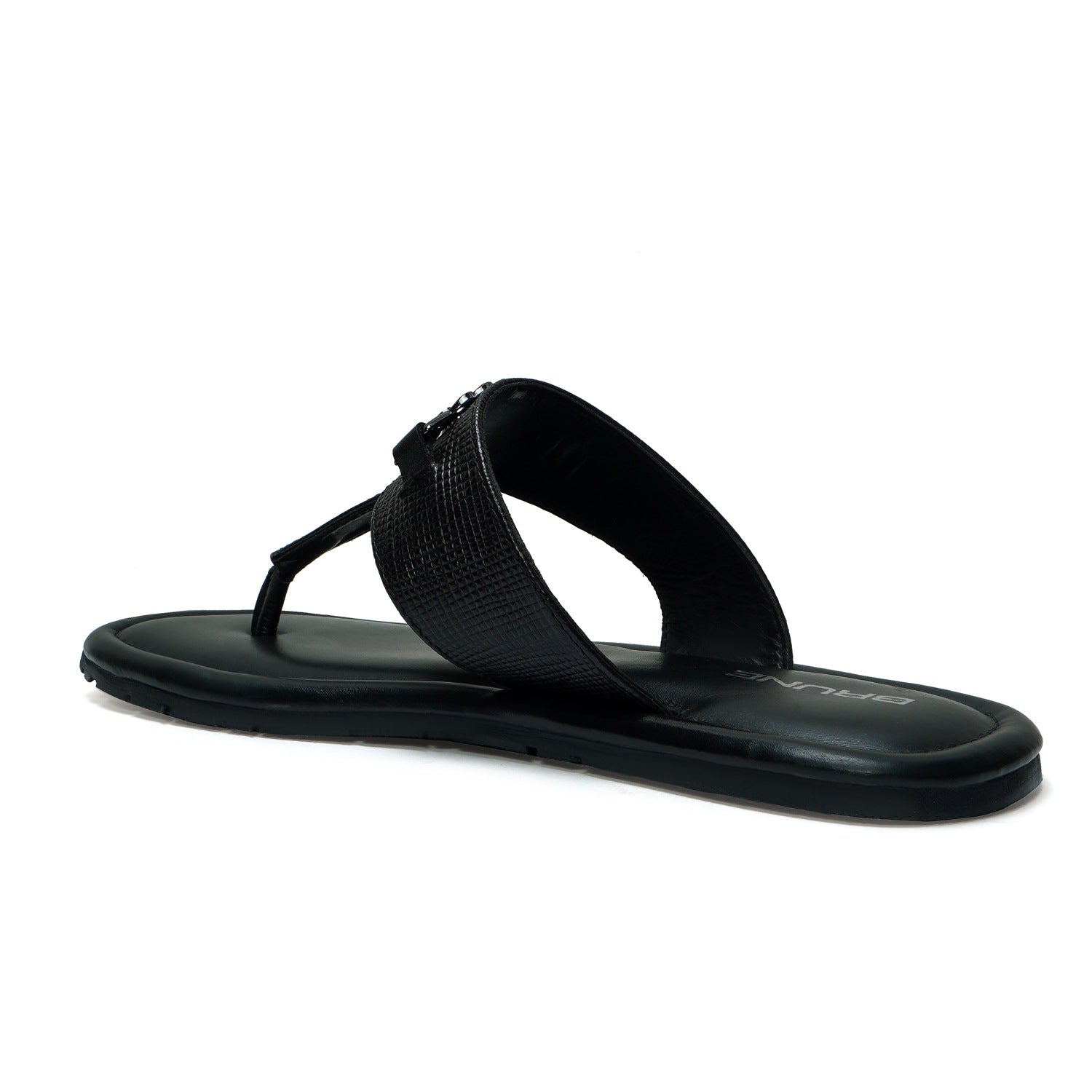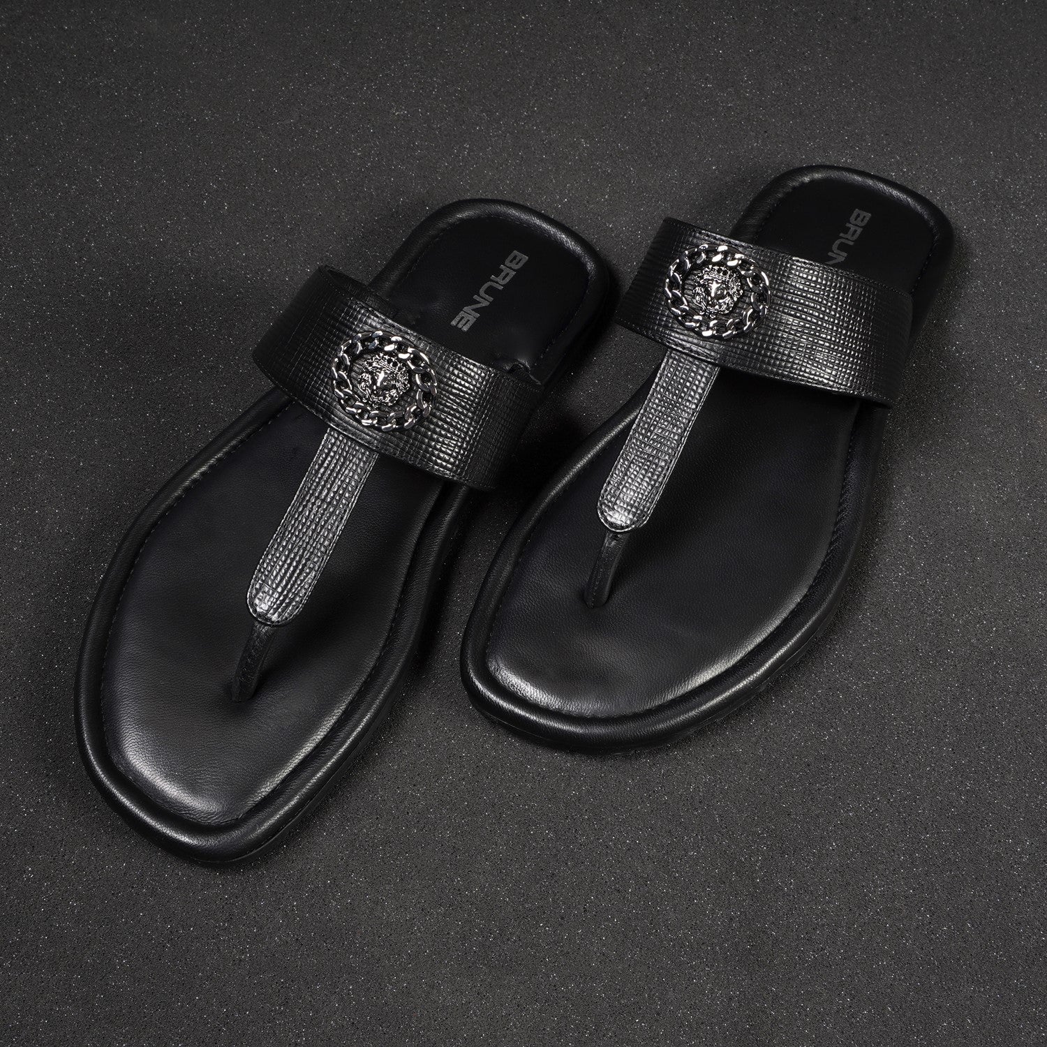 Introducing the ultimate in luxury, the Brune & Bareskin Saffiano T-Strap Black Slide-in Slipper. Hand crafted and hand stitched with exotic saffiano genuine leather, this sleek t-strap slipper exudes sophistication with a gunmetal chain embellishment and trademark lion logo. Enjoy both comfort and style with the super-soft base and rubberized flat sole. Perfect for the fashion-forward man. You can customize this chic boots in any of your favorite color with our bespoke services.
