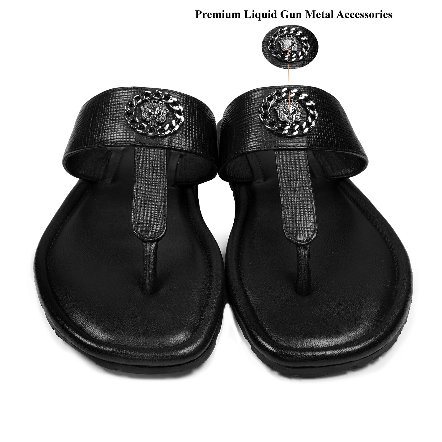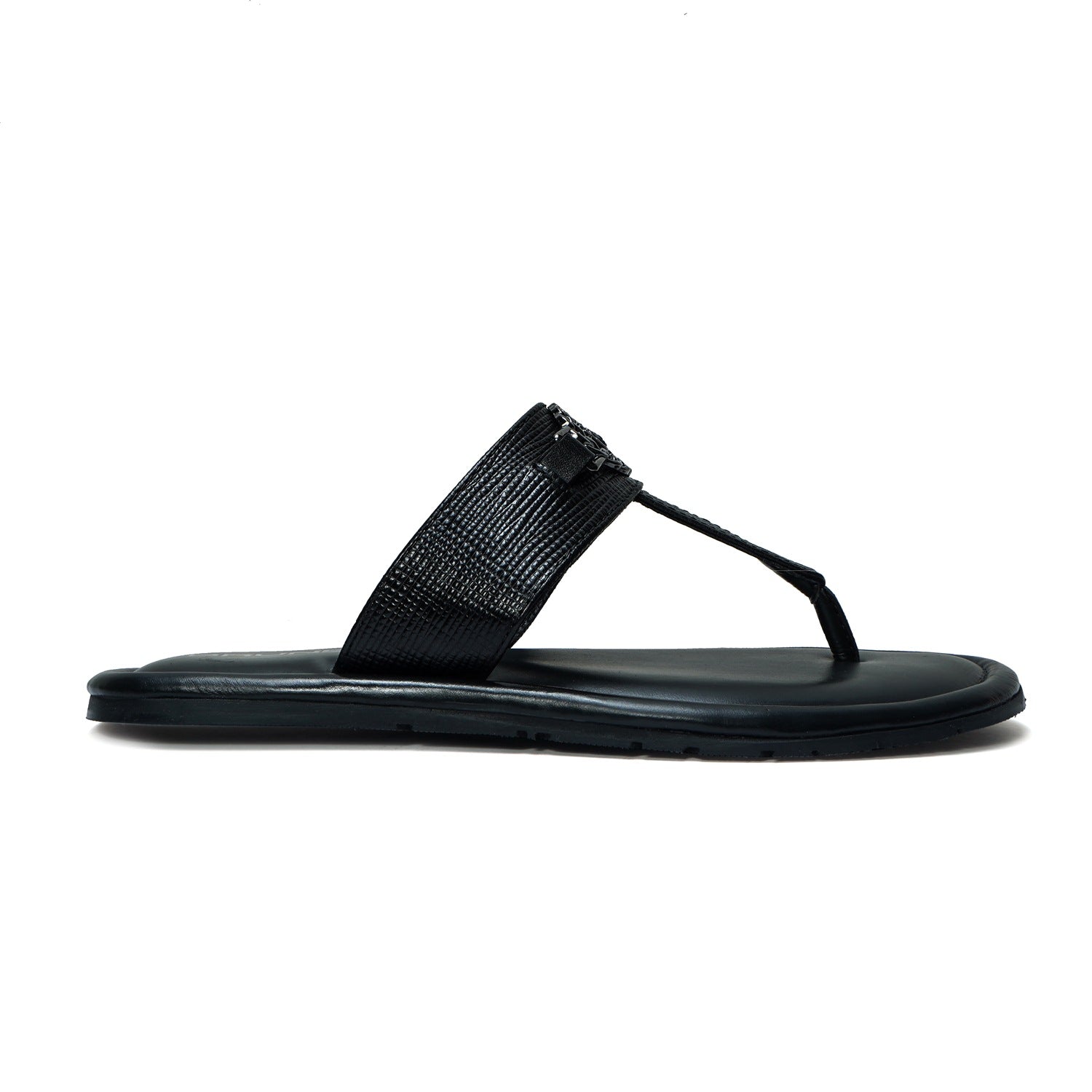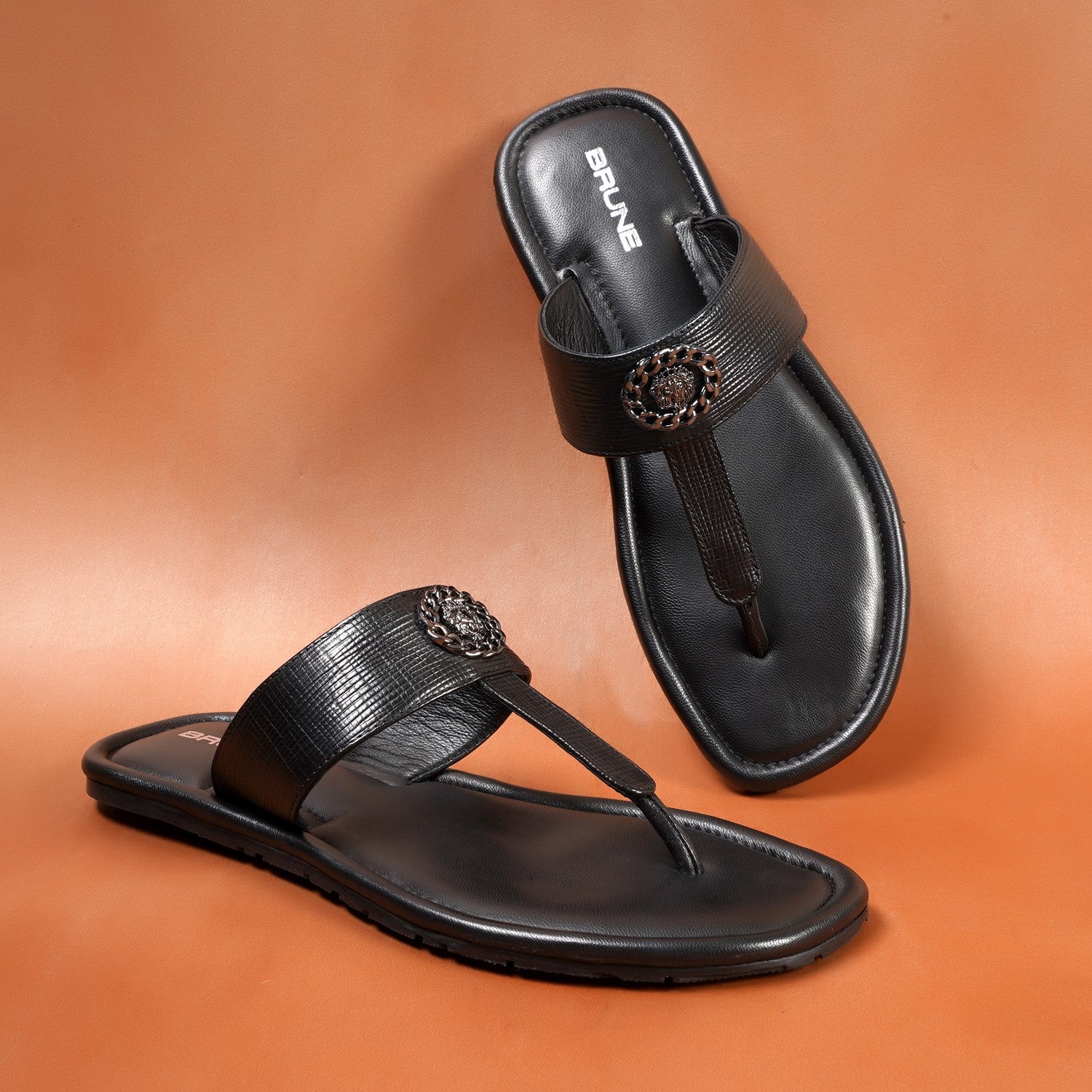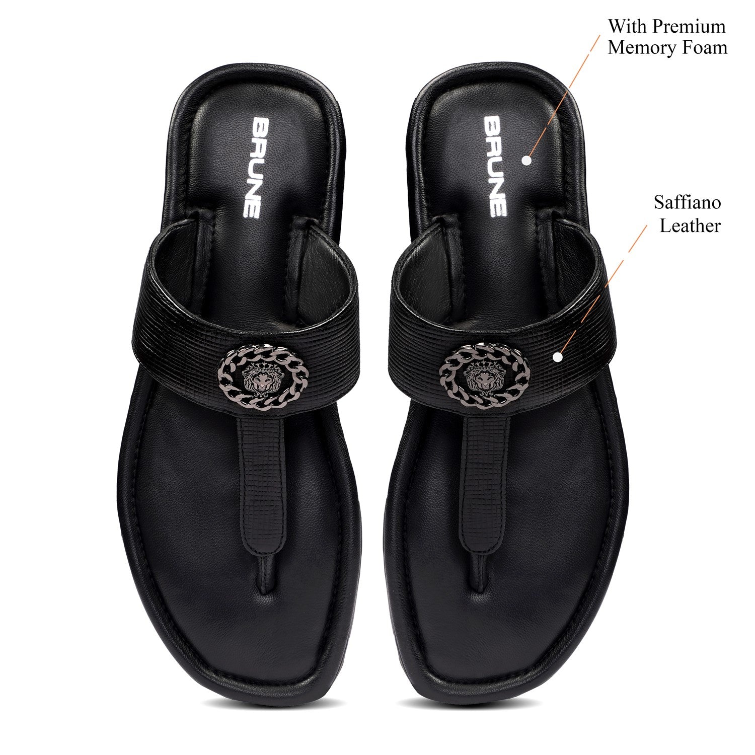 Introducing the ultimate in luxury, the Brune & Bareskin Saffiano T-Strap Black Slide-in Slipper. Hand crafted and hand stitched with exotic saffiano genuine leather, this sleek t-strap slipper exudes sophistication with a gunmetal chain embellishment and trademark lion logo. Enjoy both comfort and style with the super-soft base and rubberized flat sole. Perfect for the fashion-forward man. You can customize this chic boots in any of your favorite color with our bespoke services.